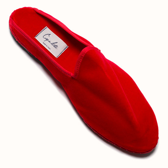 Babouche en velours rouge coquelicot et gros-grain ton sur ton