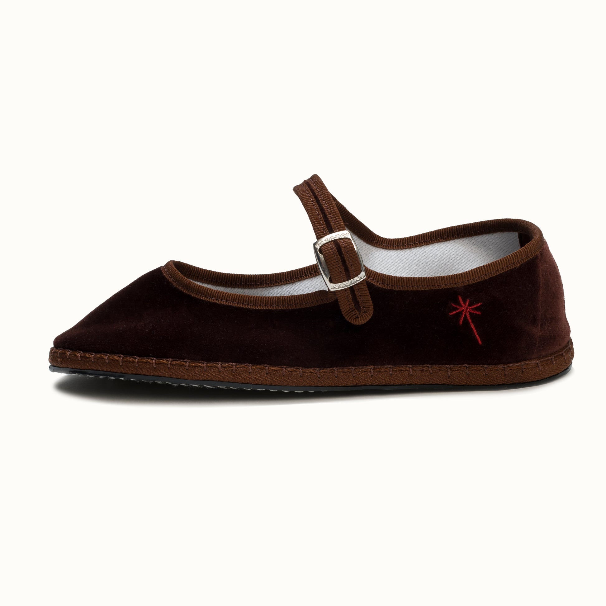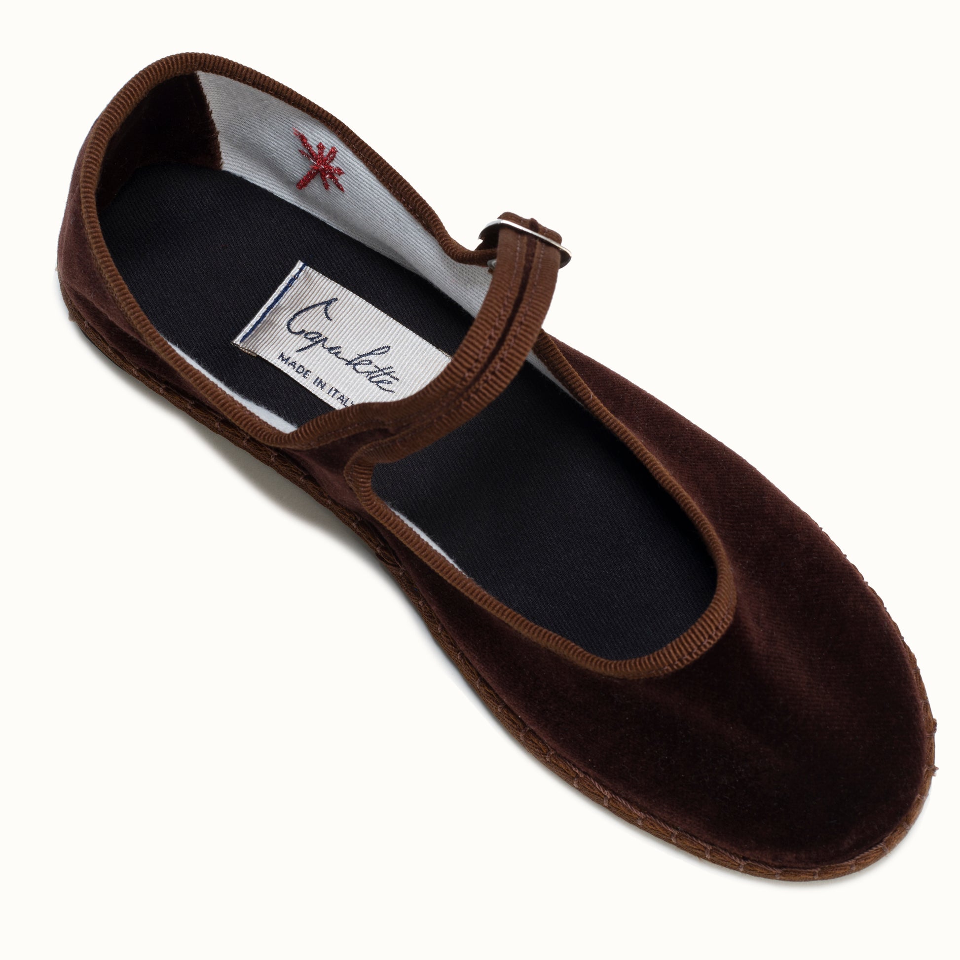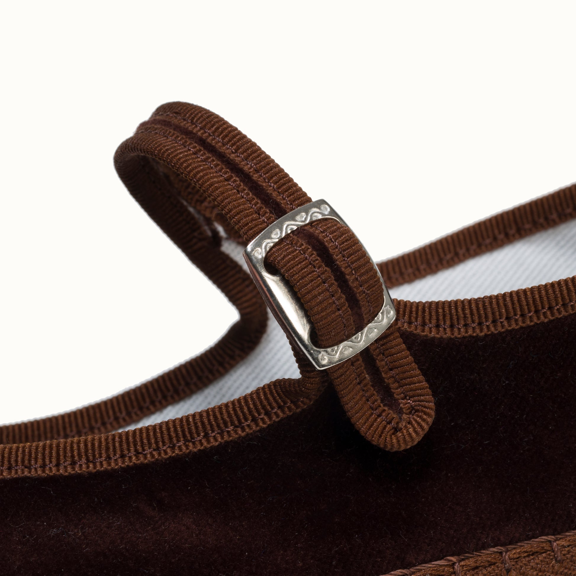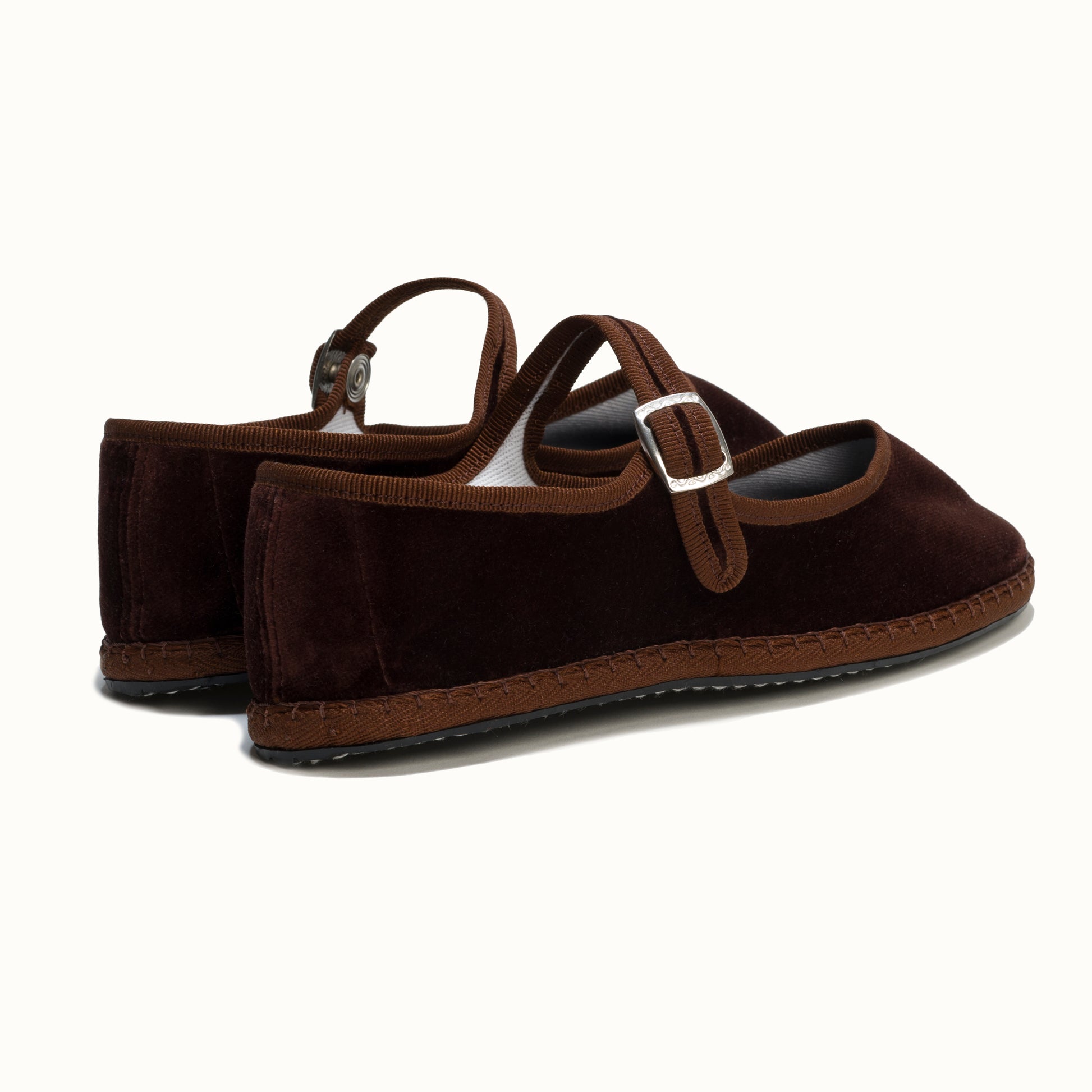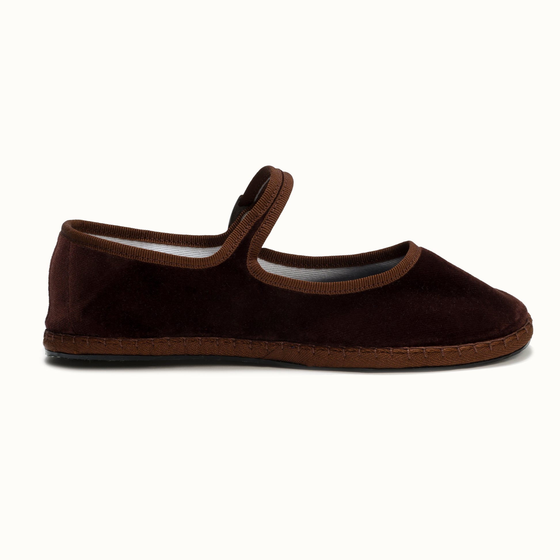 Mary-Jane en velours brun chocolat et rebords en gros grain ton sur ton.