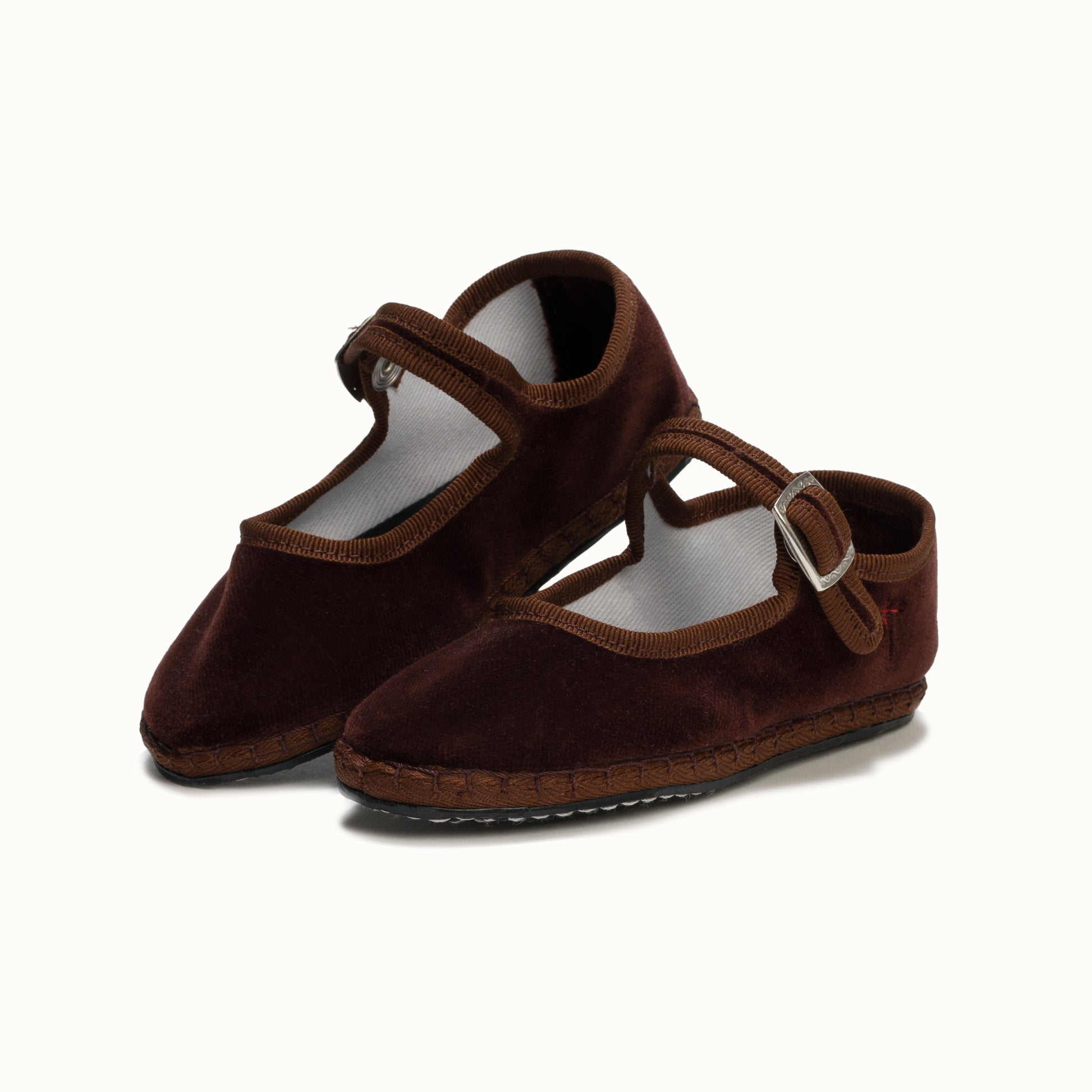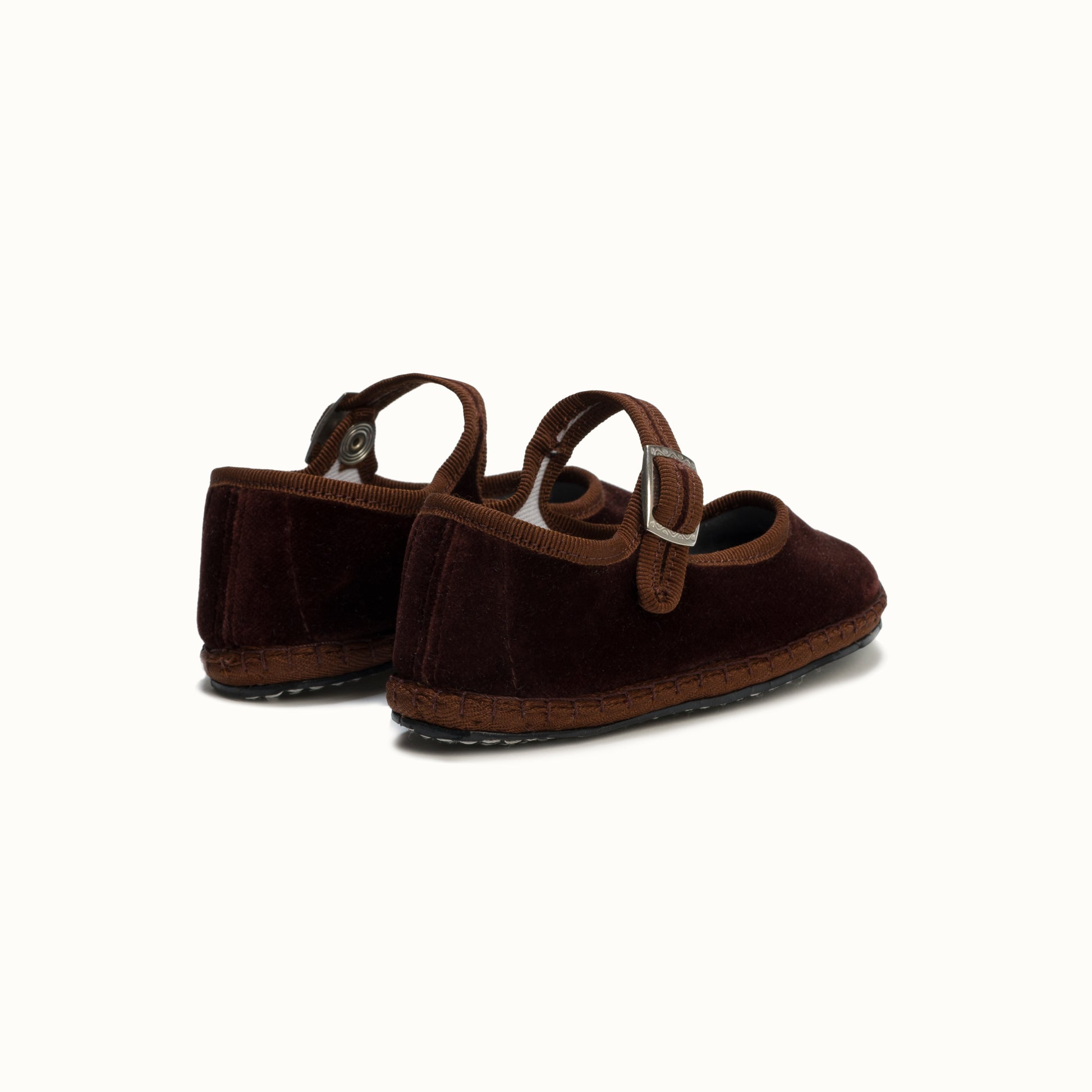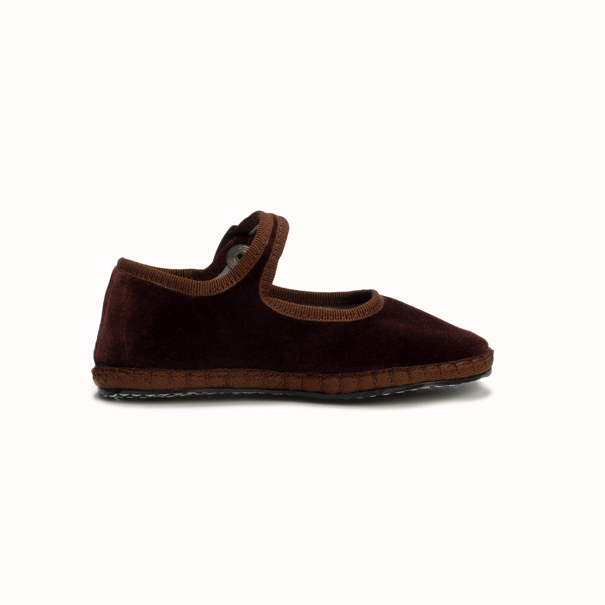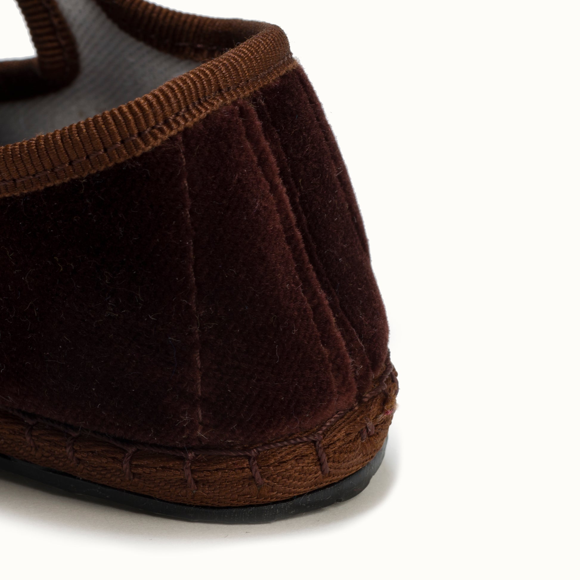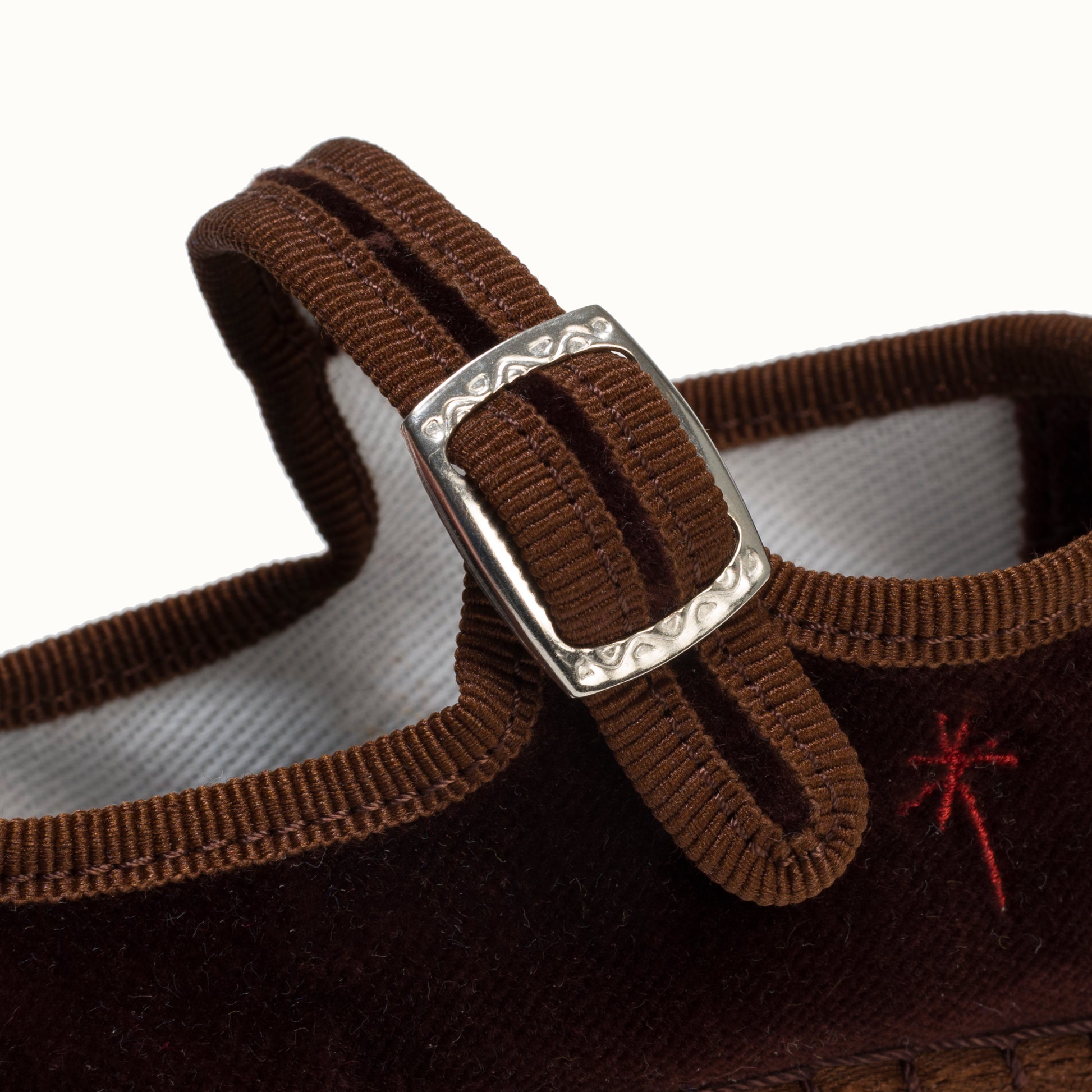 Mary-Jane en velours brun chocolat et rebords en gros grain ton sur ton.