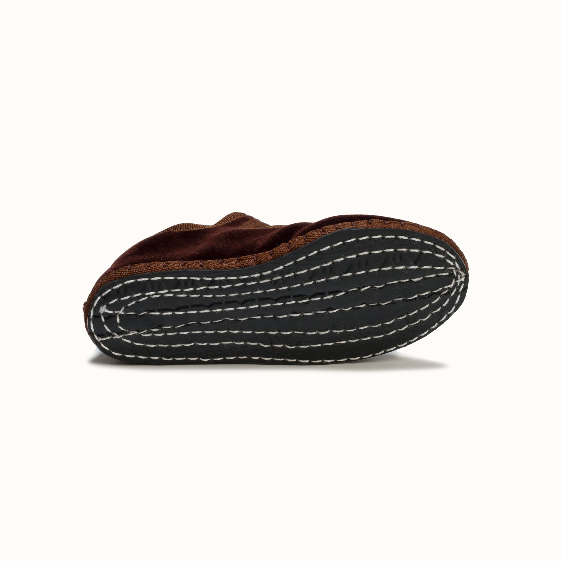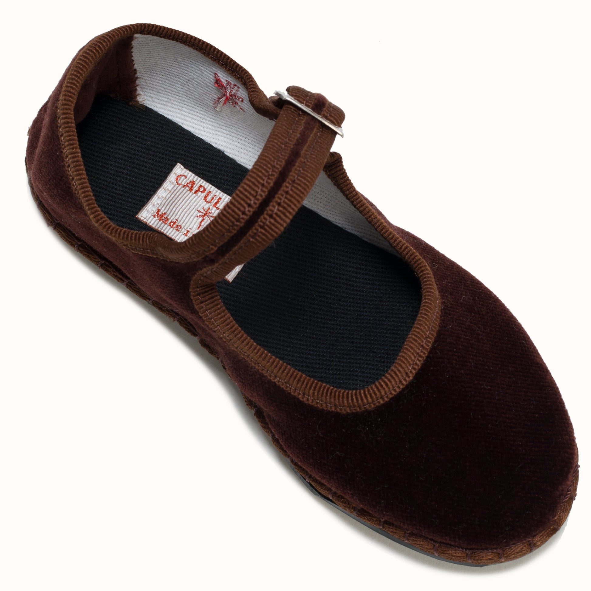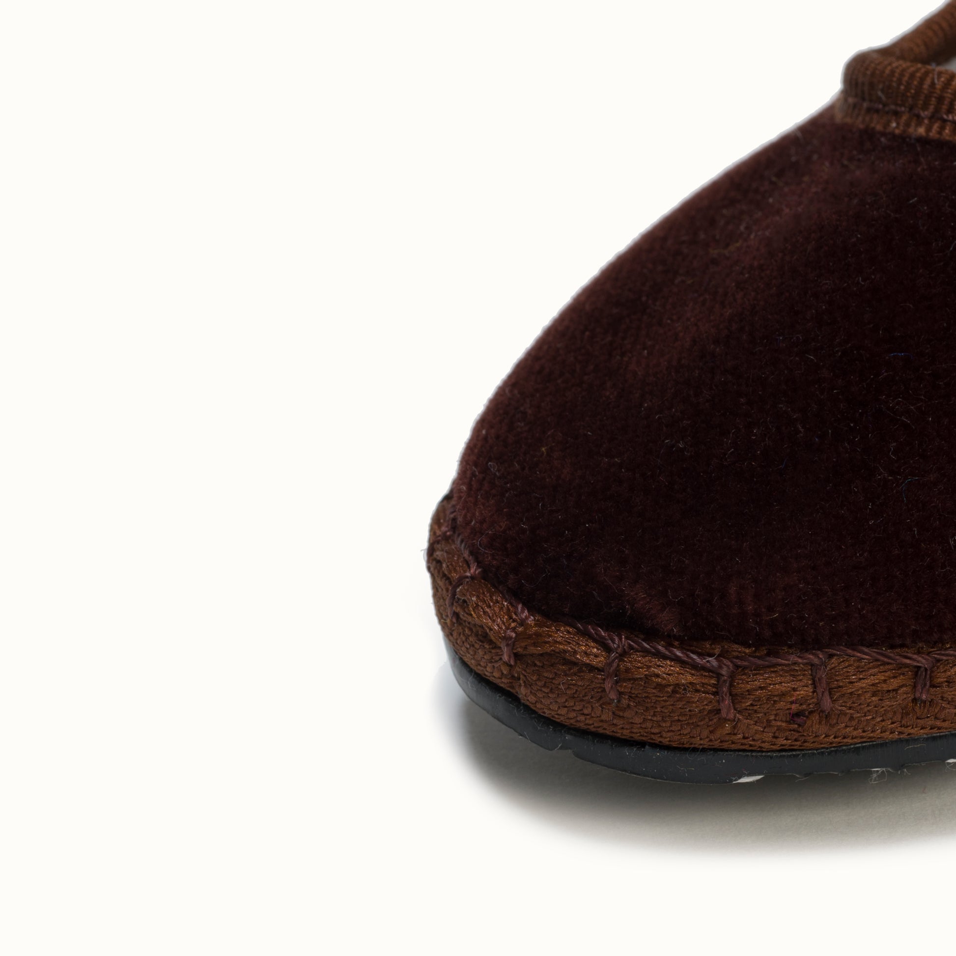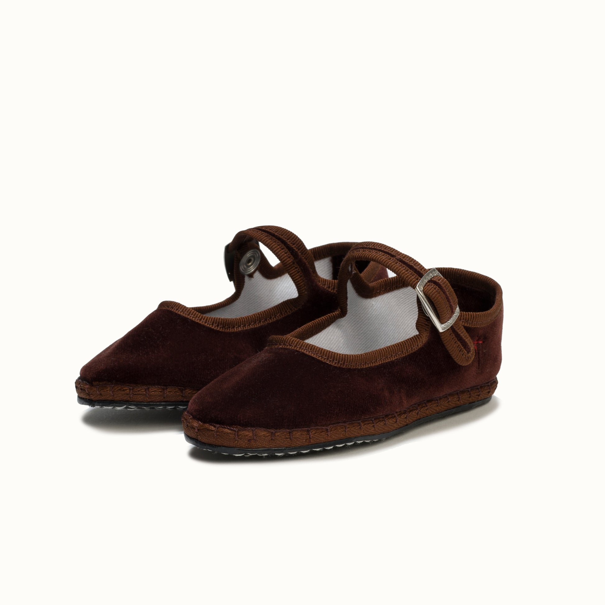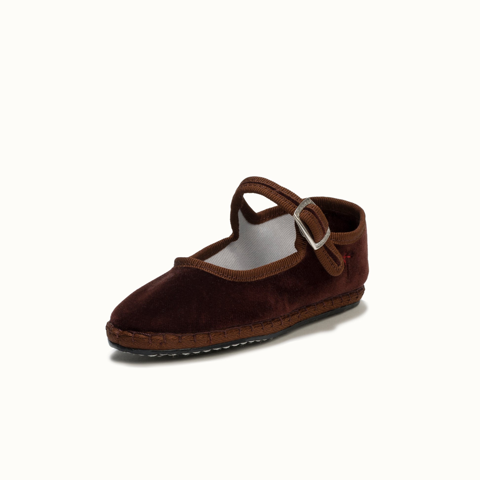 Mary-Jane en velours brun chocolat et rebords en gros grain ton sur ton.
