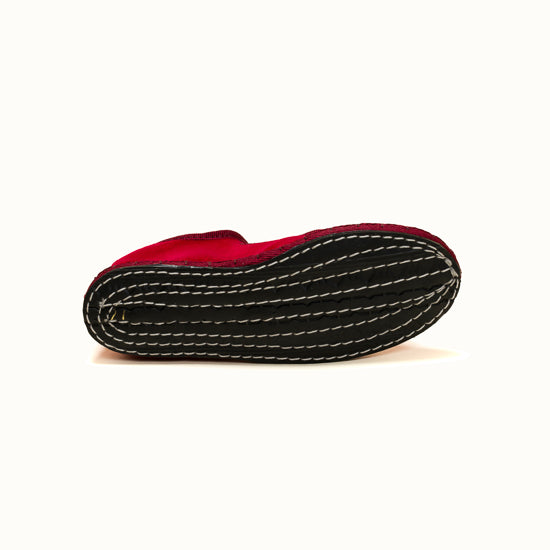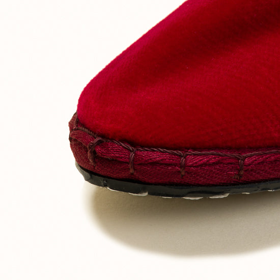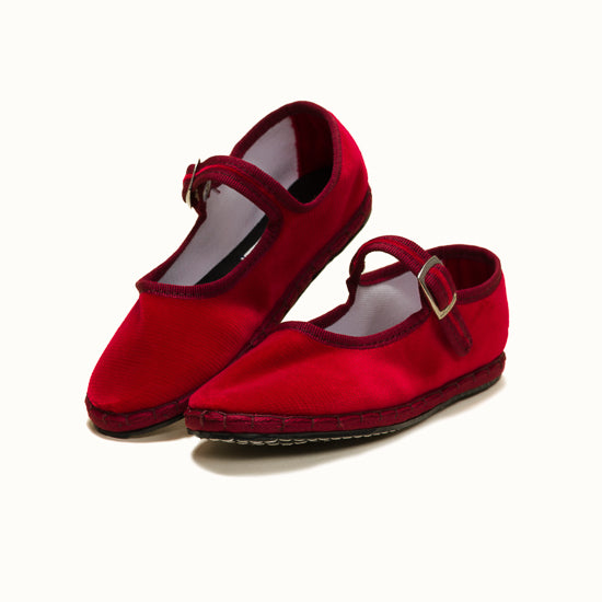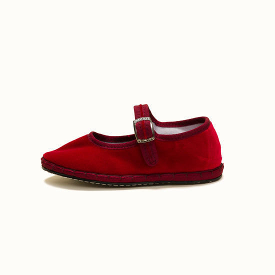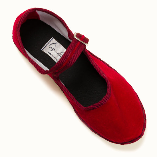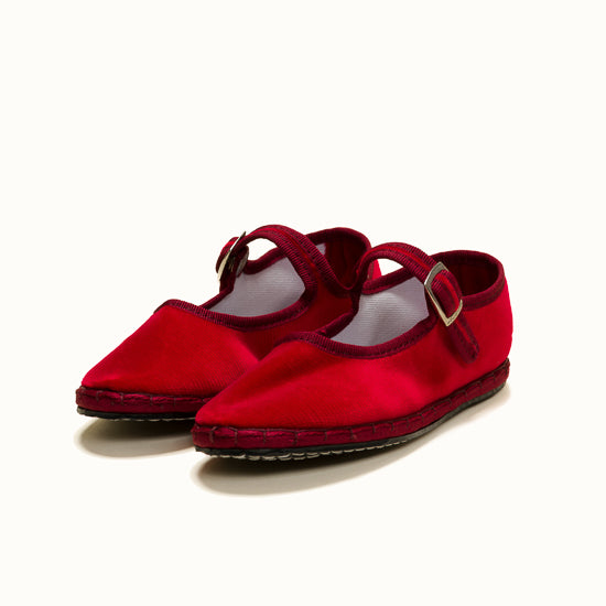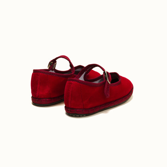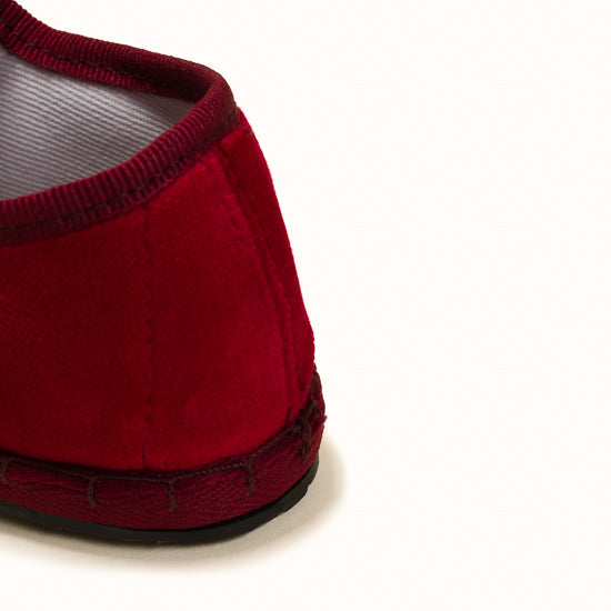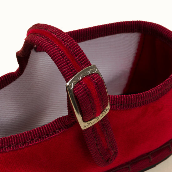 Mary-Jane en velours rouge cerise et rebords en gros grain rouge foncé.