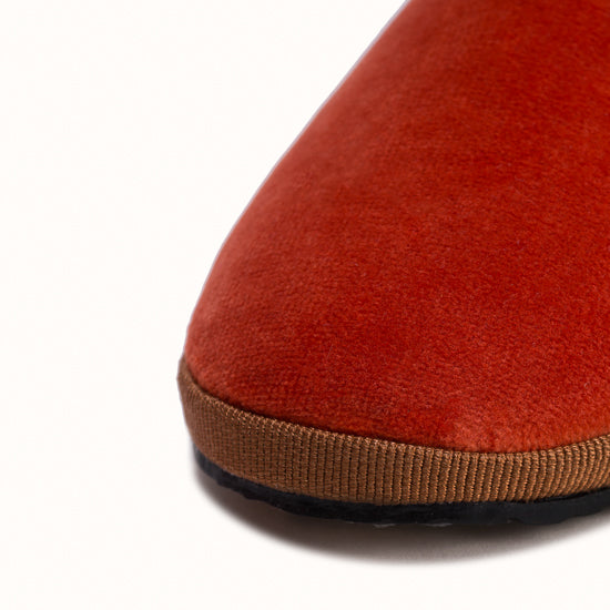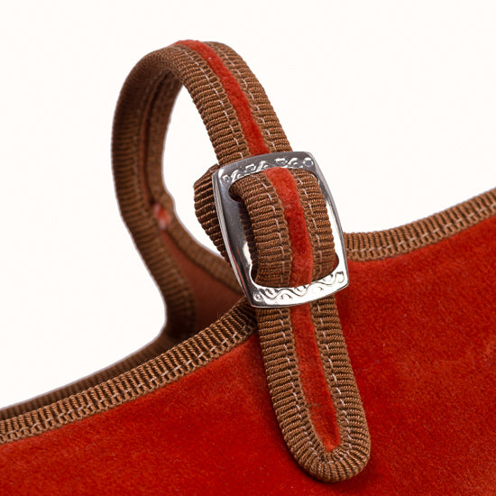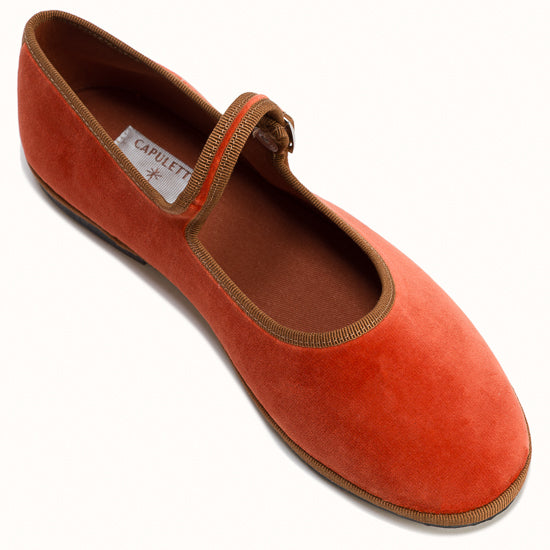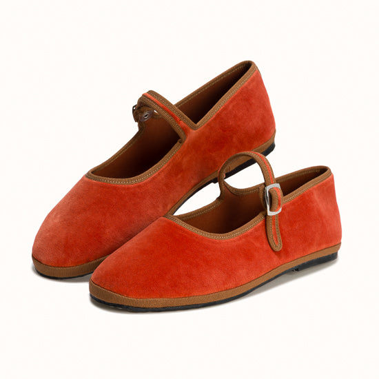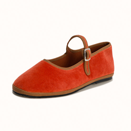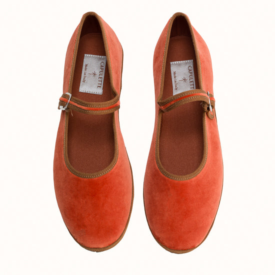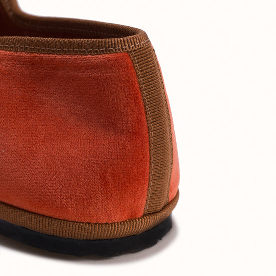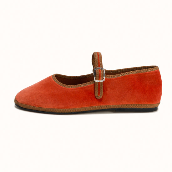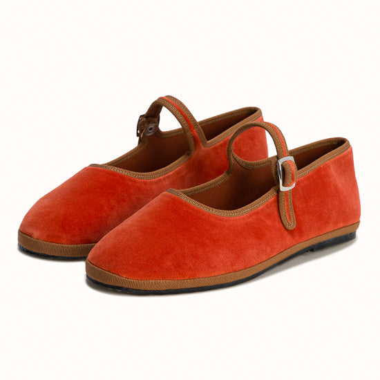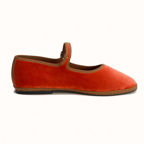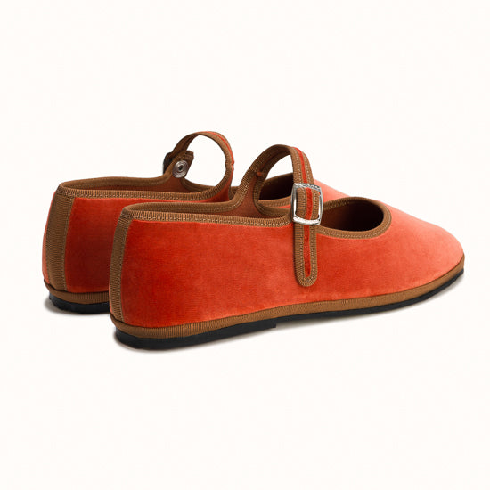 Mary-Jane en velours orange brique et rebords en gros grain camel.