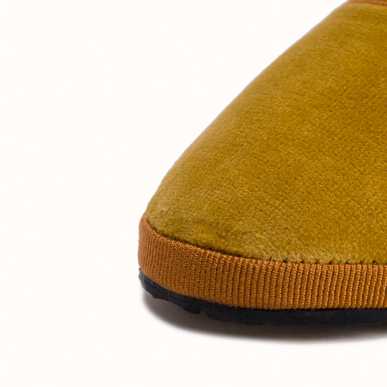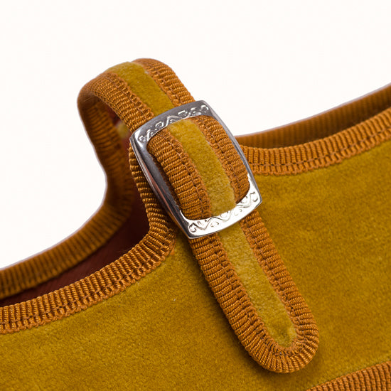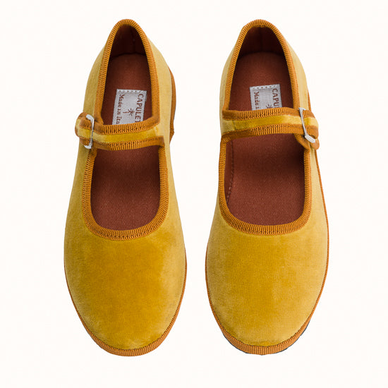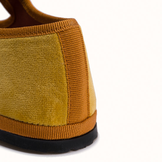Mary-Jane en velours jaune safran et rebords en gros grain ambre.