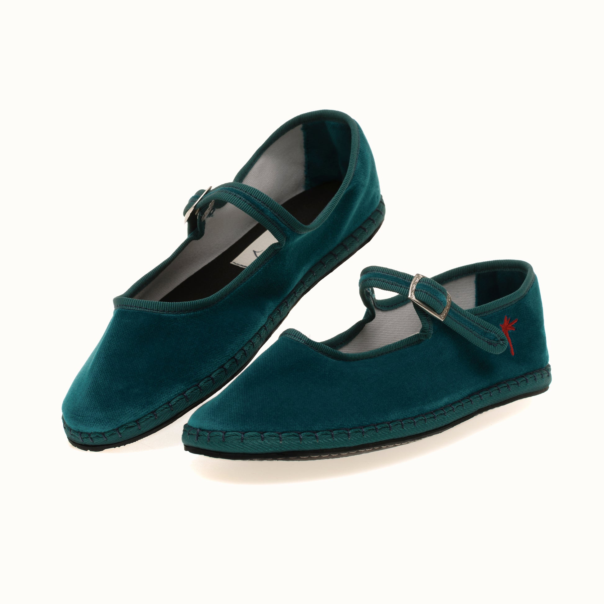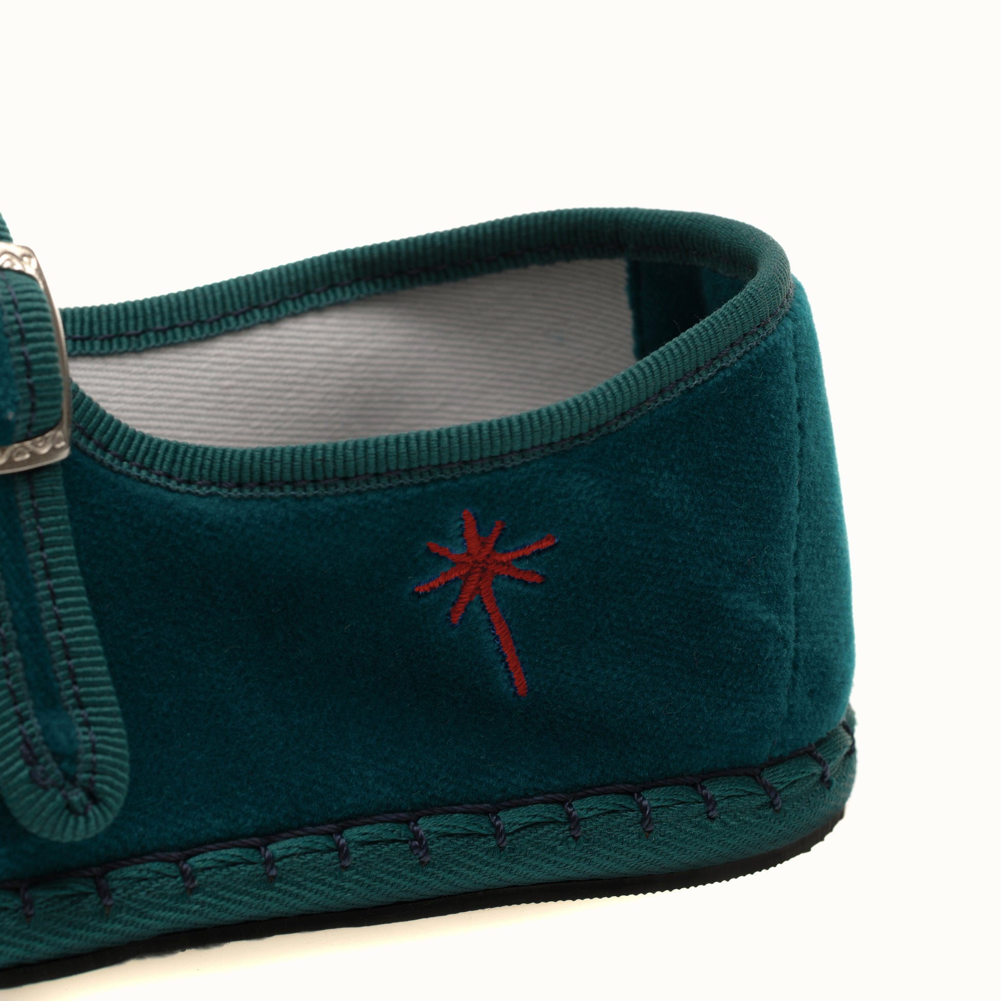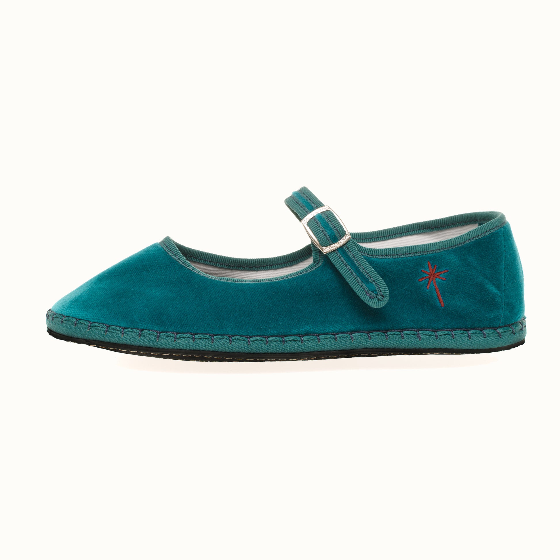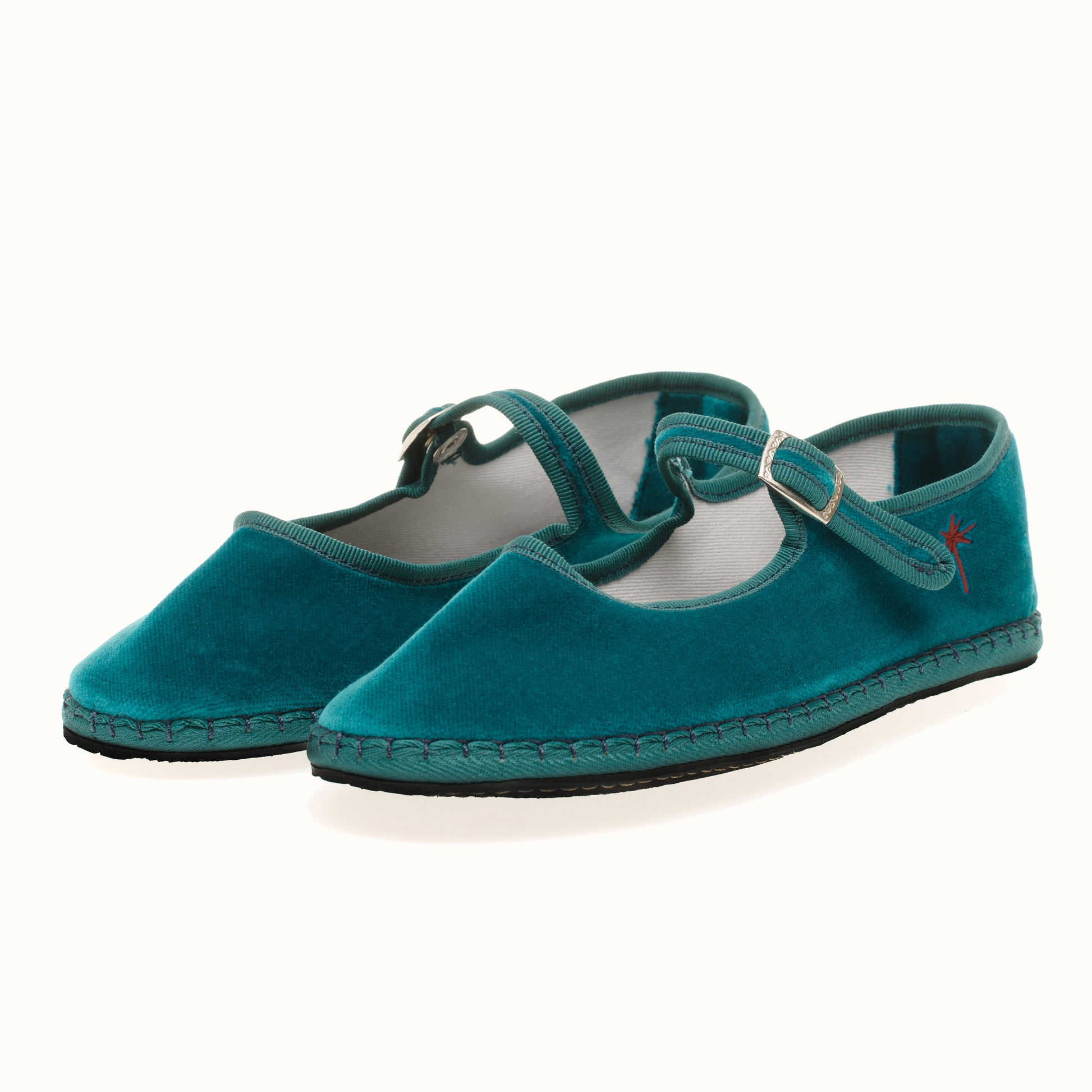 Mary-Jane en velours rouge bleu lagoon et rebords en gros grain ton sur ton.