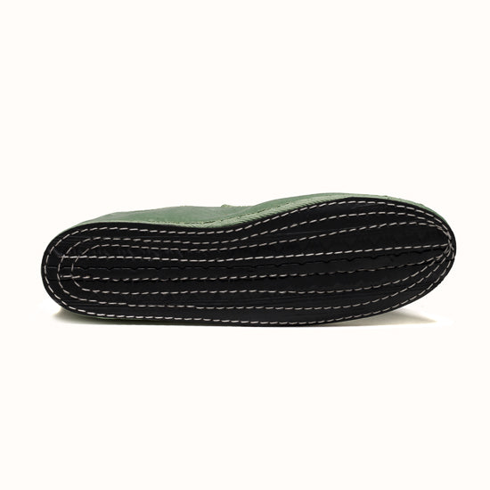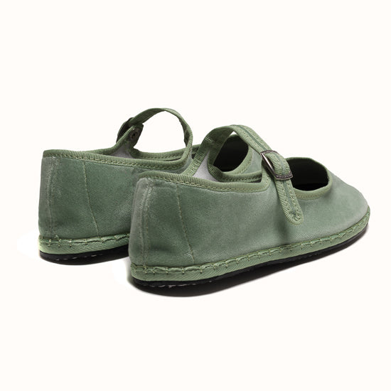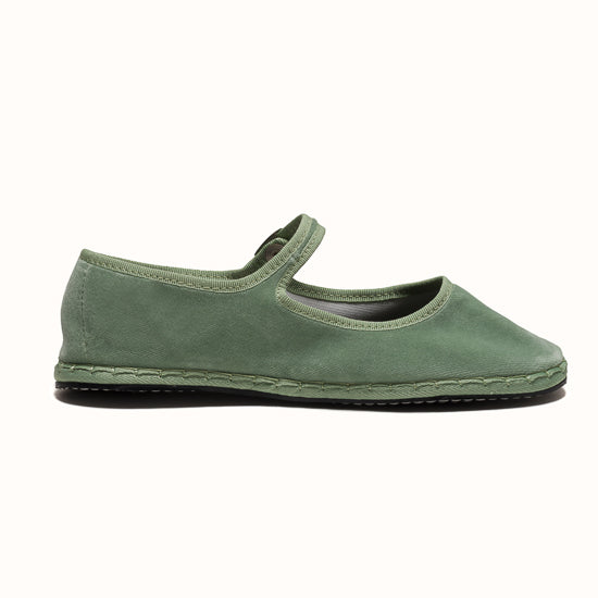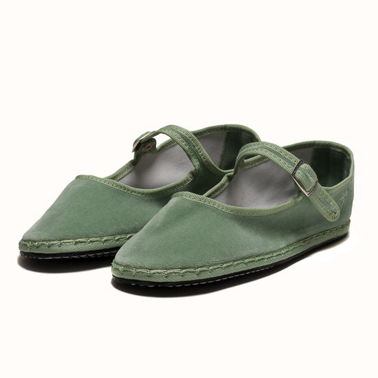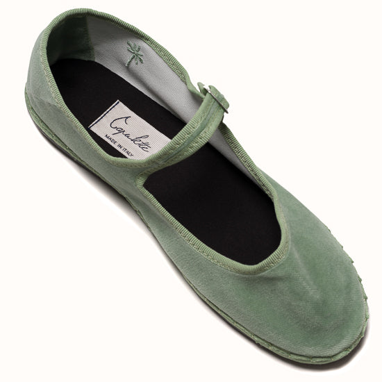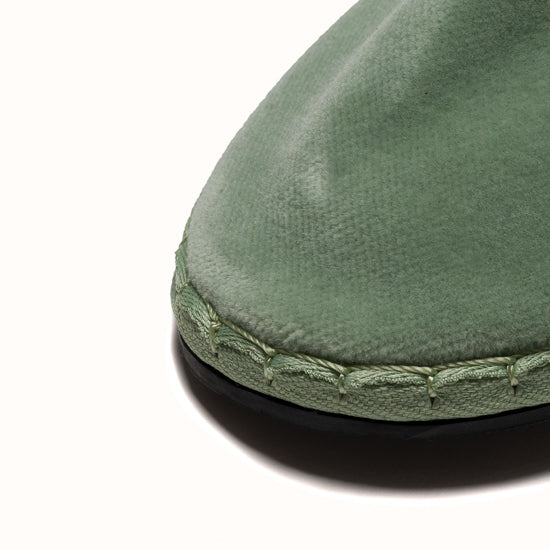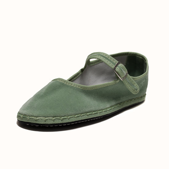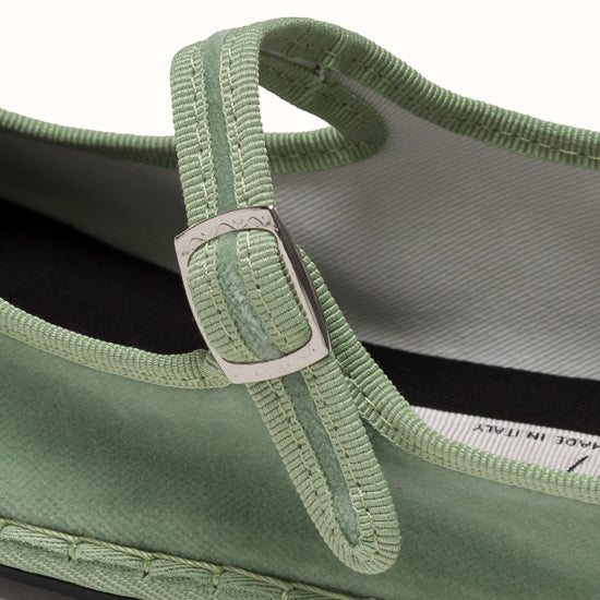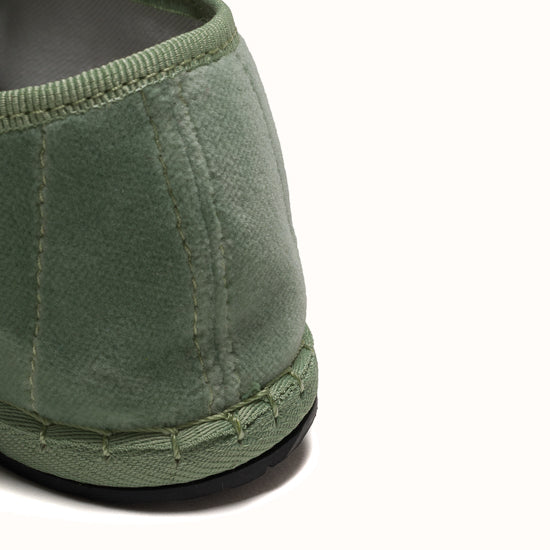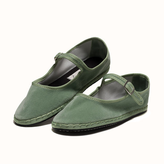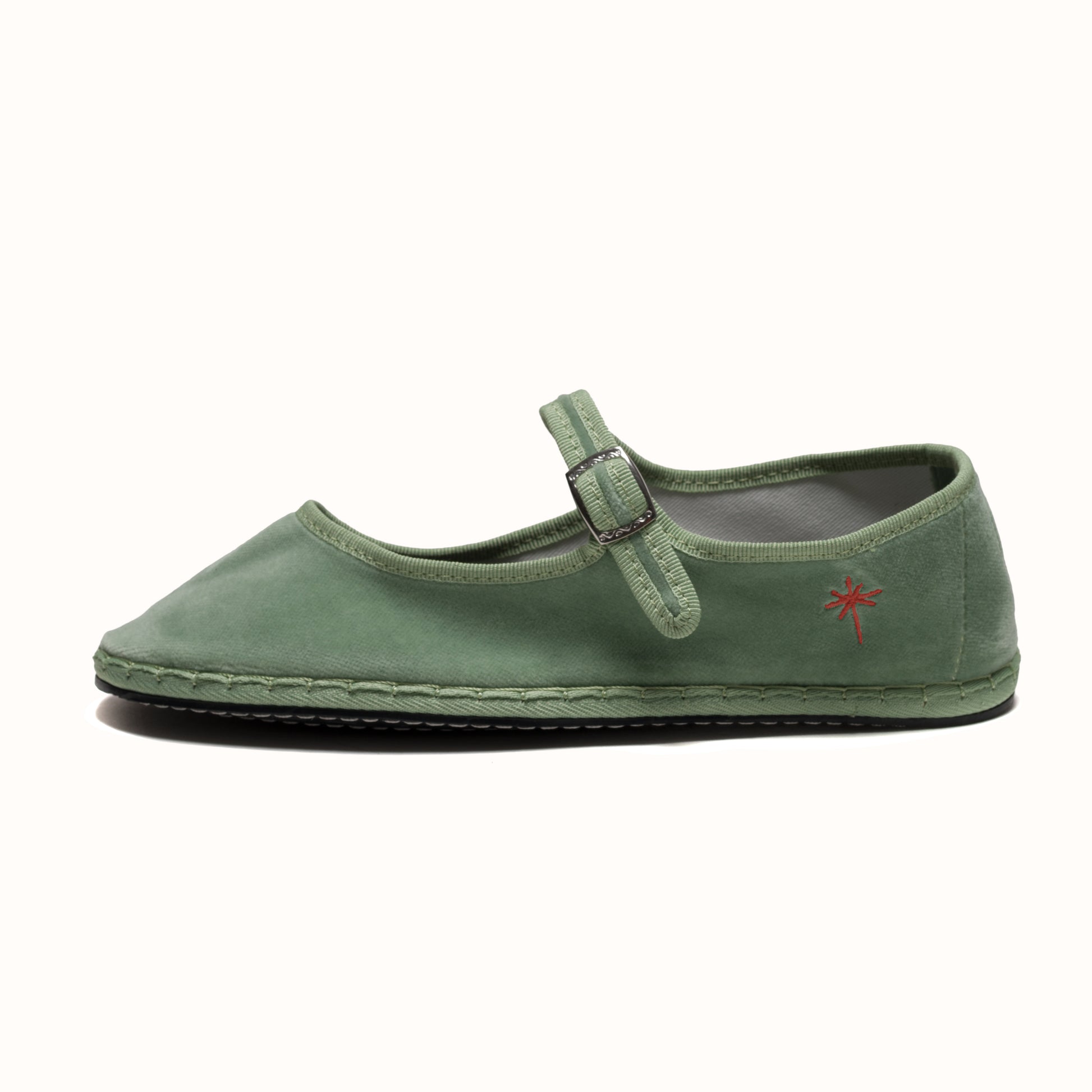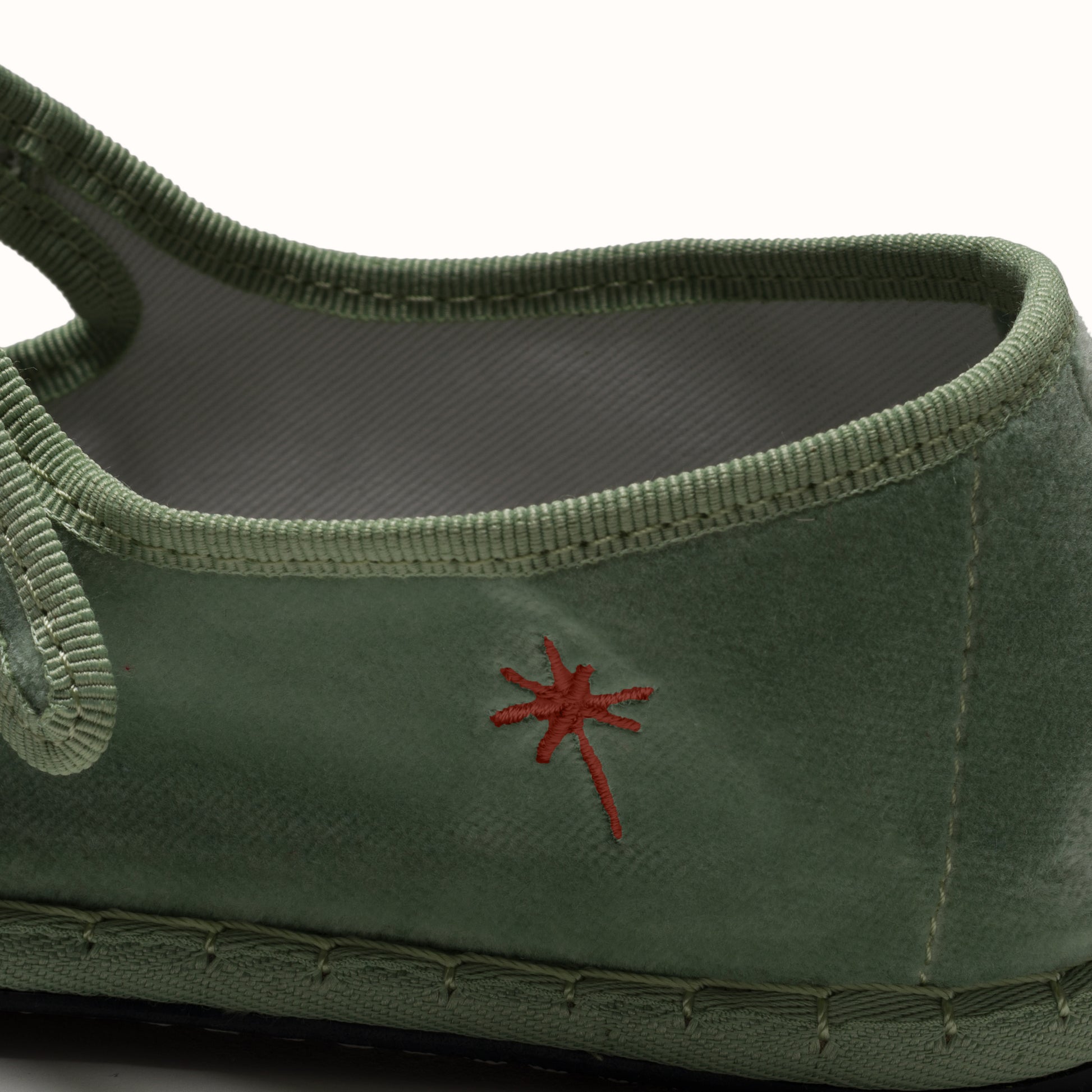 Mary-Jane en velours rouge céladon et rebords en gros grain ton sur ton.