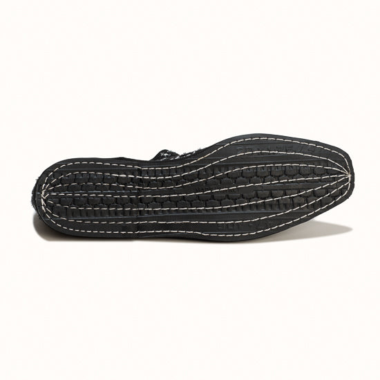 La semelle intérieure est en coton noir et et la semelle extérieure est en traditionnel pneu de vélo.