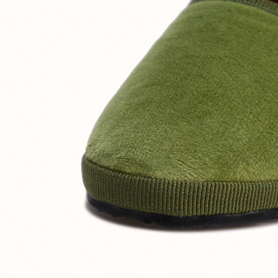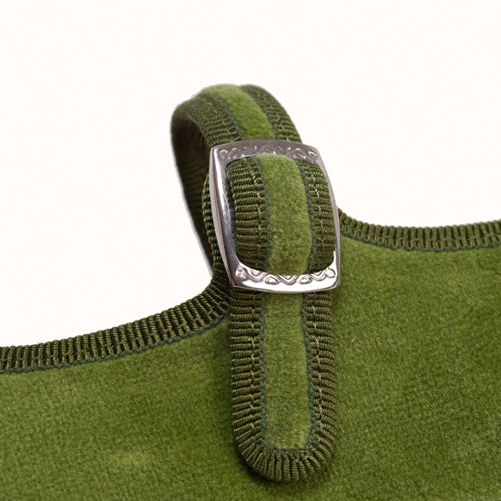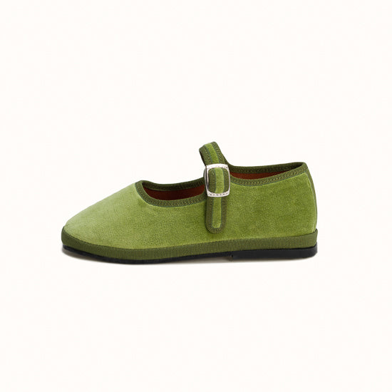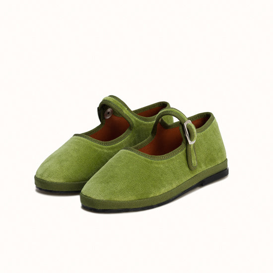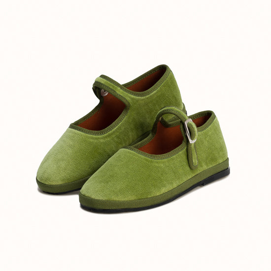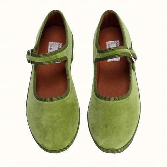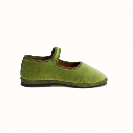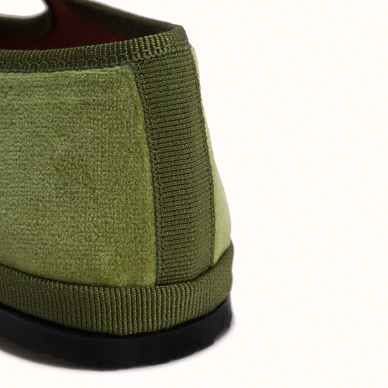 Mary-Jane en velours vert amande et rebords en gros grain ton sur ton.