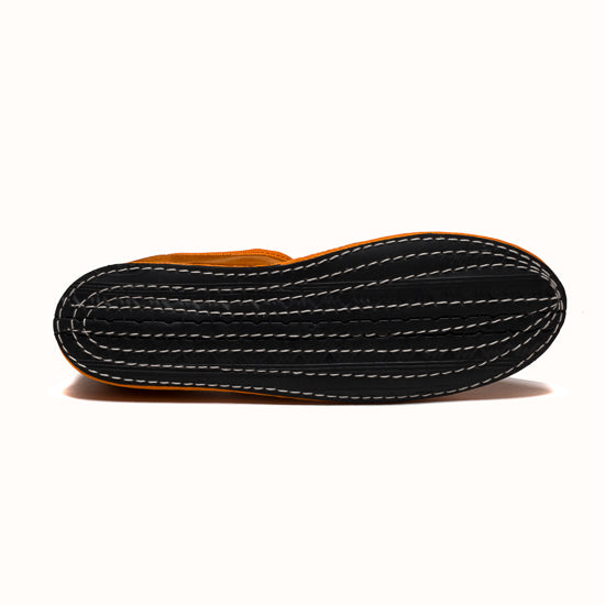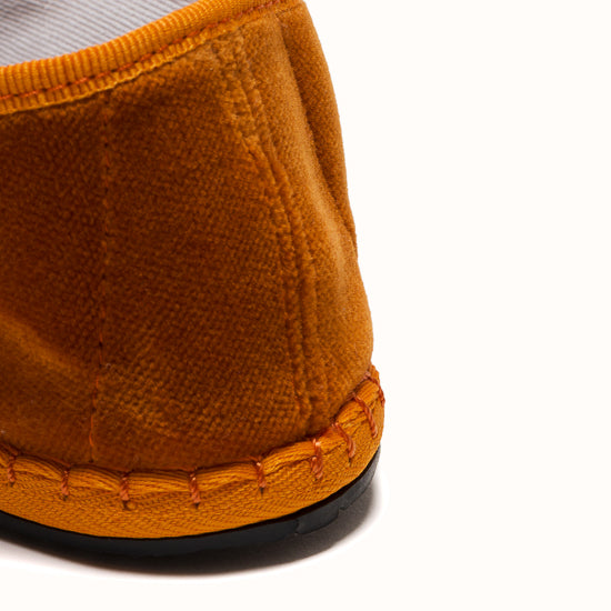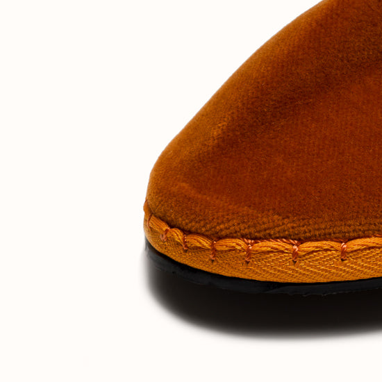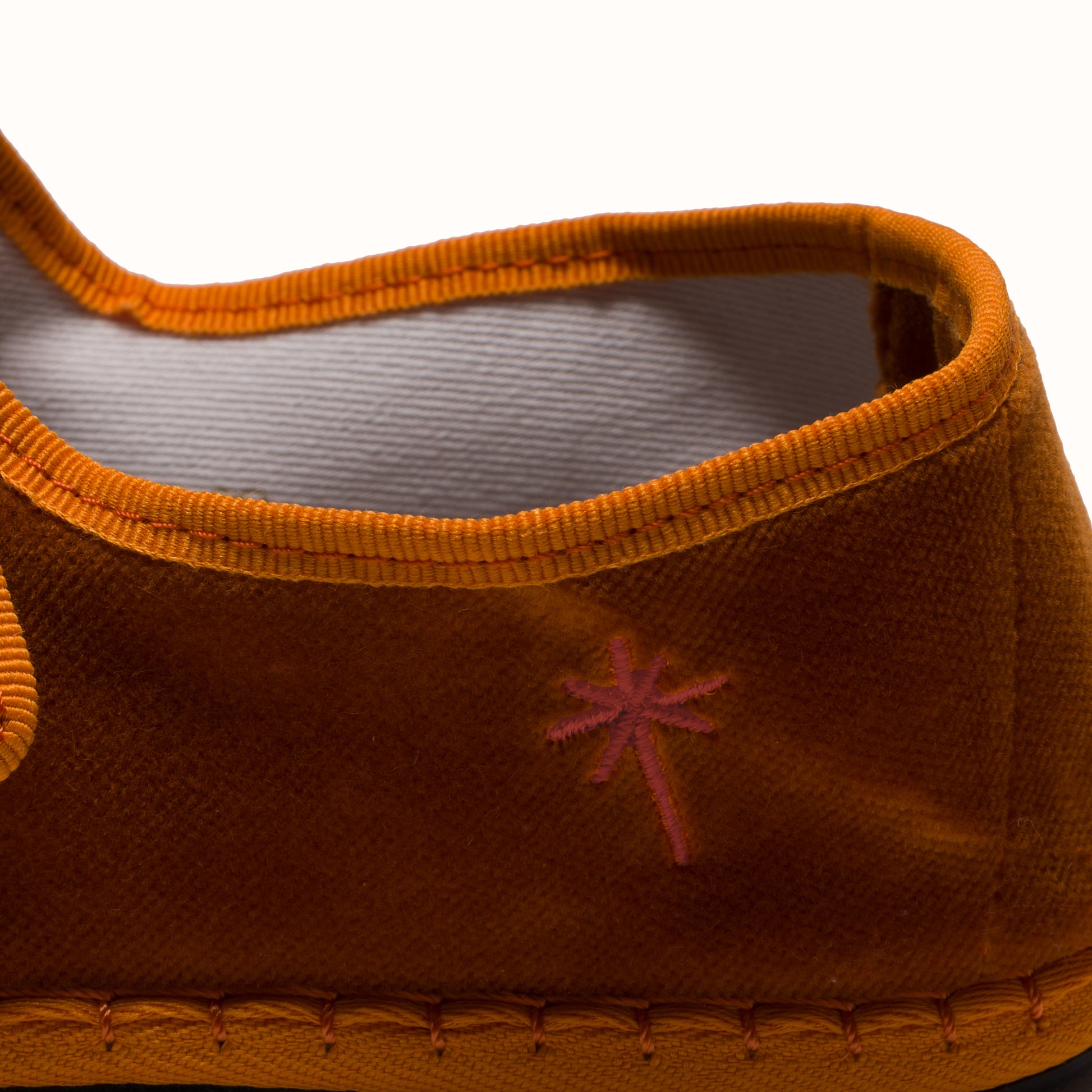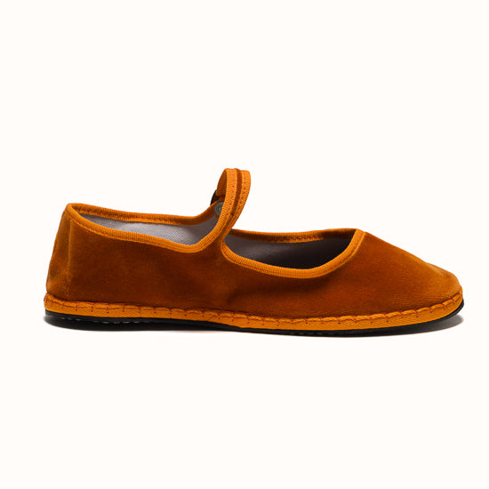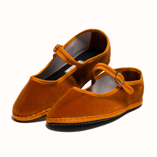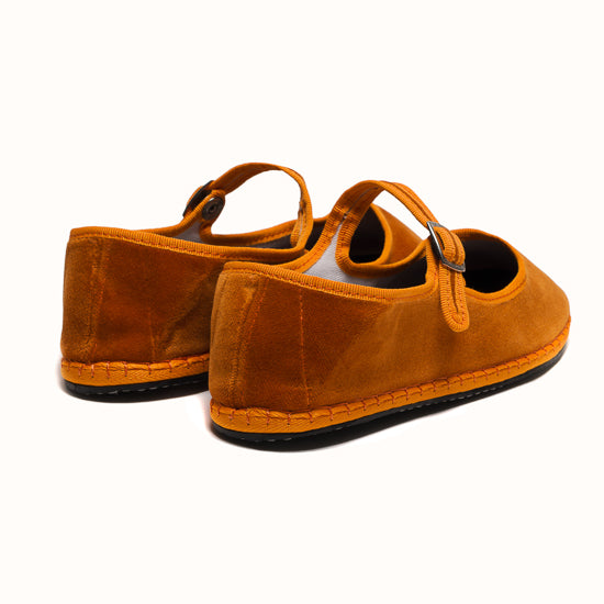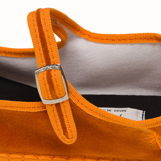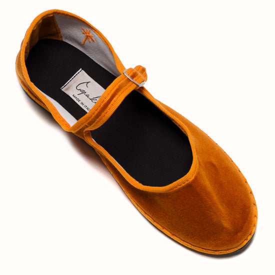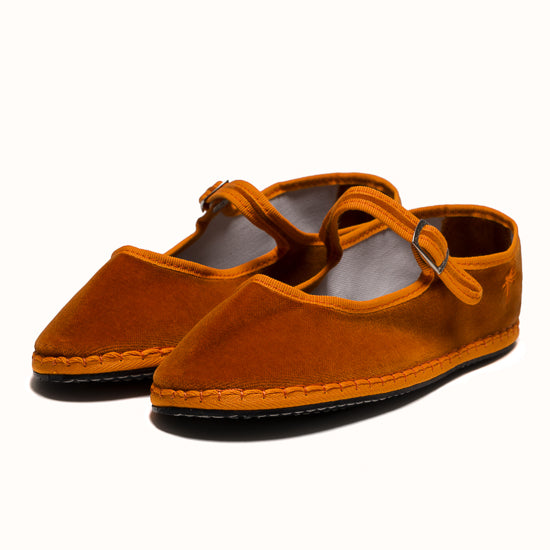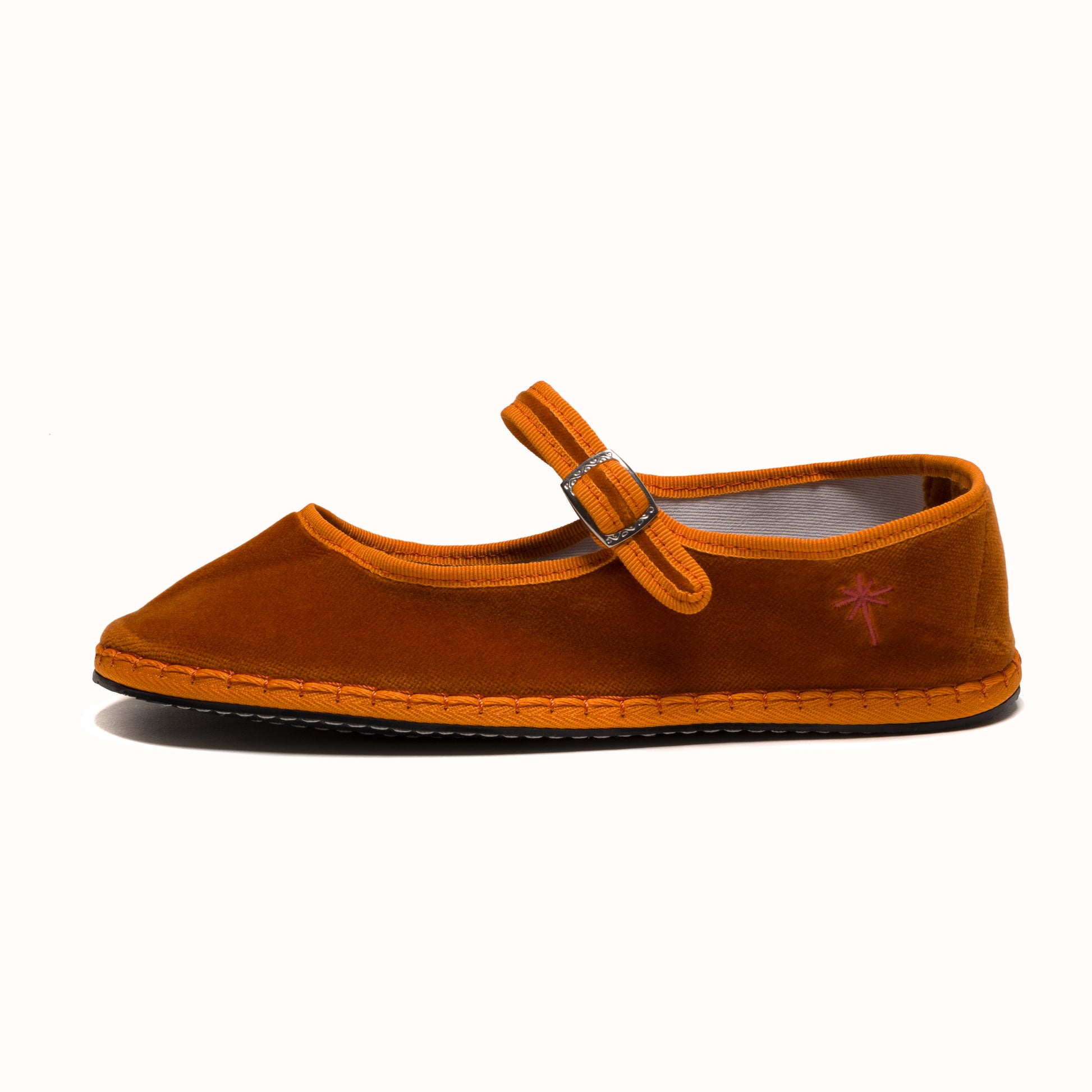 Mary-Jane en velours orange et rebords en gros grain orange clair.