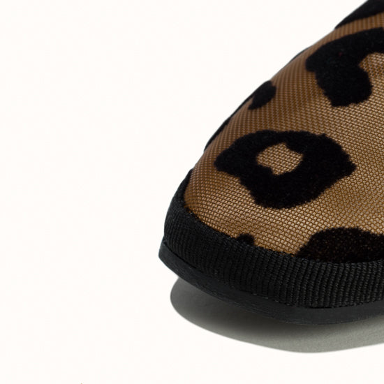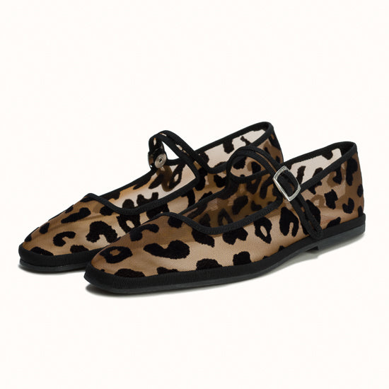 MaryJane embout carré bi-matière en résille léopard velours noir.