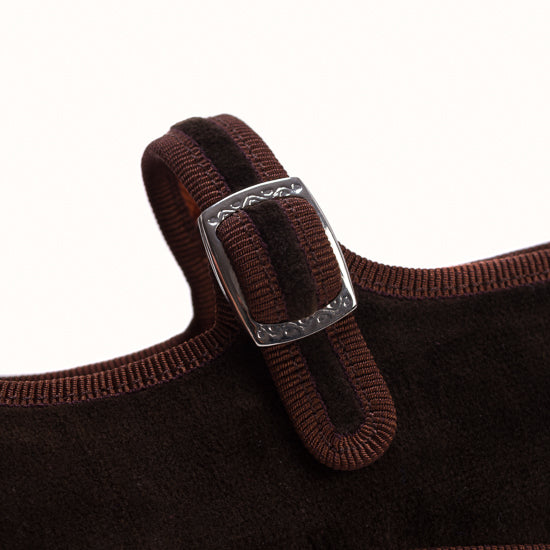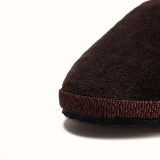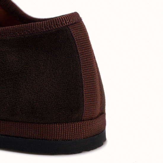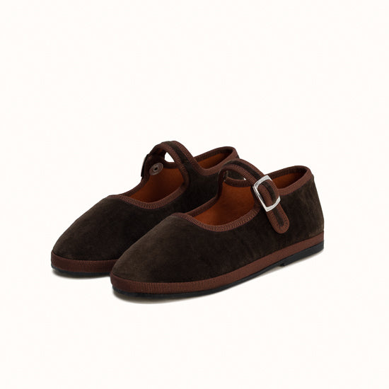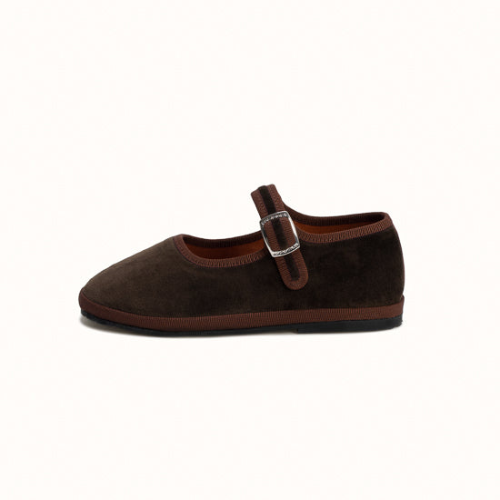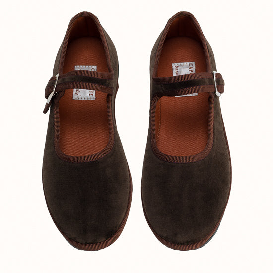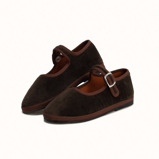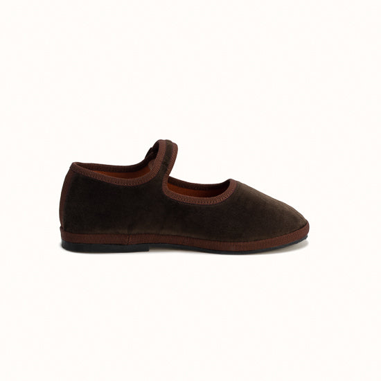 Mary-Jane en velours marron foncé et rebords en gros grain ton sur ton.