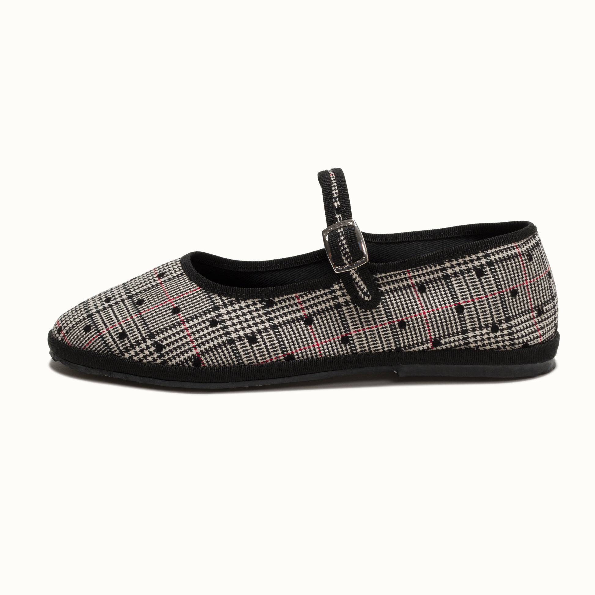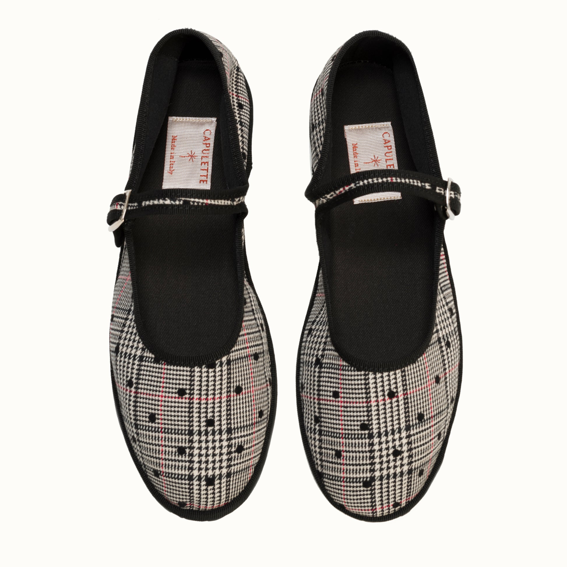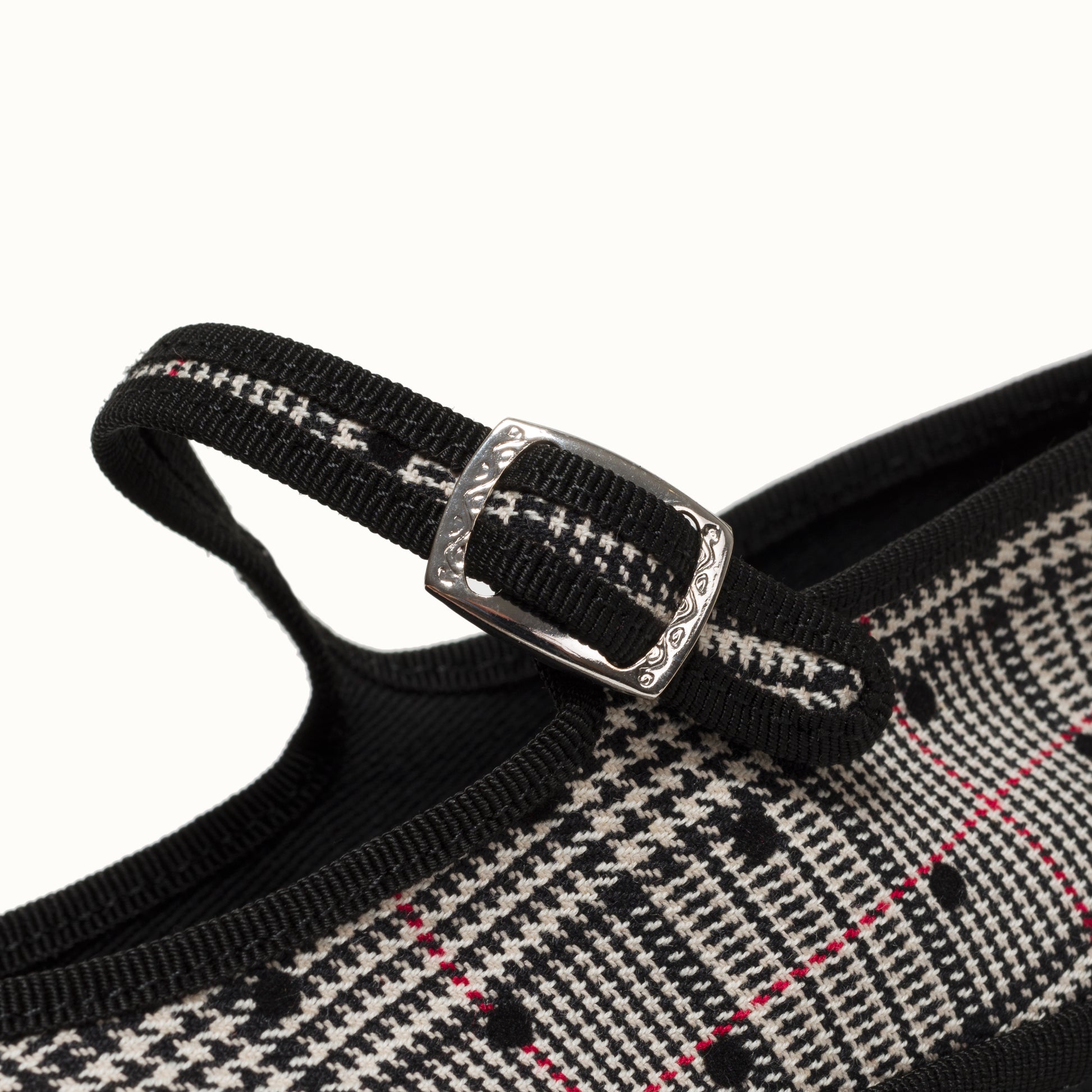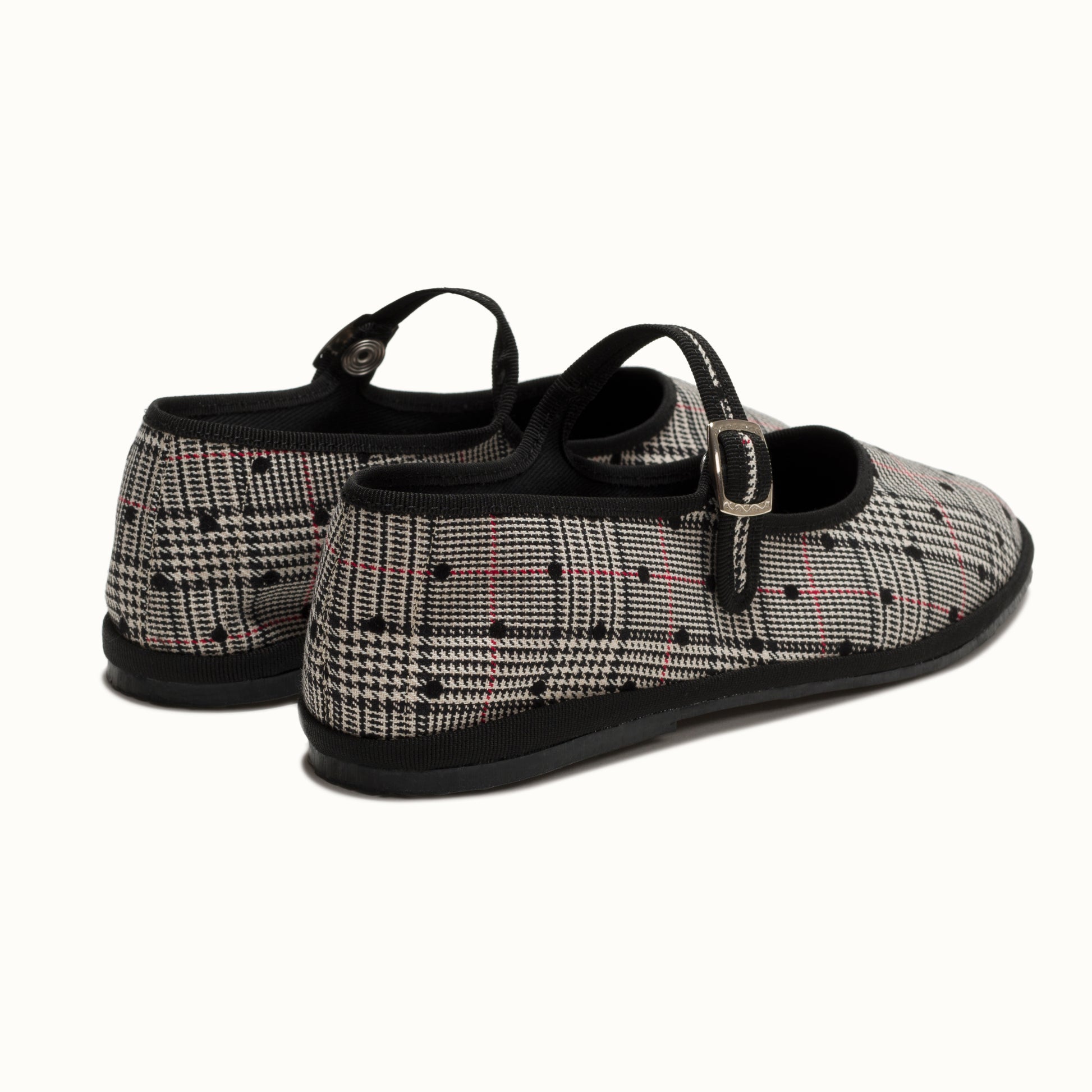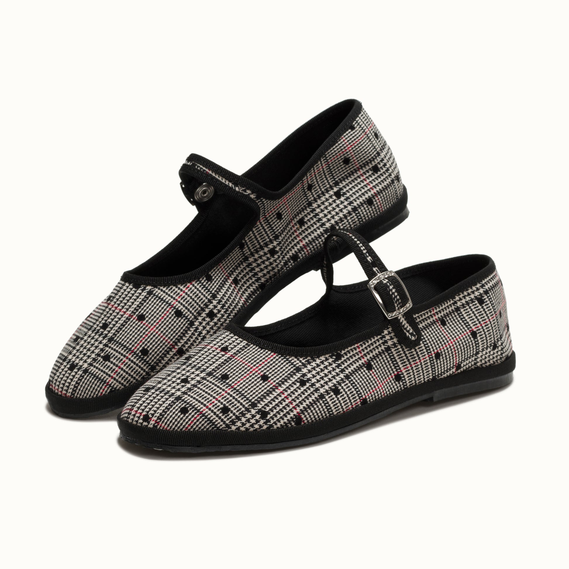 Maryjane embout rond en tissu Prince de Galles noir à pois noirs.