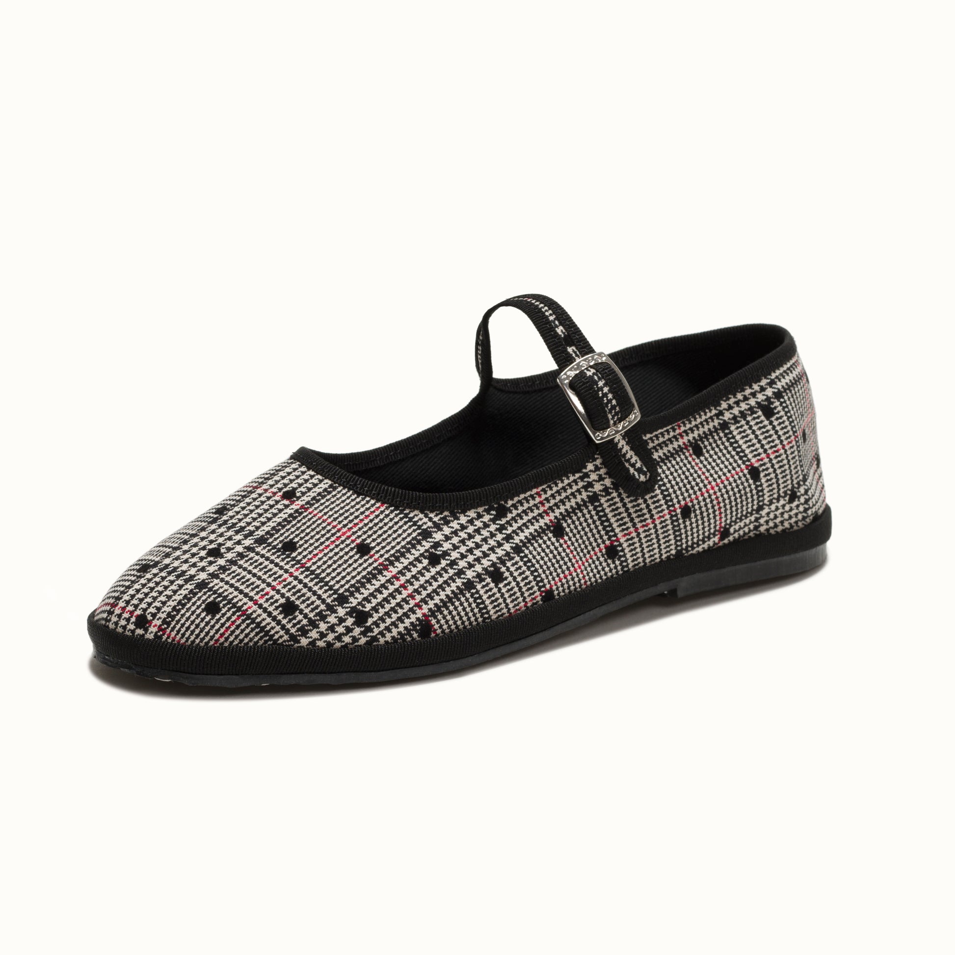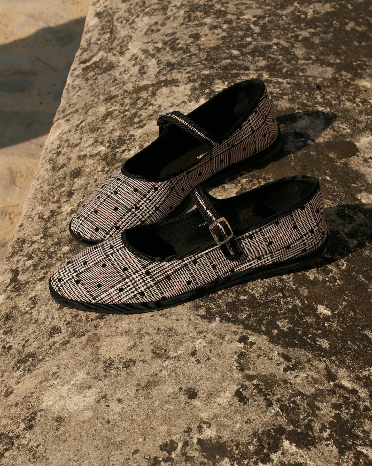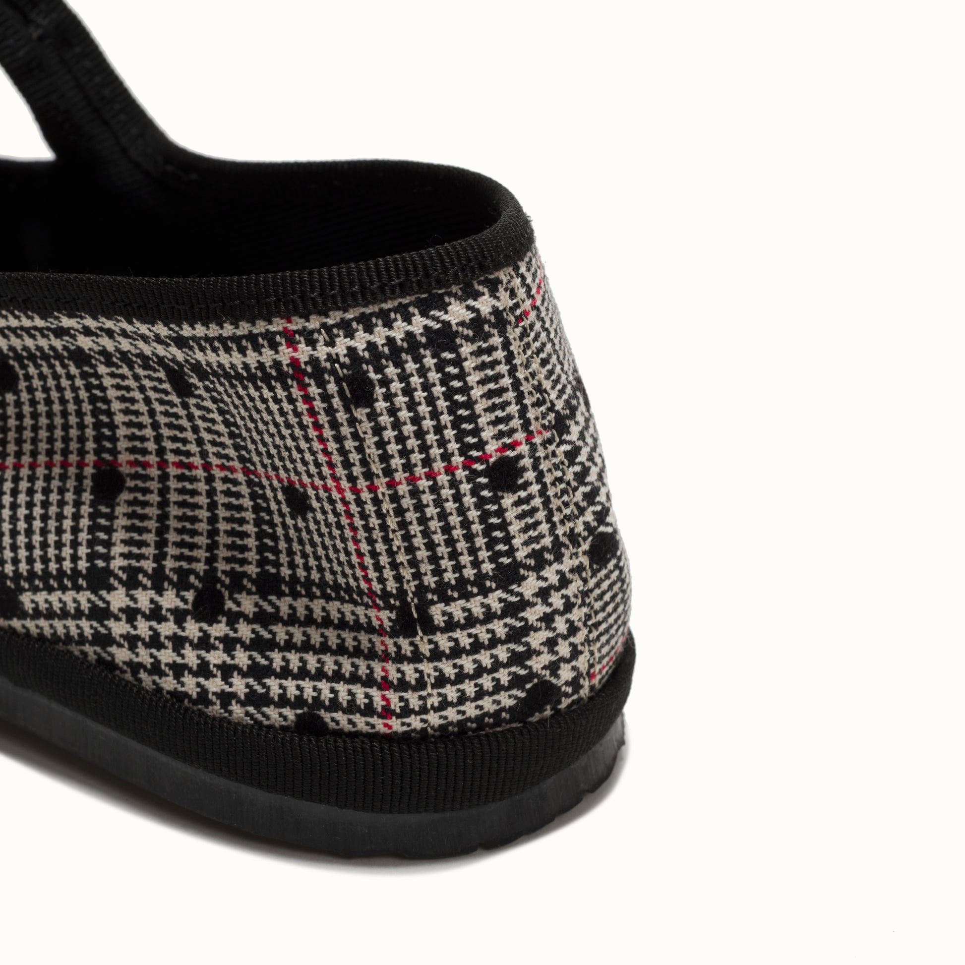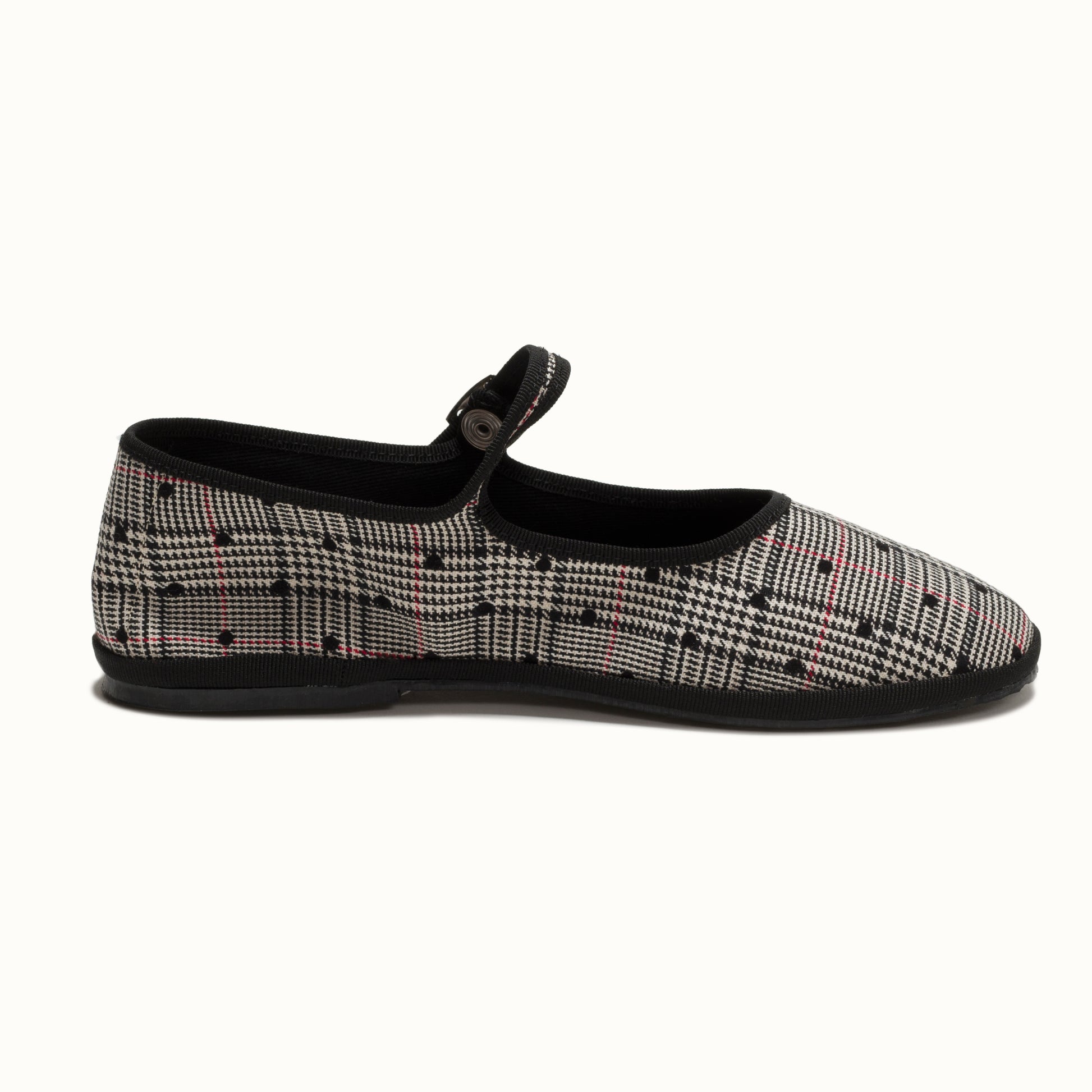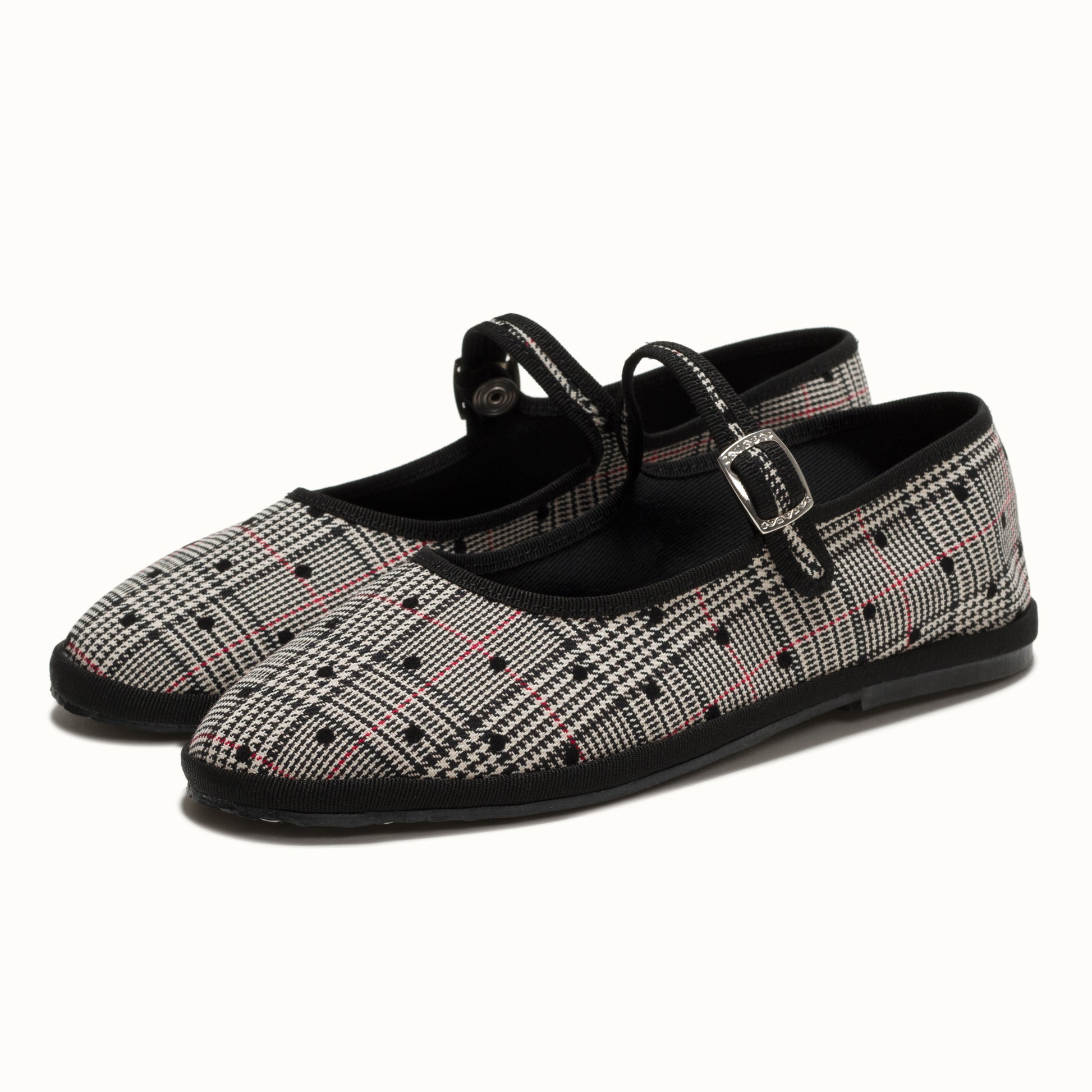Maryjane embout rond en tissu Prince de Galles noir à pois noirs.