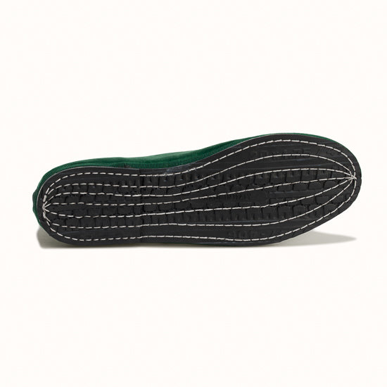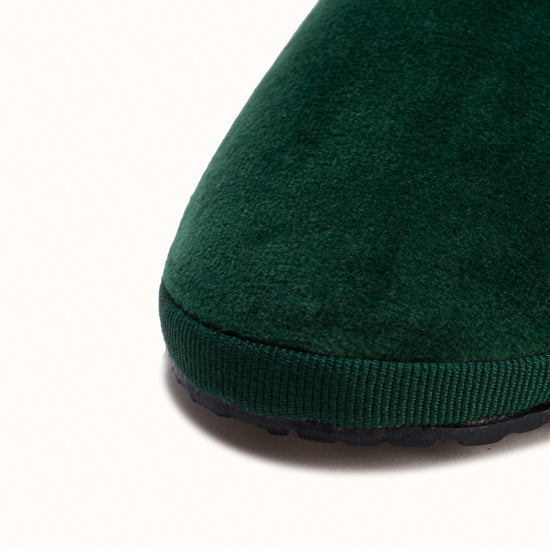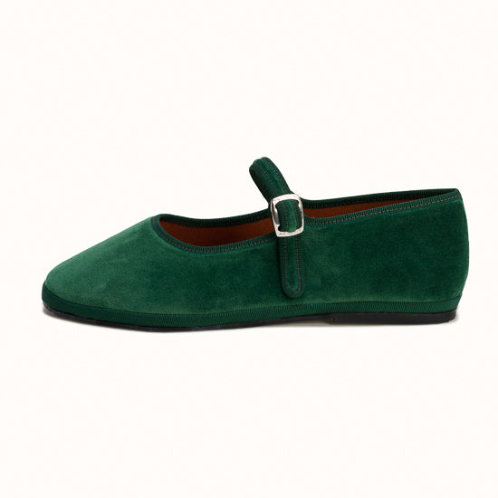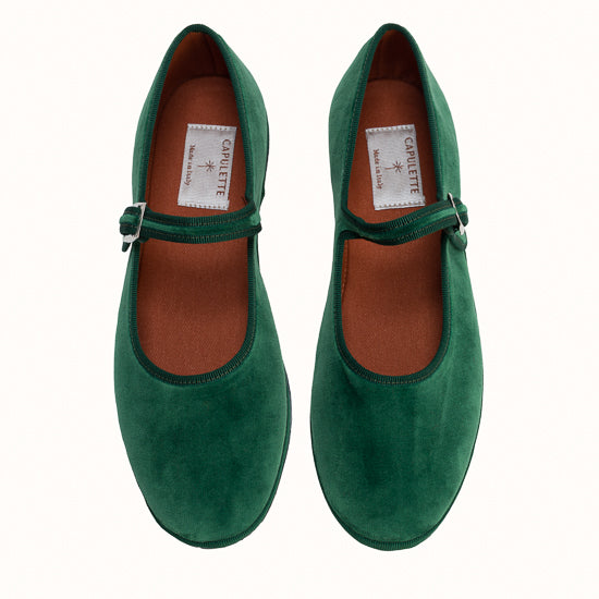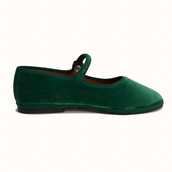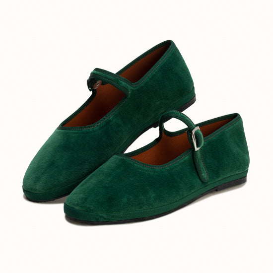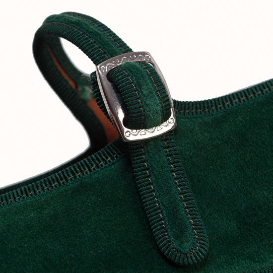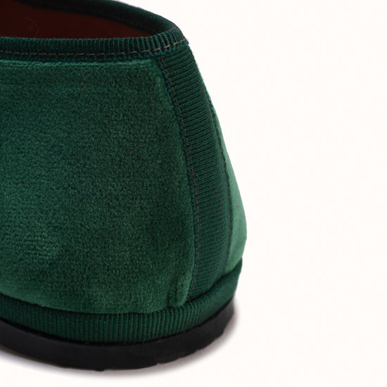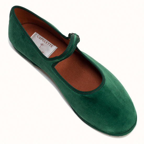 Mary-Jane en velours vert sapin et rebords en gros grain ton sur ton.