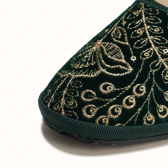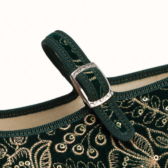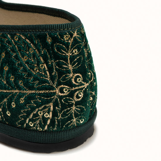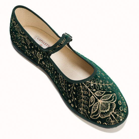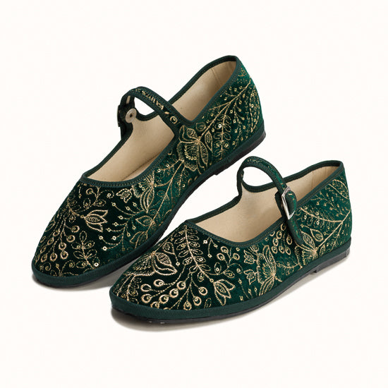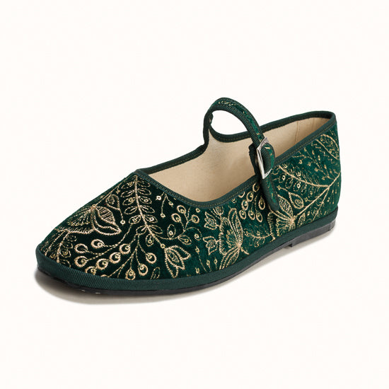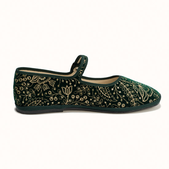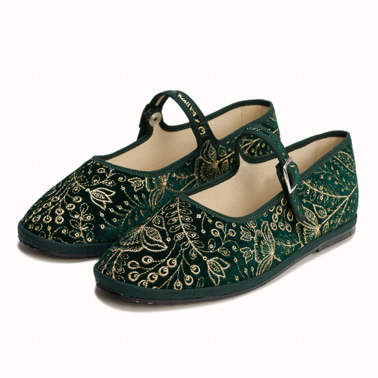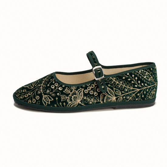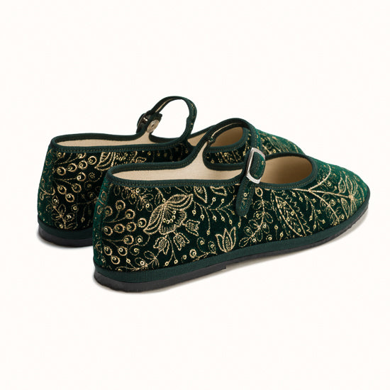 Maryjane en velours vert brodé a fleurs.