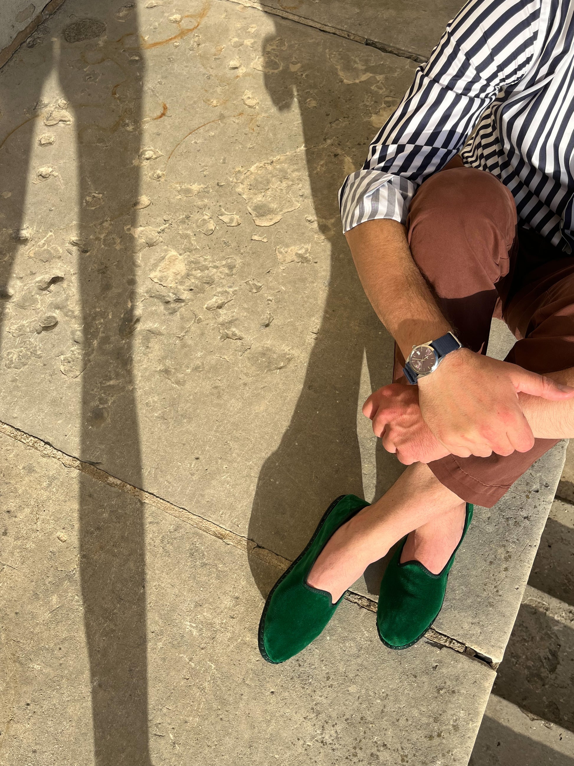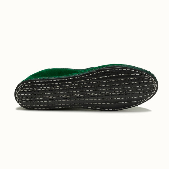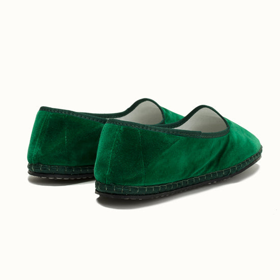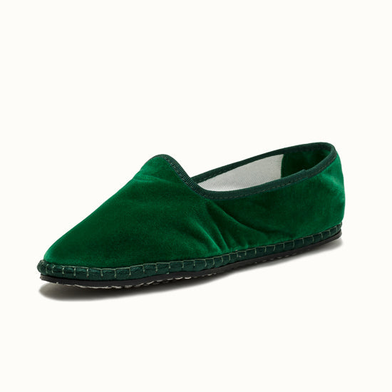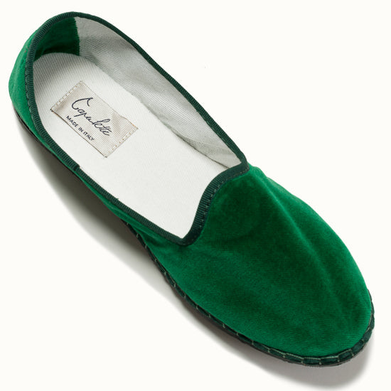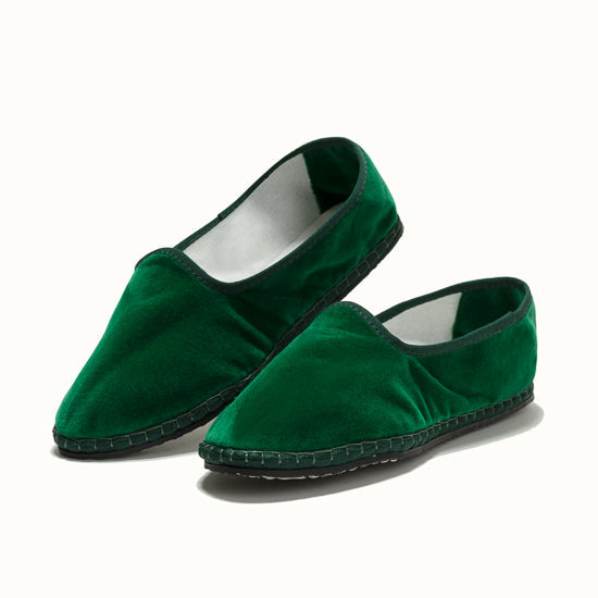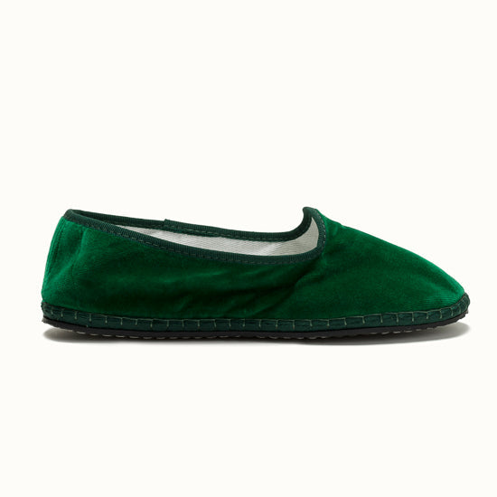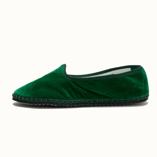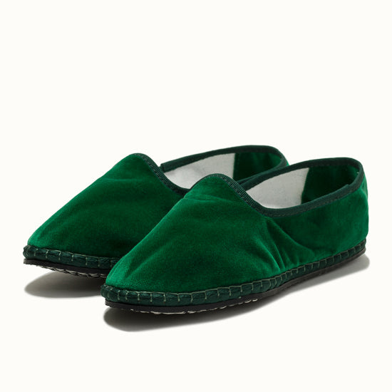 Friulane fabriquée selon la tradition Vénitienne en velours vert émeraude et gros grain ton sur ton. La semelle extérieure est en pneu de vélo et la semelle intérieure en coton. Se porte aussi bien à l'intérieur qu'à l'extérieur !