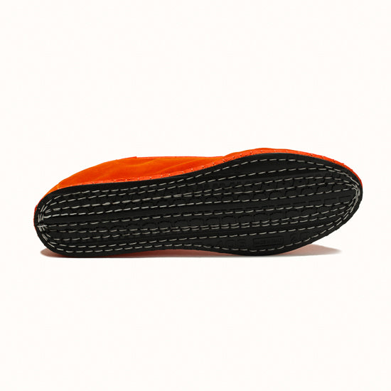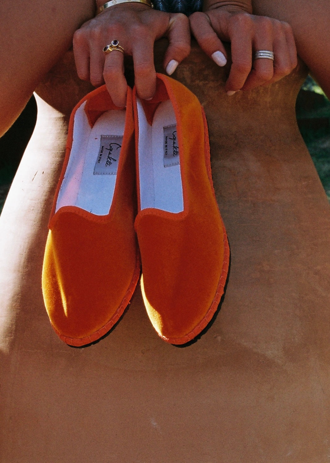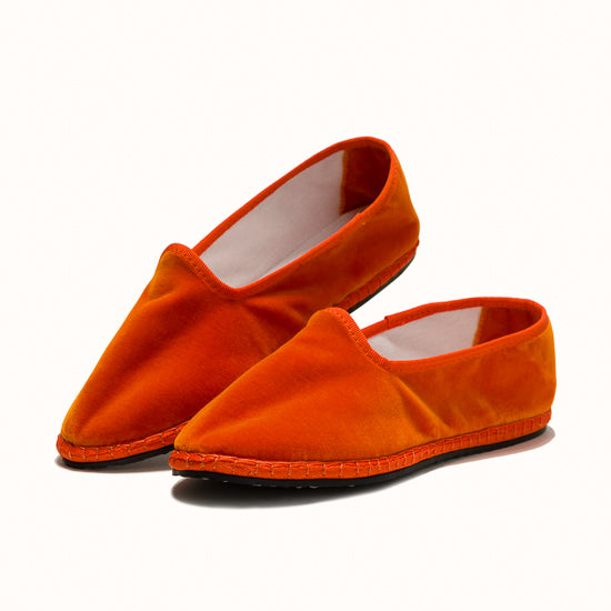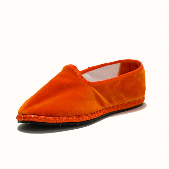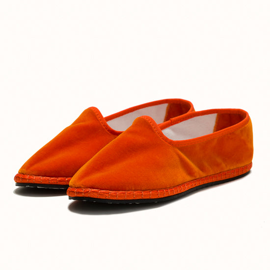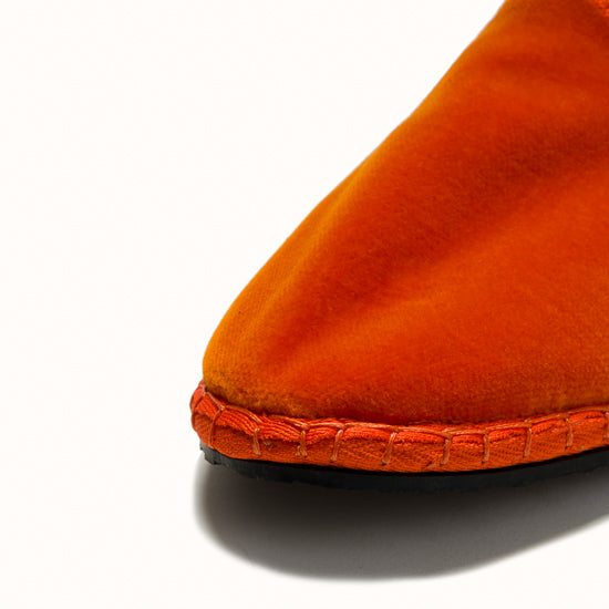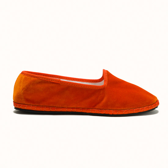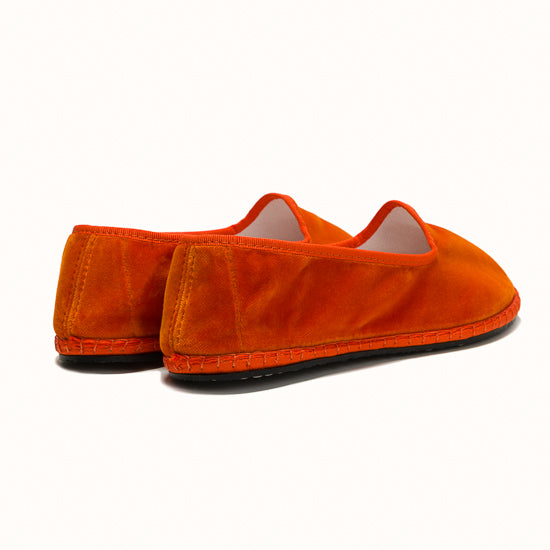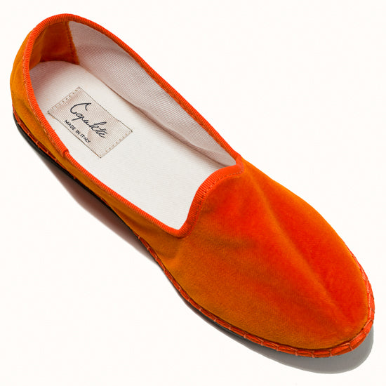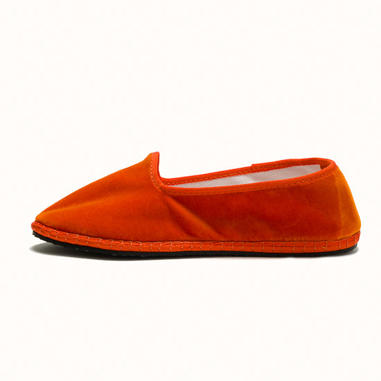 Friulane fabriquée selon la tradition Vénitienne en velours orange tangerine et gros grain ton sur ton. La semelle extérieure est en pneu de vélo et la semelle intérieure en coton. Se porte aussi bien à l'intérieur qu'à l'extérieur !