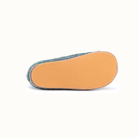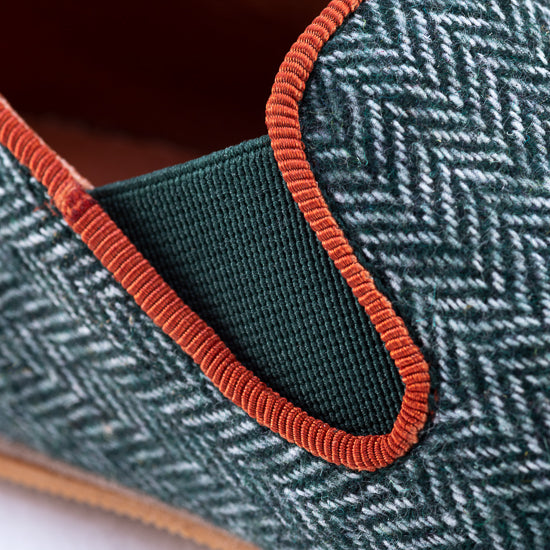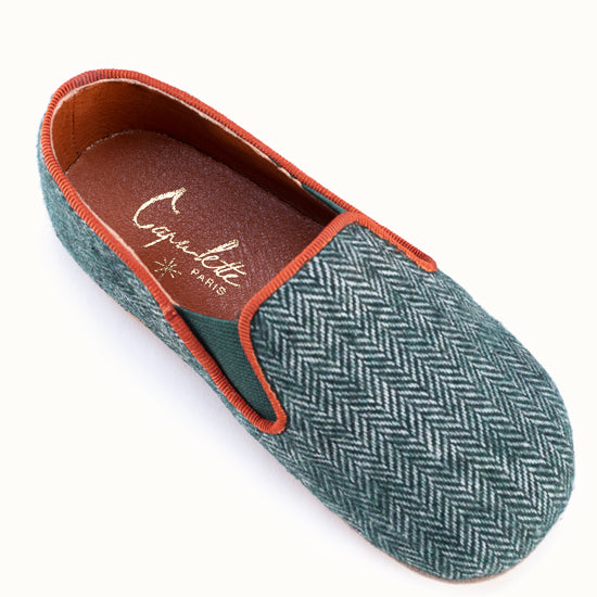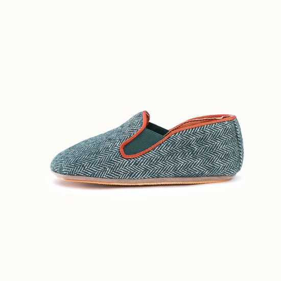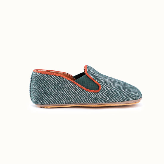 Pantoufle en tweed à chevrons vert forêt.