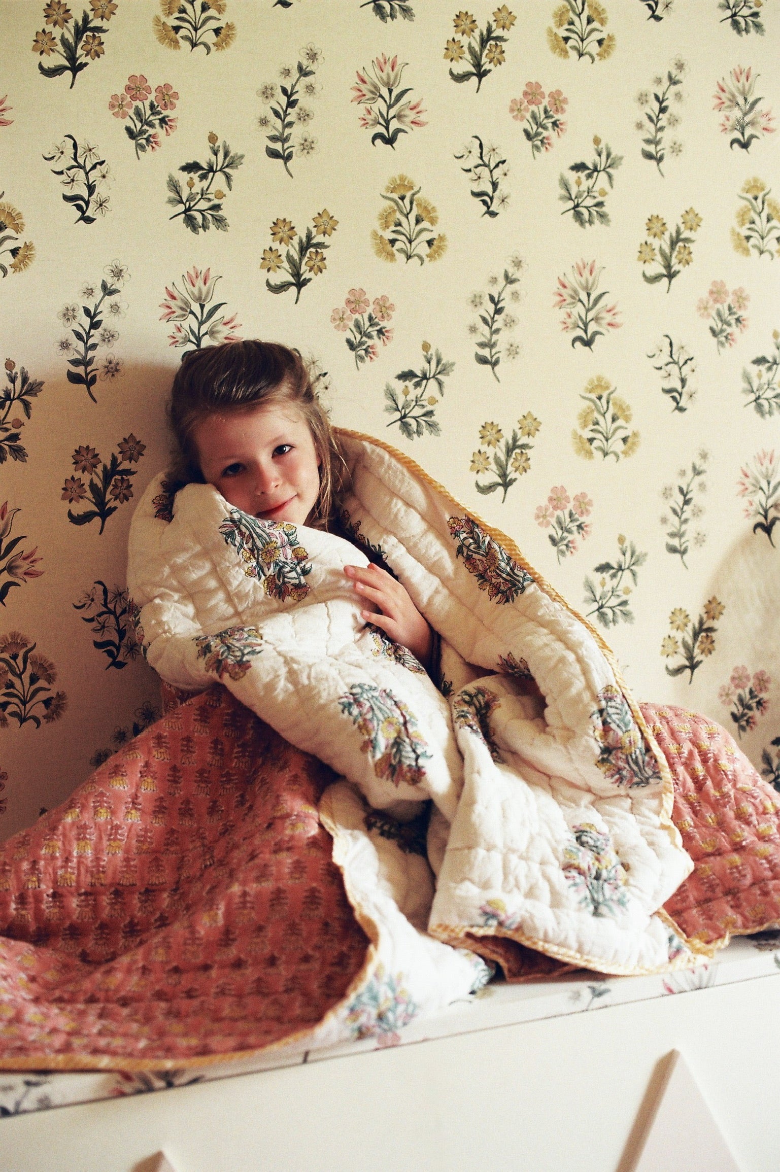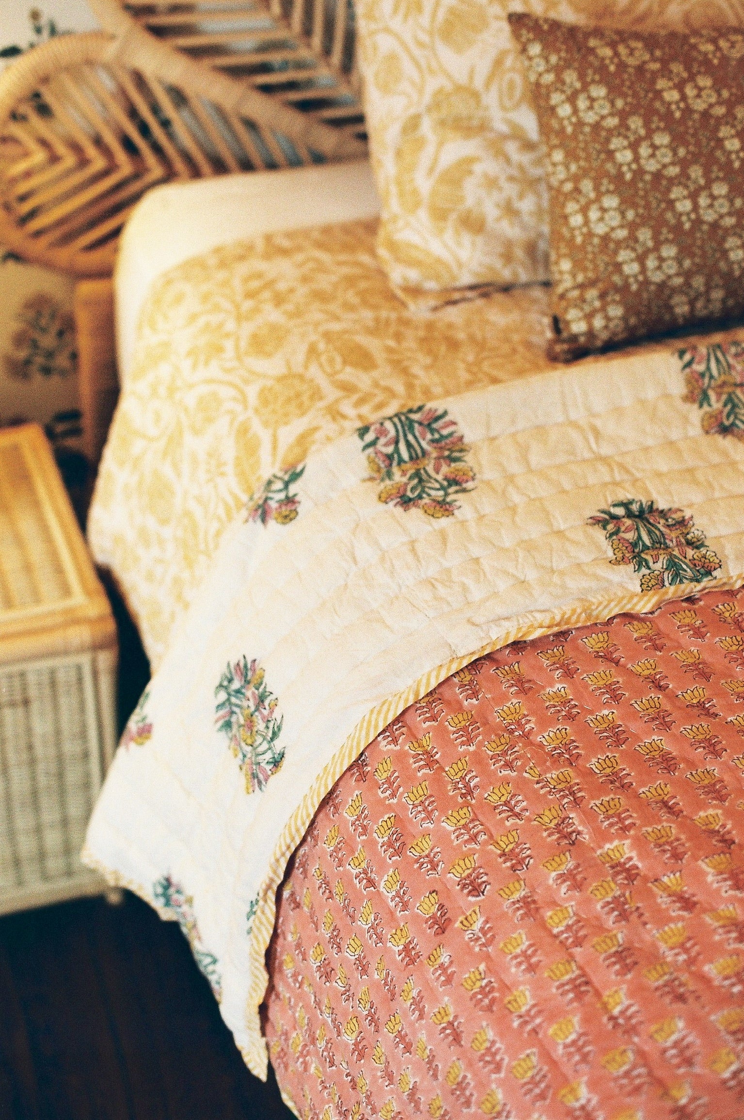 Couvre lit réversible en coton imprimé blockprint, et finition matelassée.
