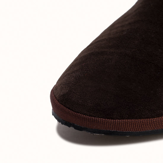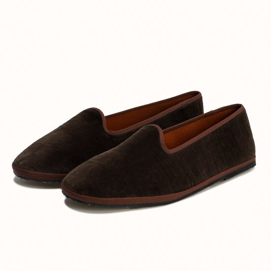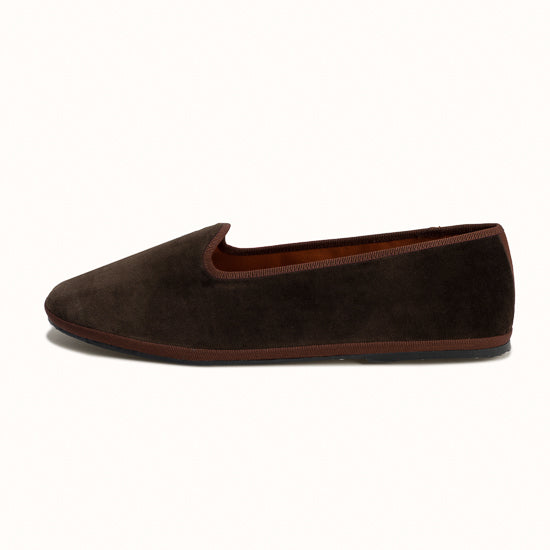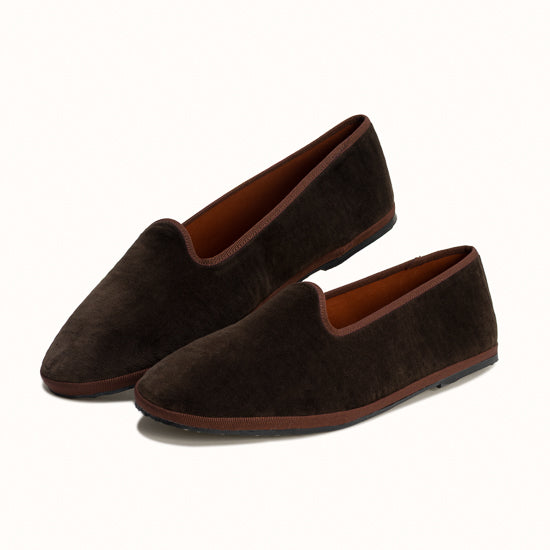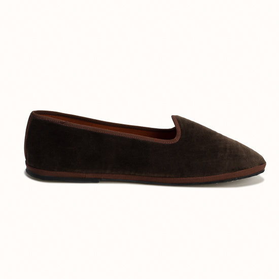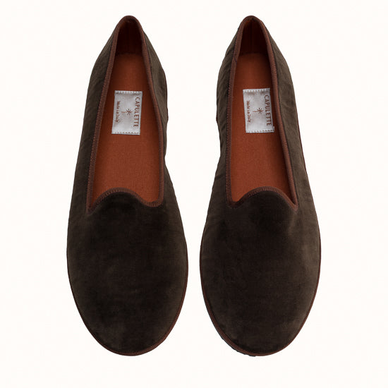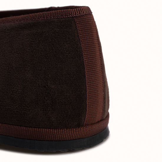 Friulane en velours marron foncé et rebords en gros grain ton sur ton.