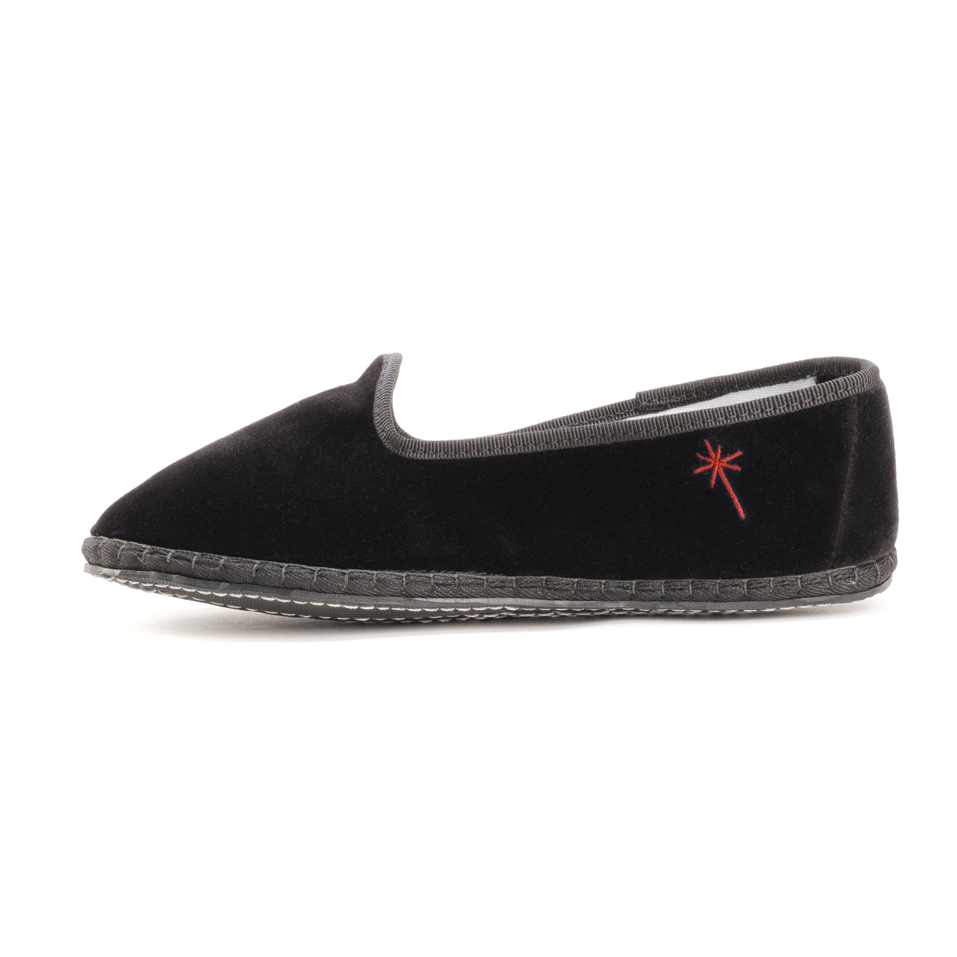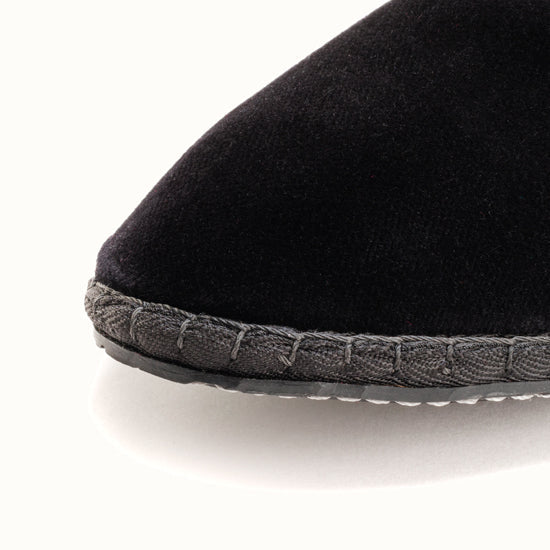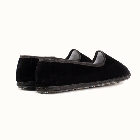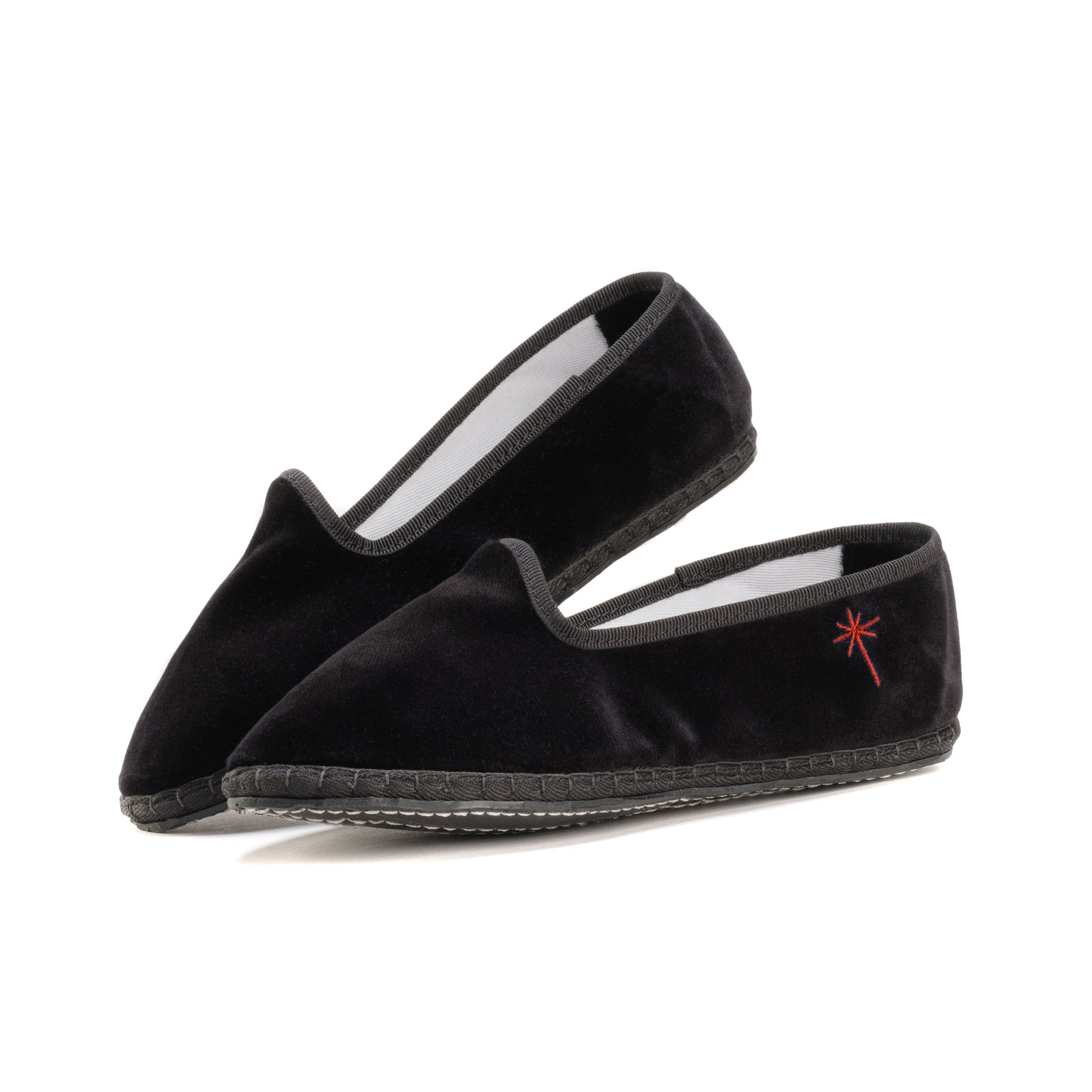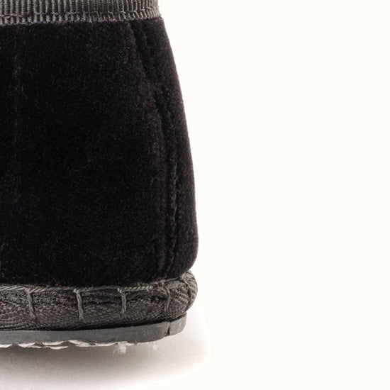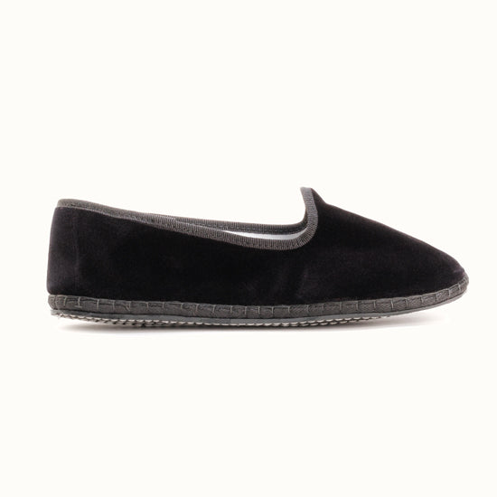 Friulane fabriquée selon la tradition Vénitienne en velours noir et gros grain ton sur ton. La semelle extérieure est en pneu de vélo et la semelle intérieure en coton. Se porte aussi bien à l'intérieur qu'à l'extérieur !