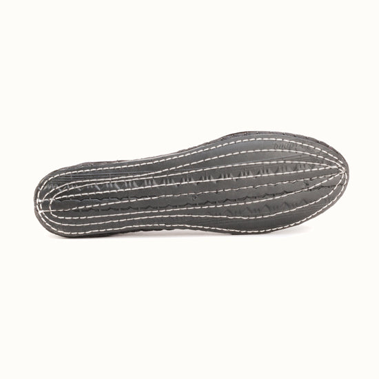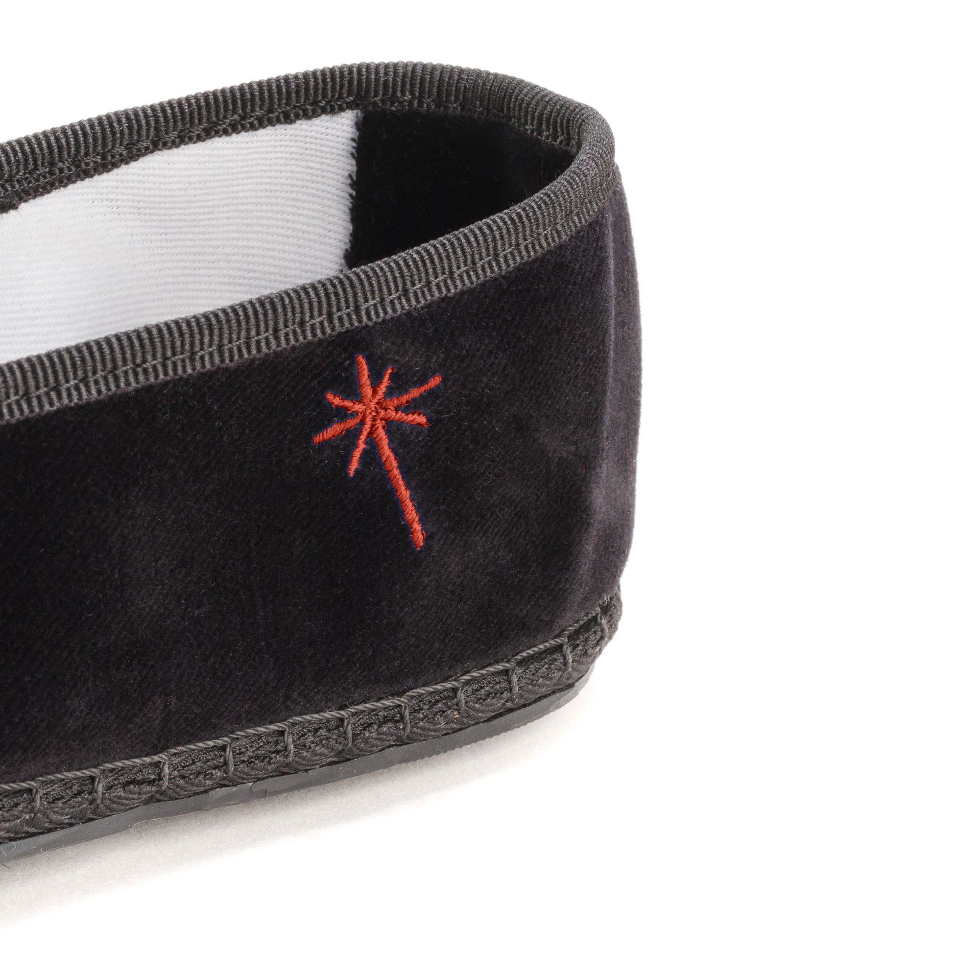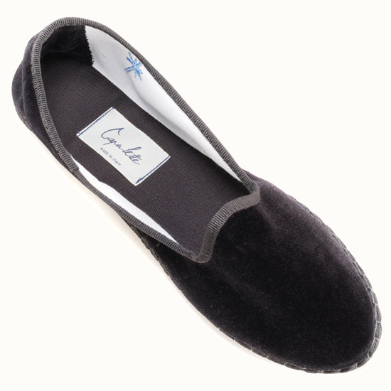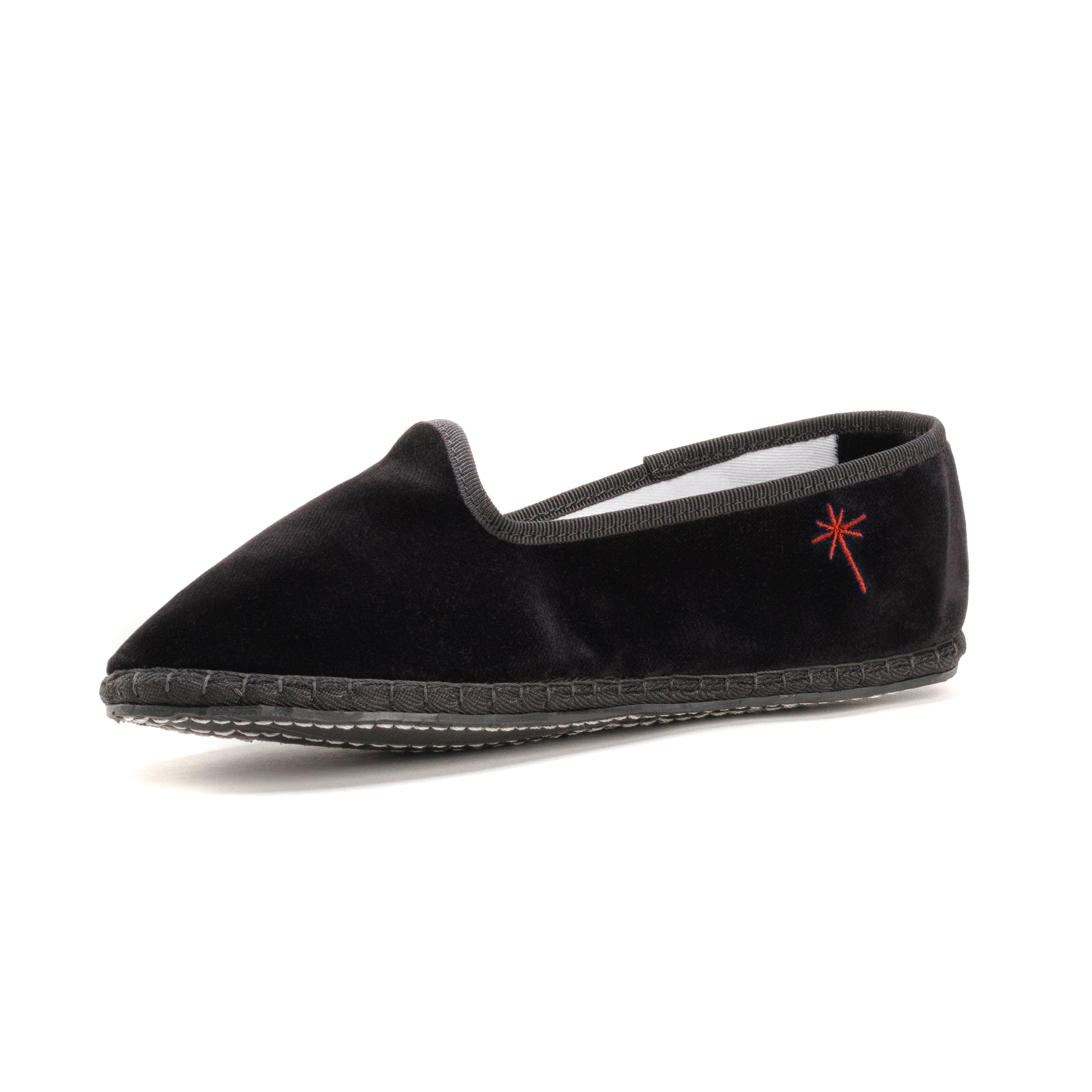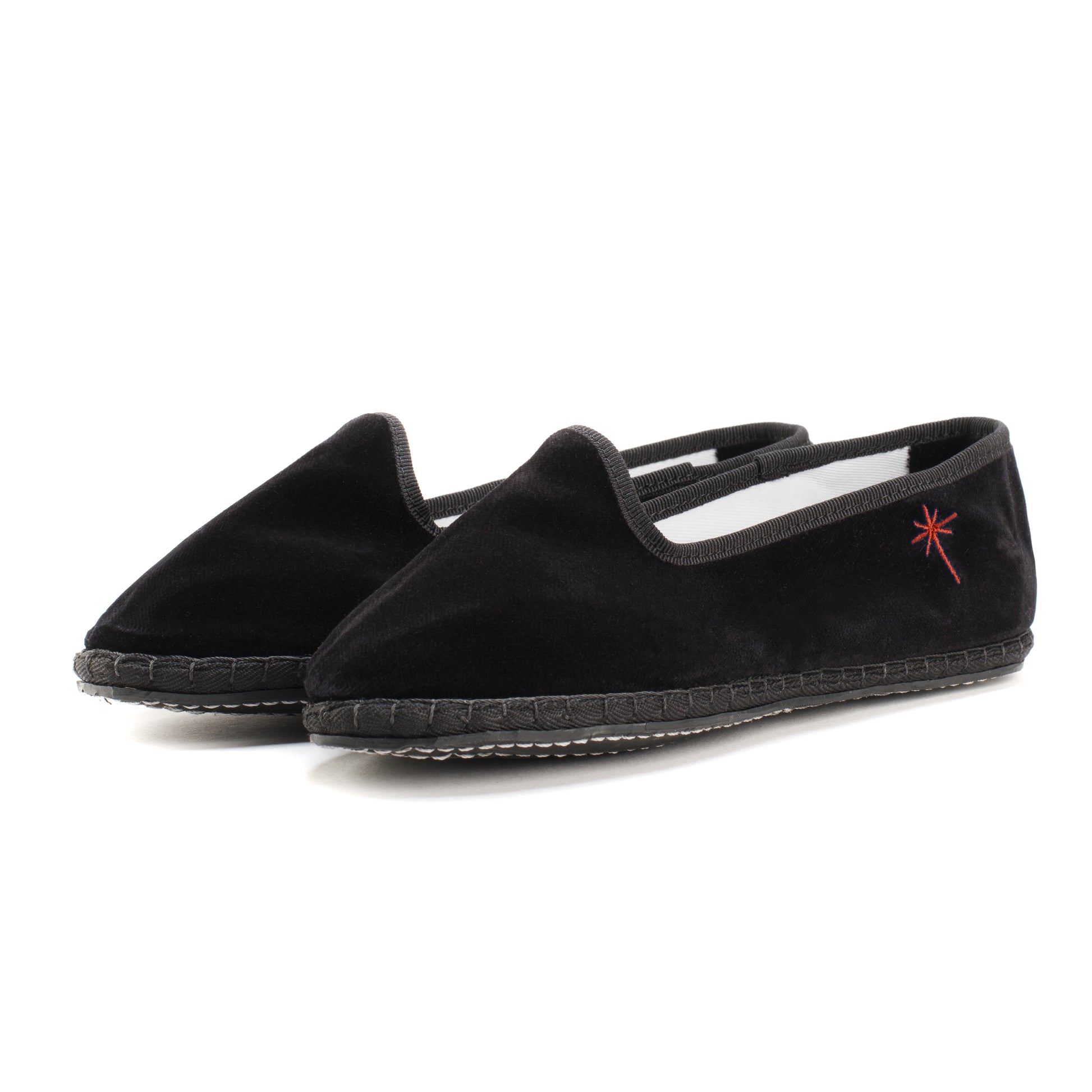 Friulane fabriquée selon la tradition Vénitienne en velours noir et gros grain ton sur ton. La semelle extérieure est en pneu de vélo et la semelle intérieure en coton. Se porte aussi bien à l'intérieur qu'à l'extérieur !