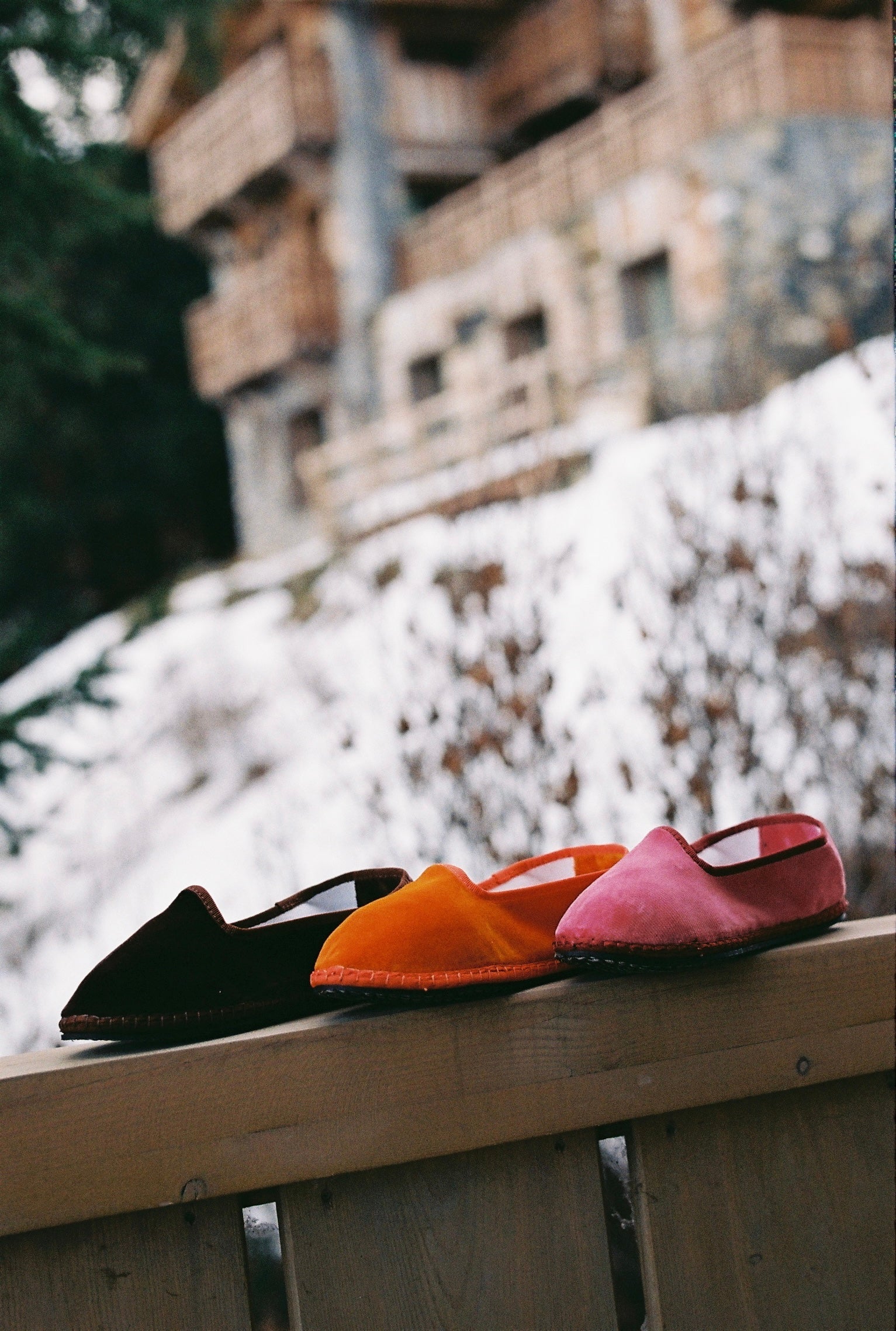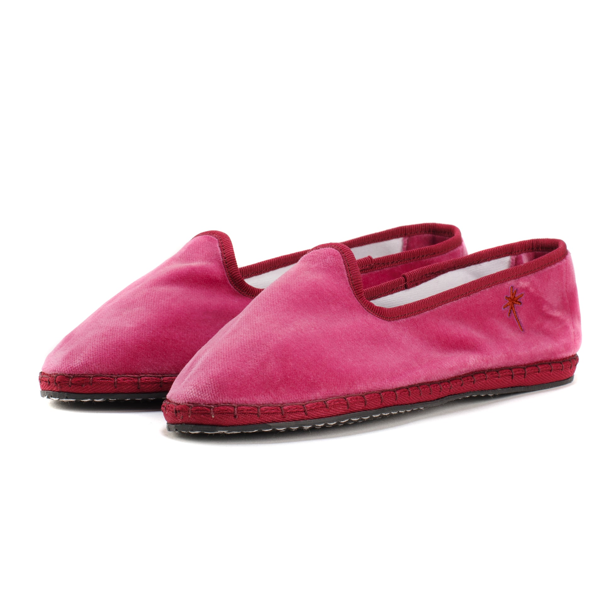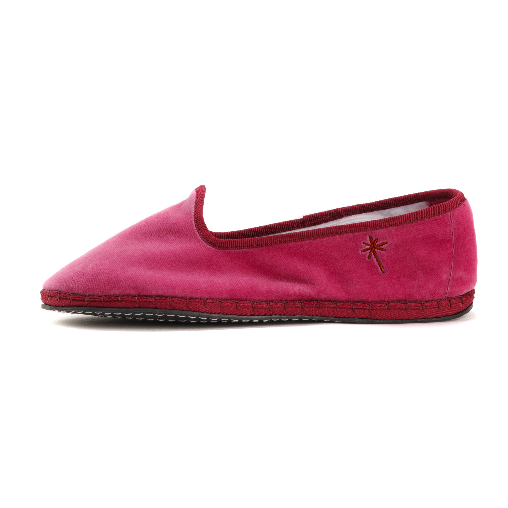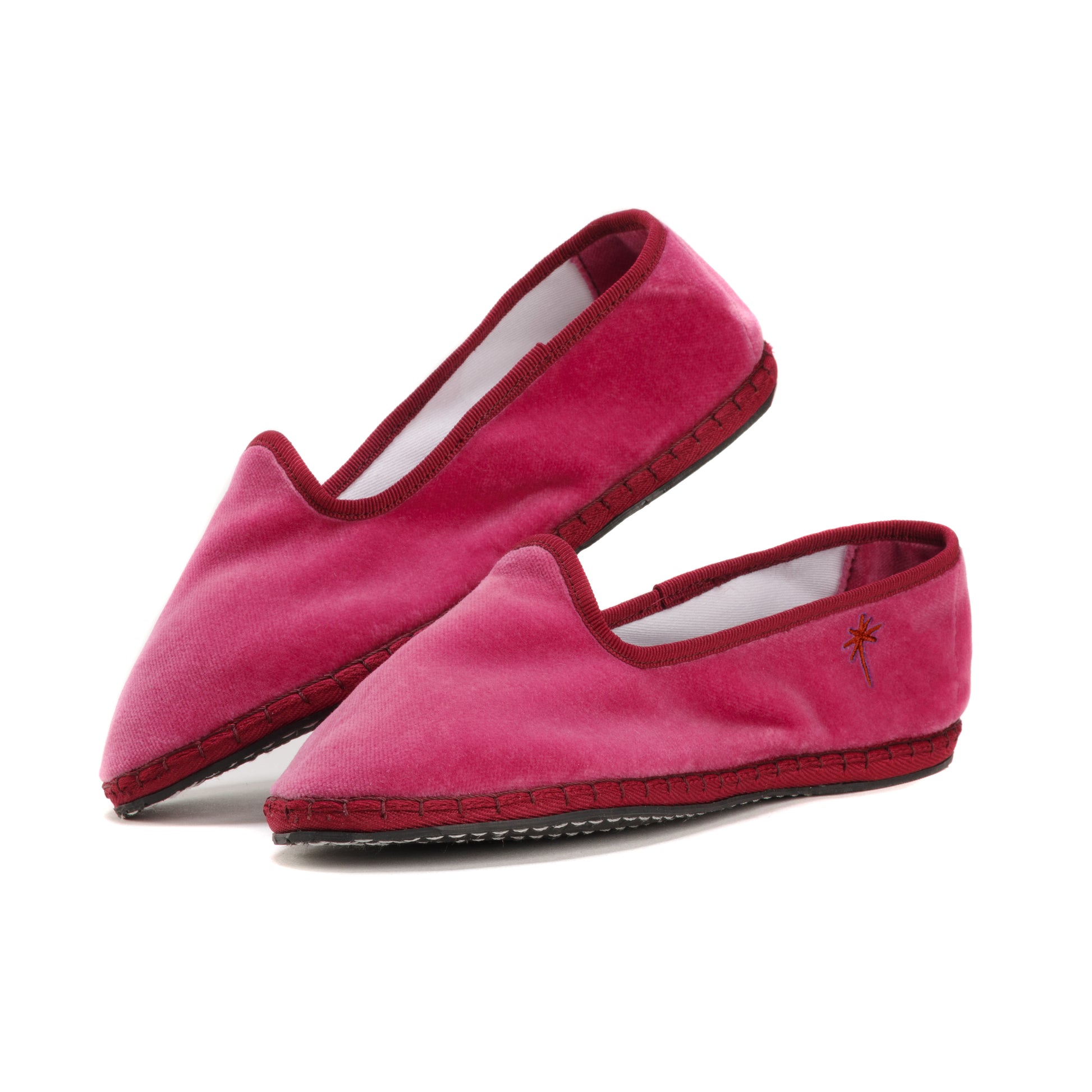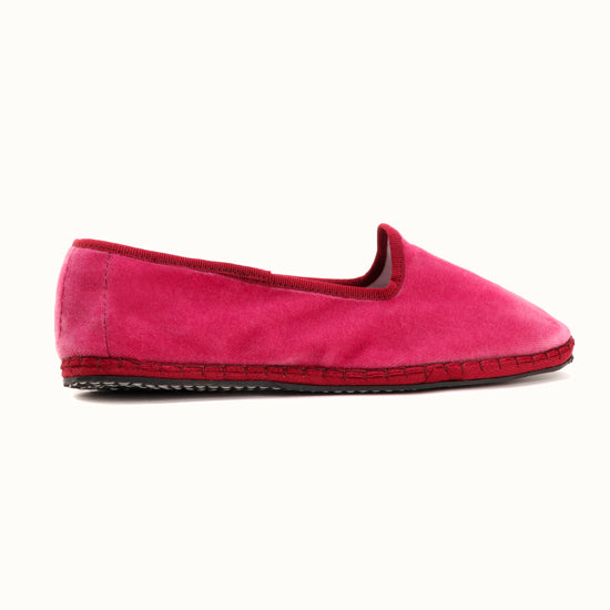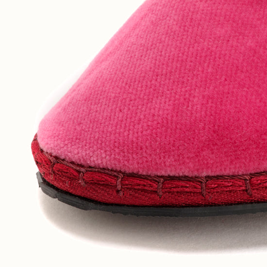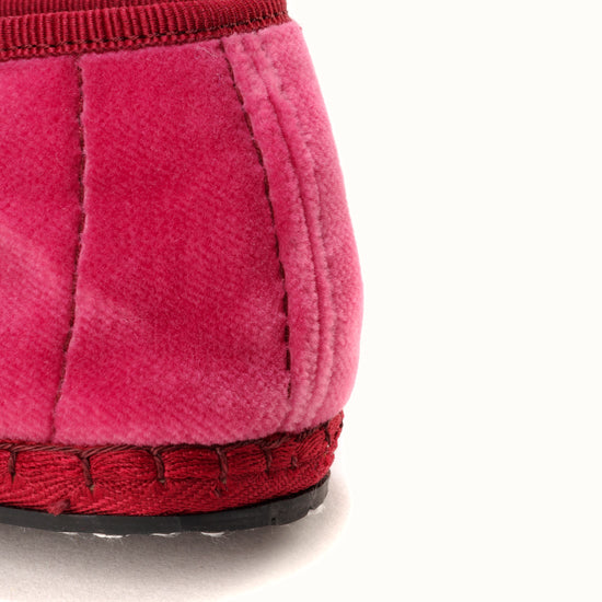 Friulane en velours rose framboise et rebords en gros grain bordeaux.