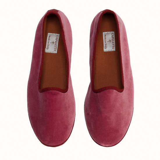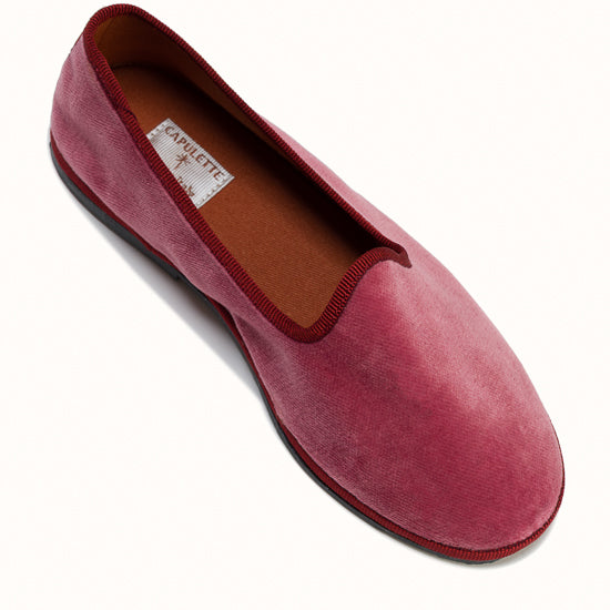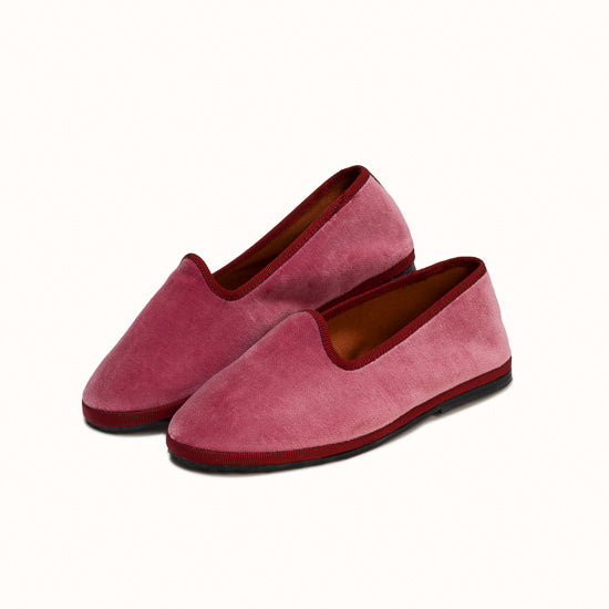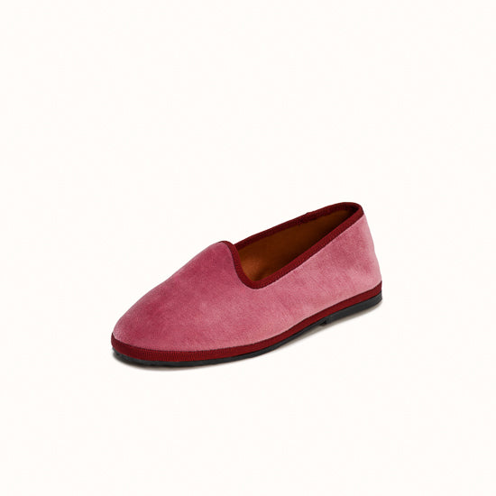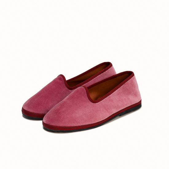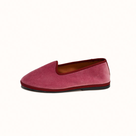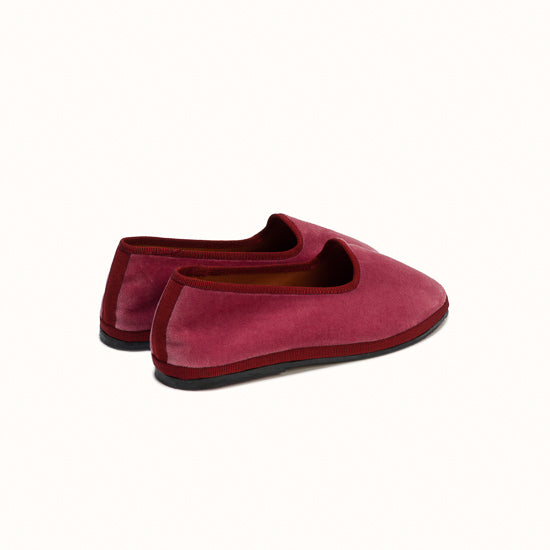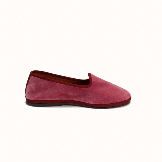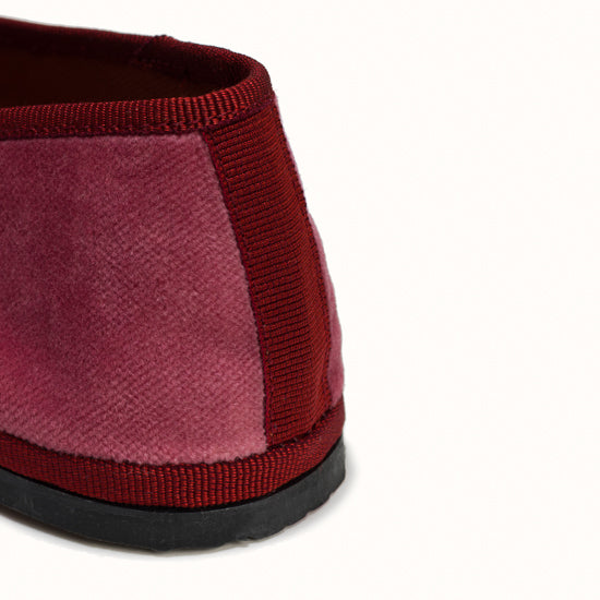 Friulane en velours rose framboise et rebords en gros grain bordeaux.