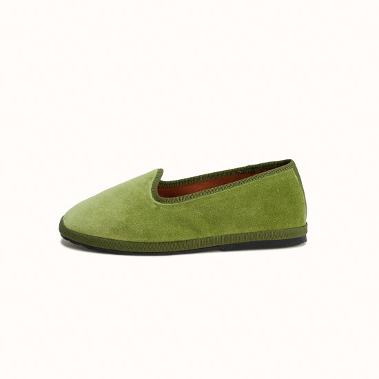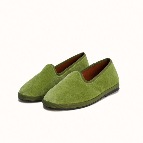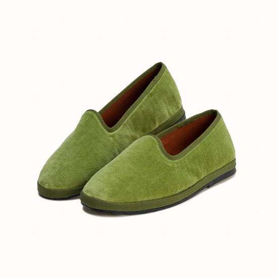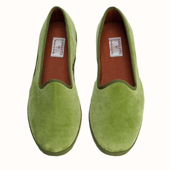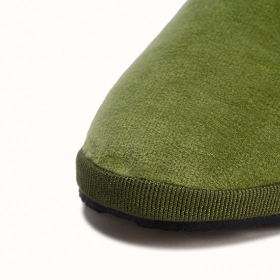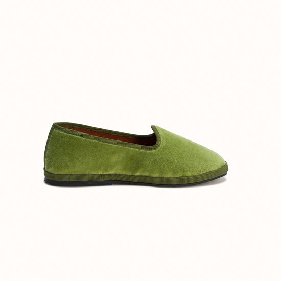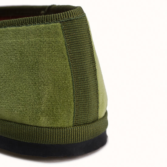 Friulane en velours vert amande et rebords en gros grain ton sur ton.