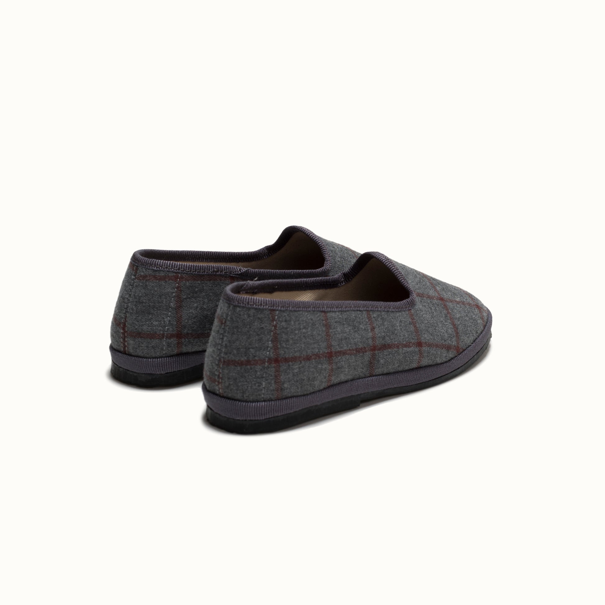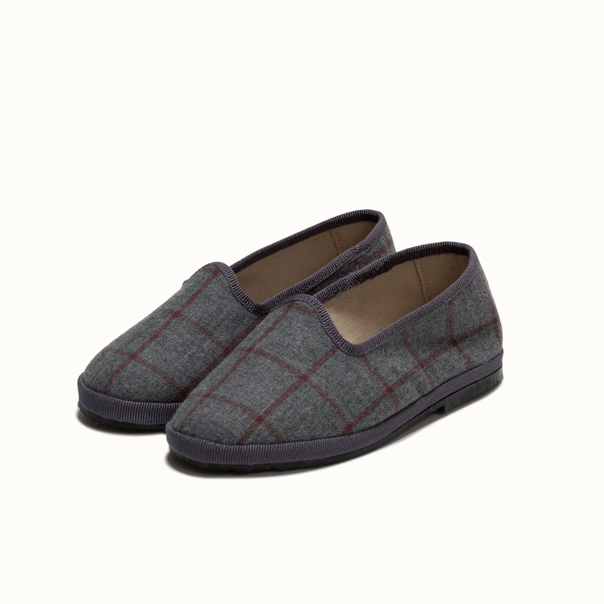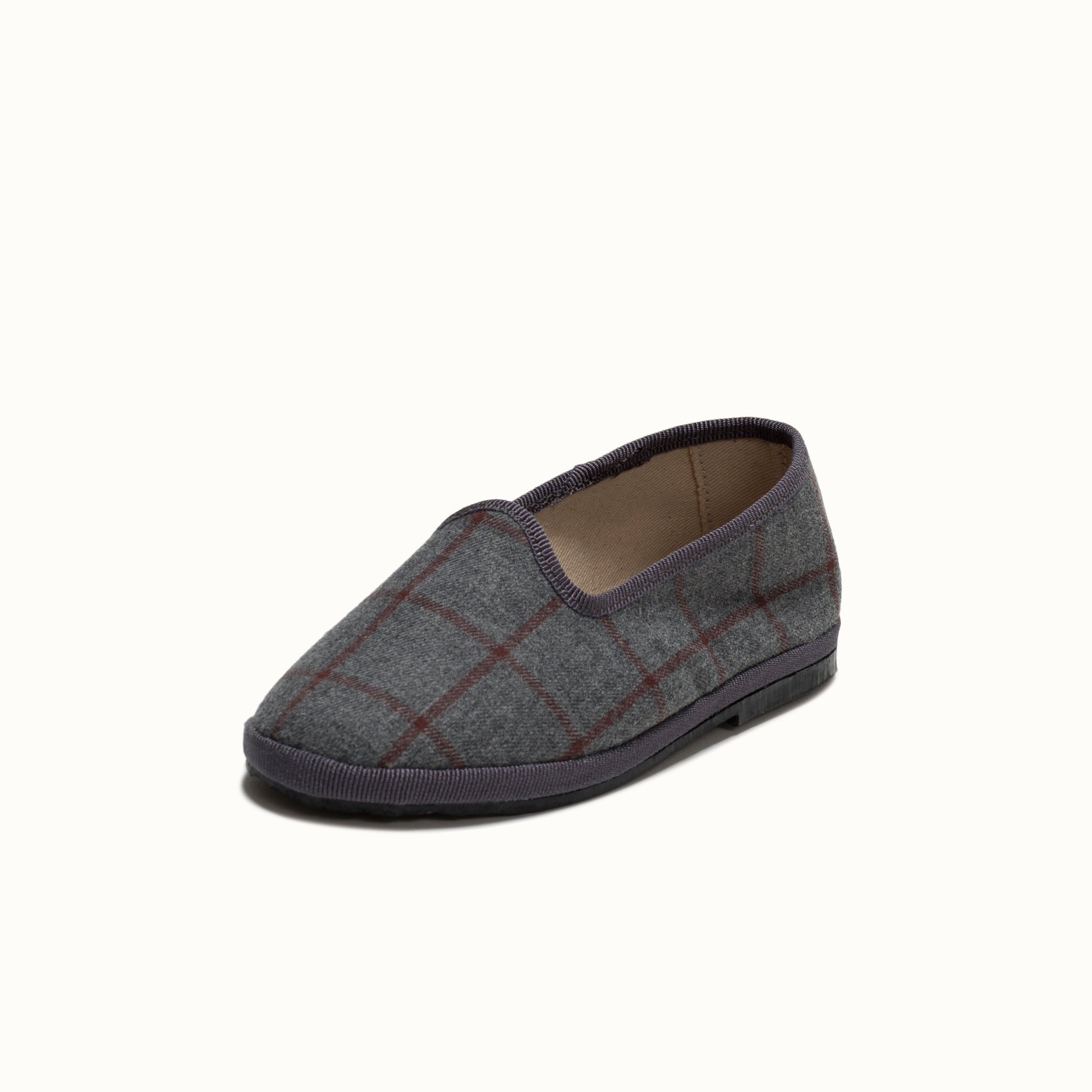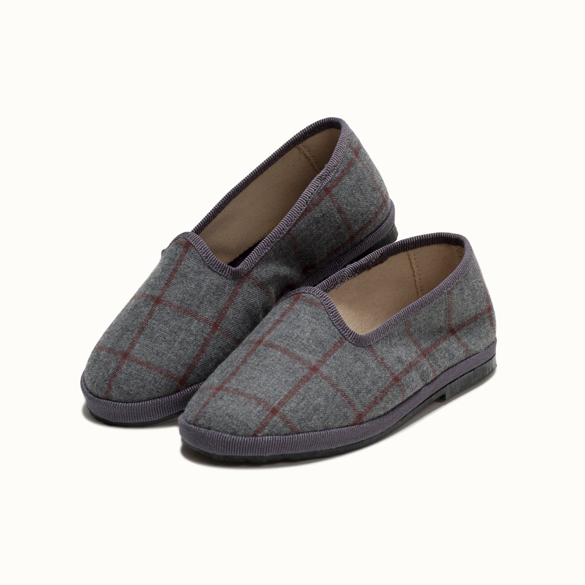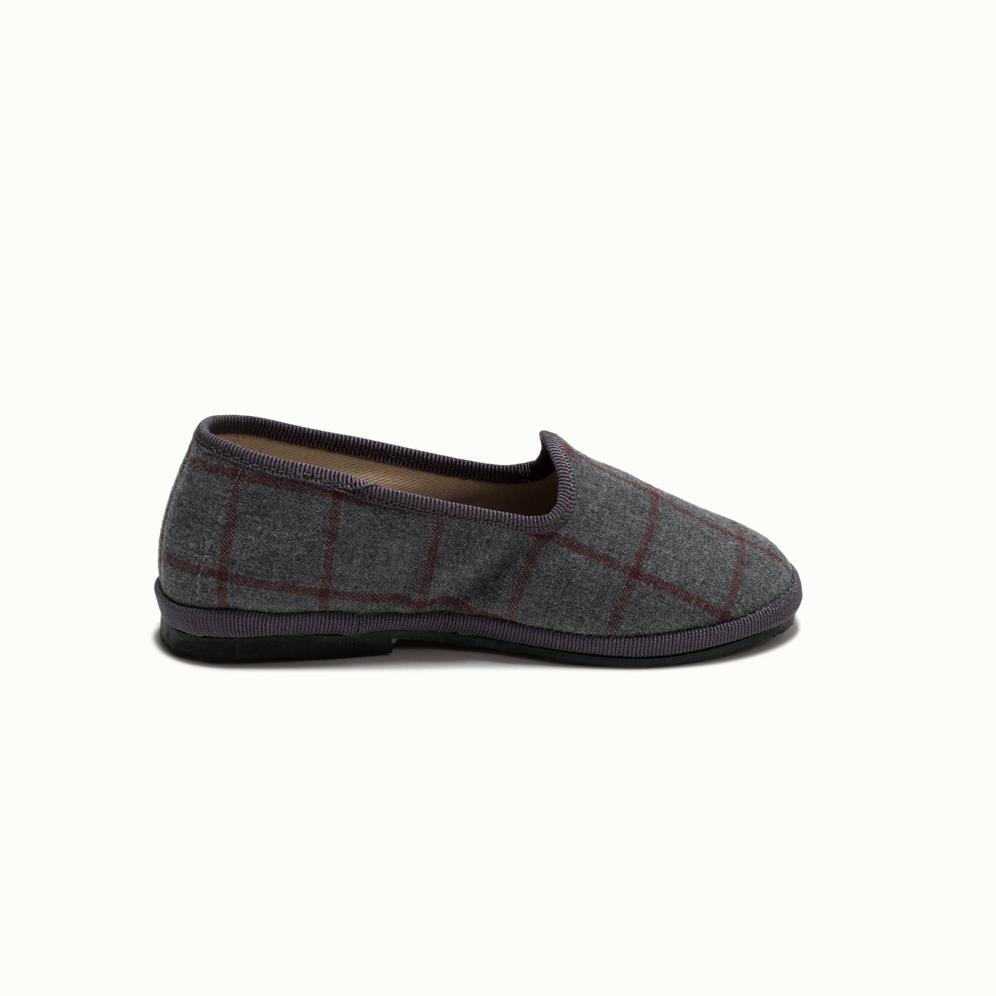 La semelle intérieure est en imprimés quadrillés bleu marine et marron.