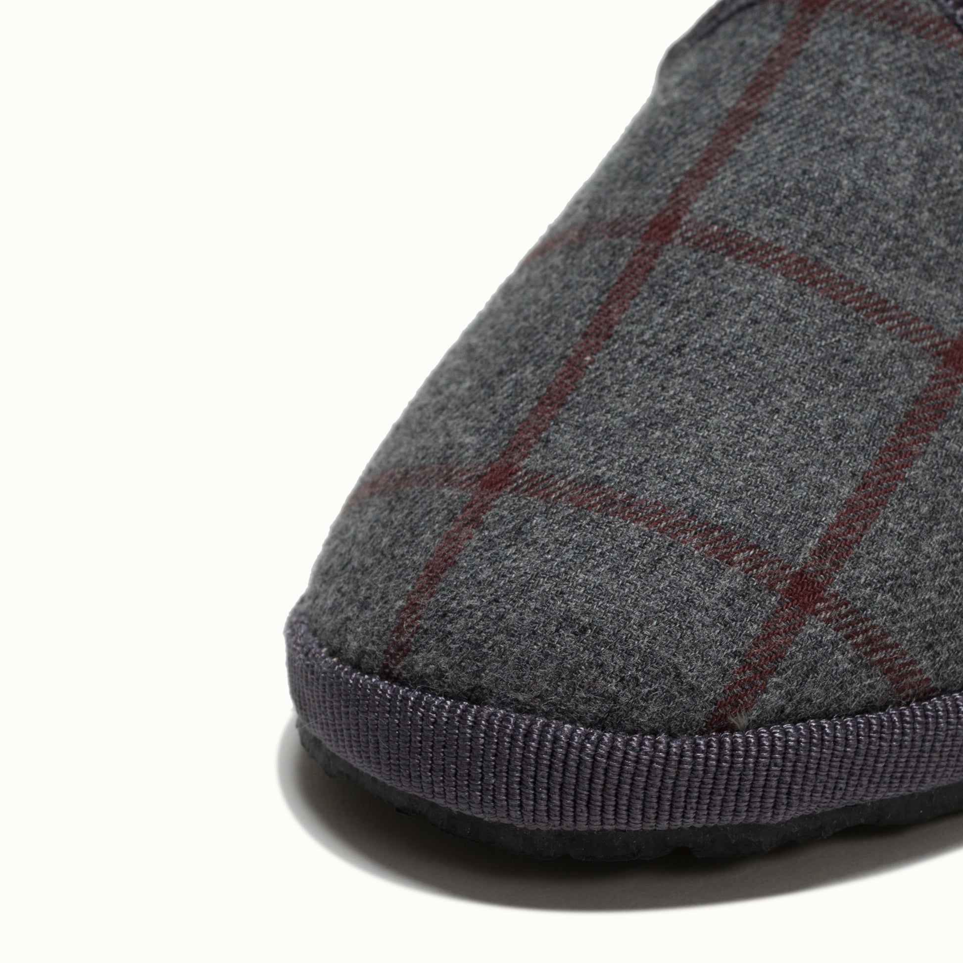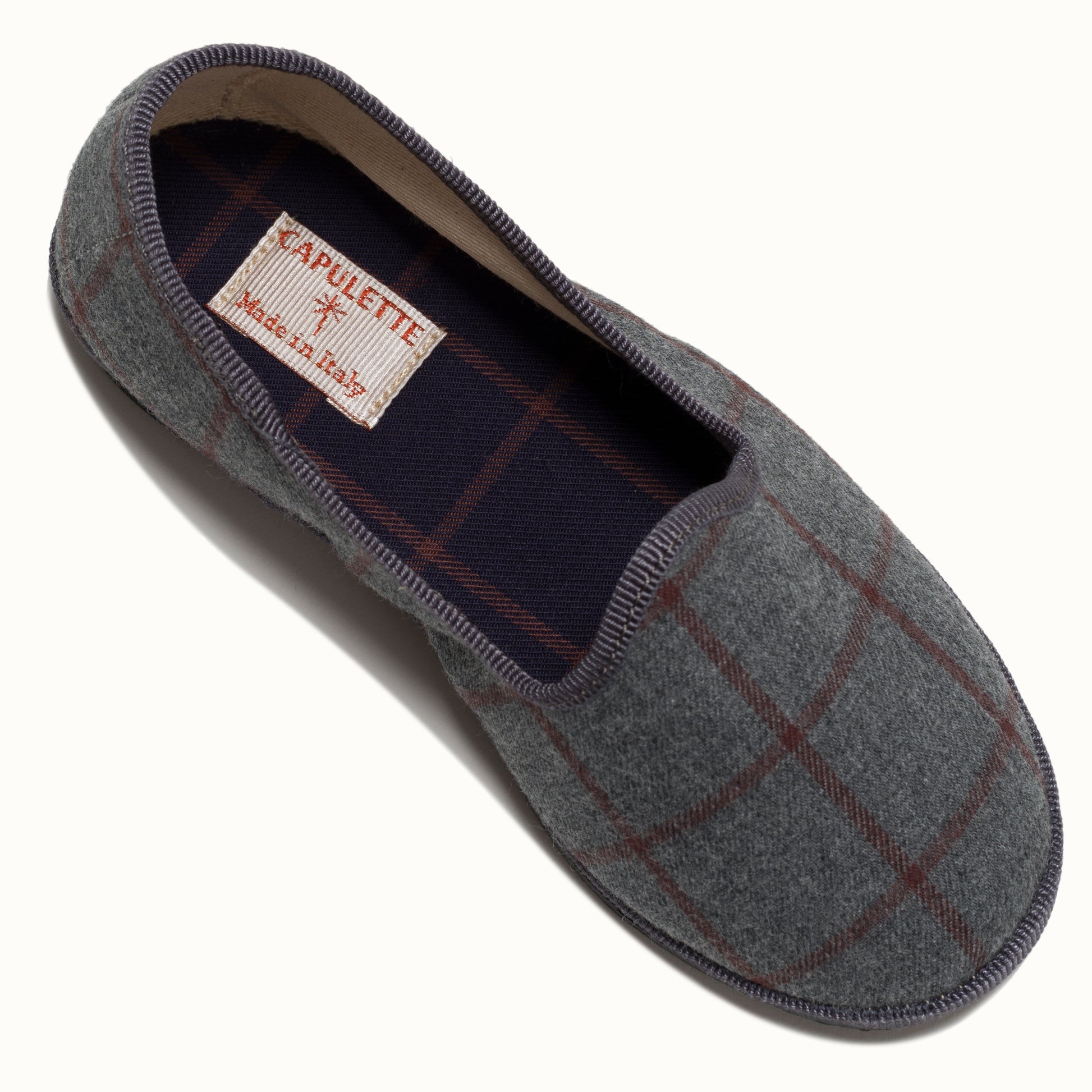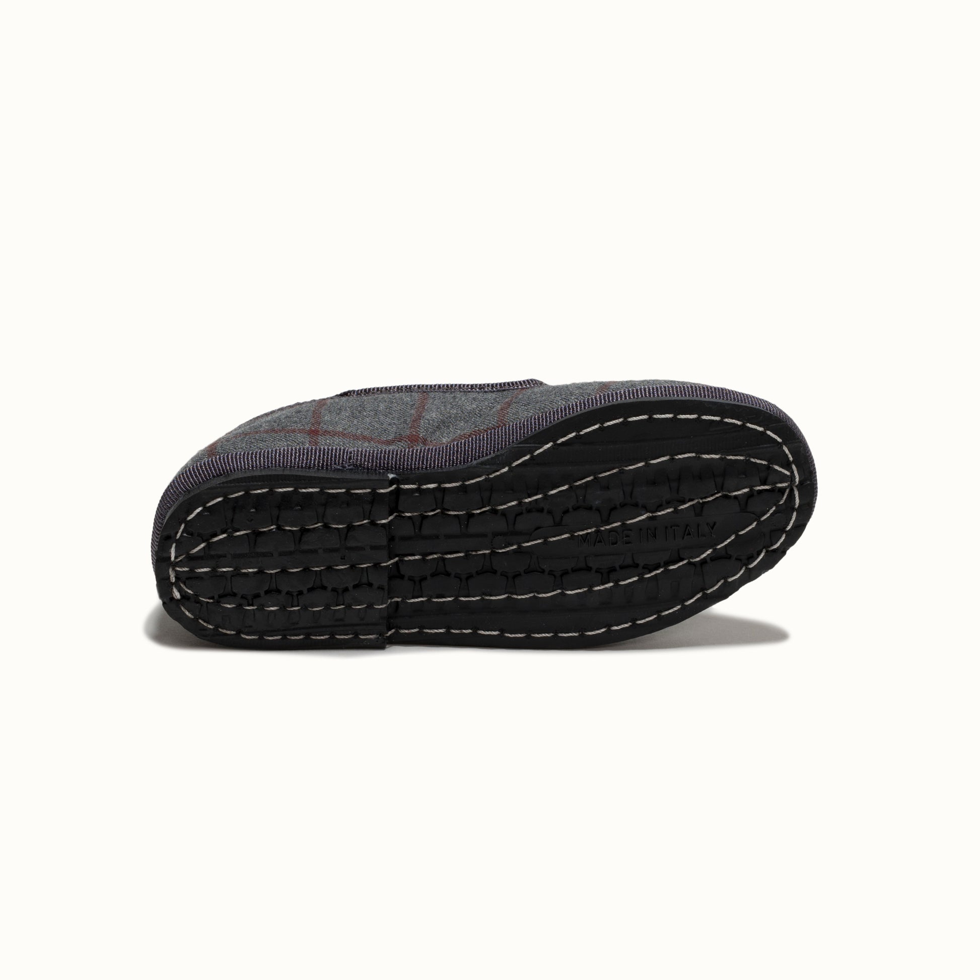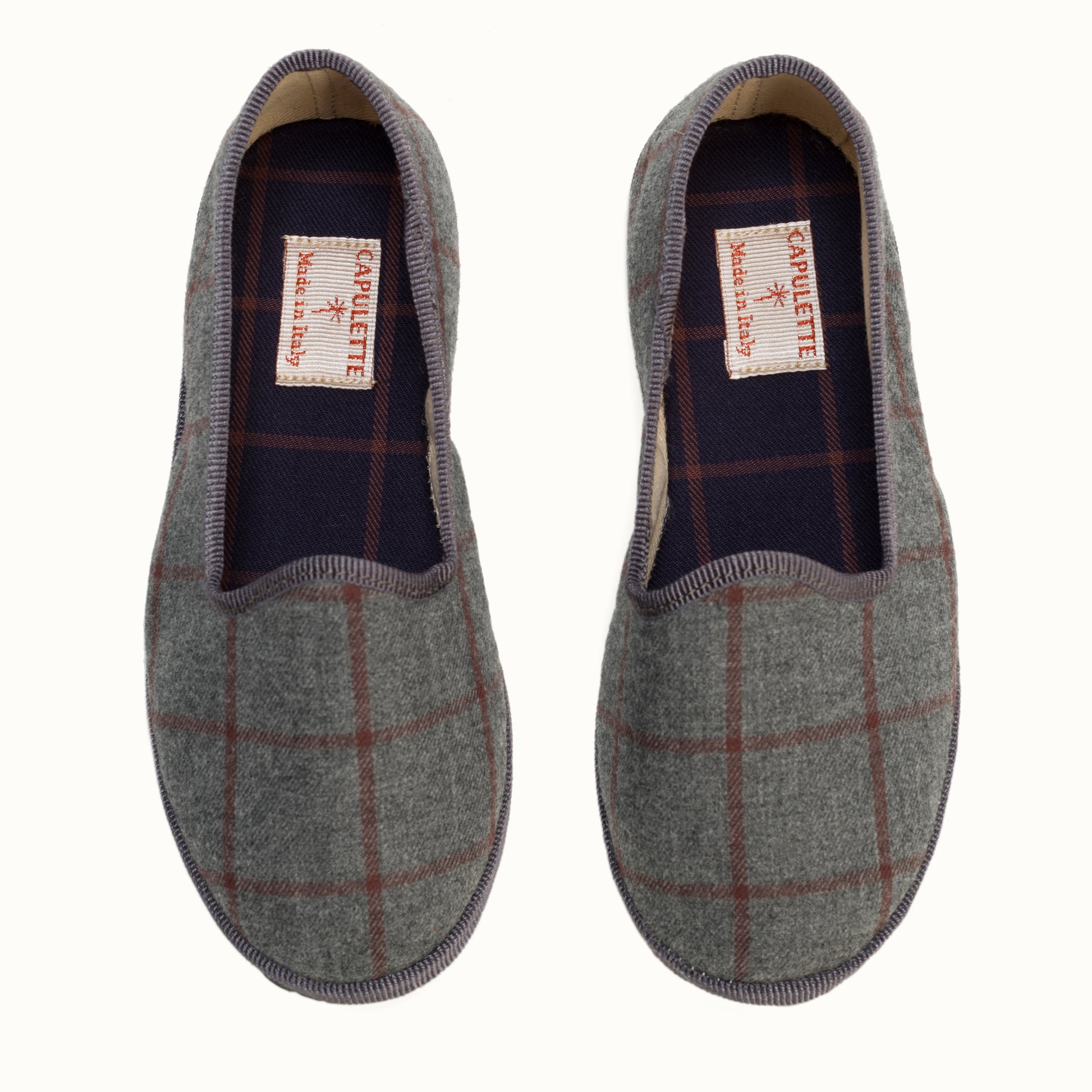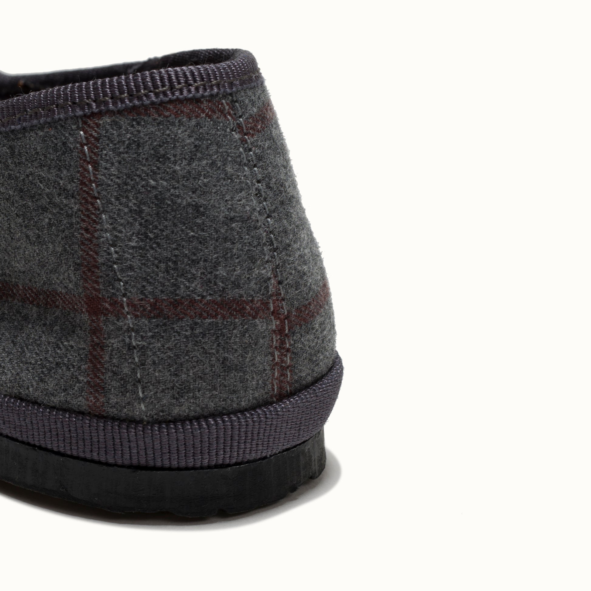 La semelle intérieure est en imprimés quadrillés bleu marine et marron.