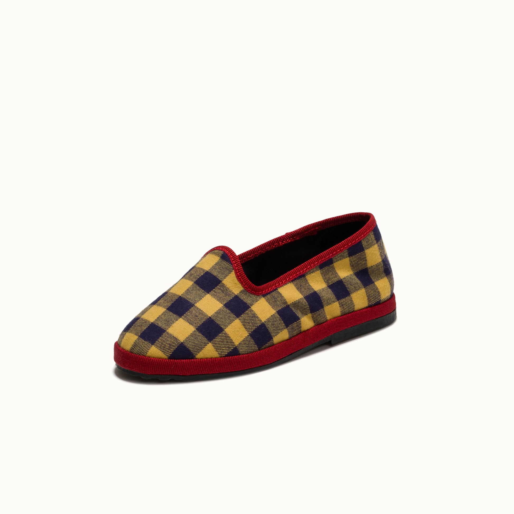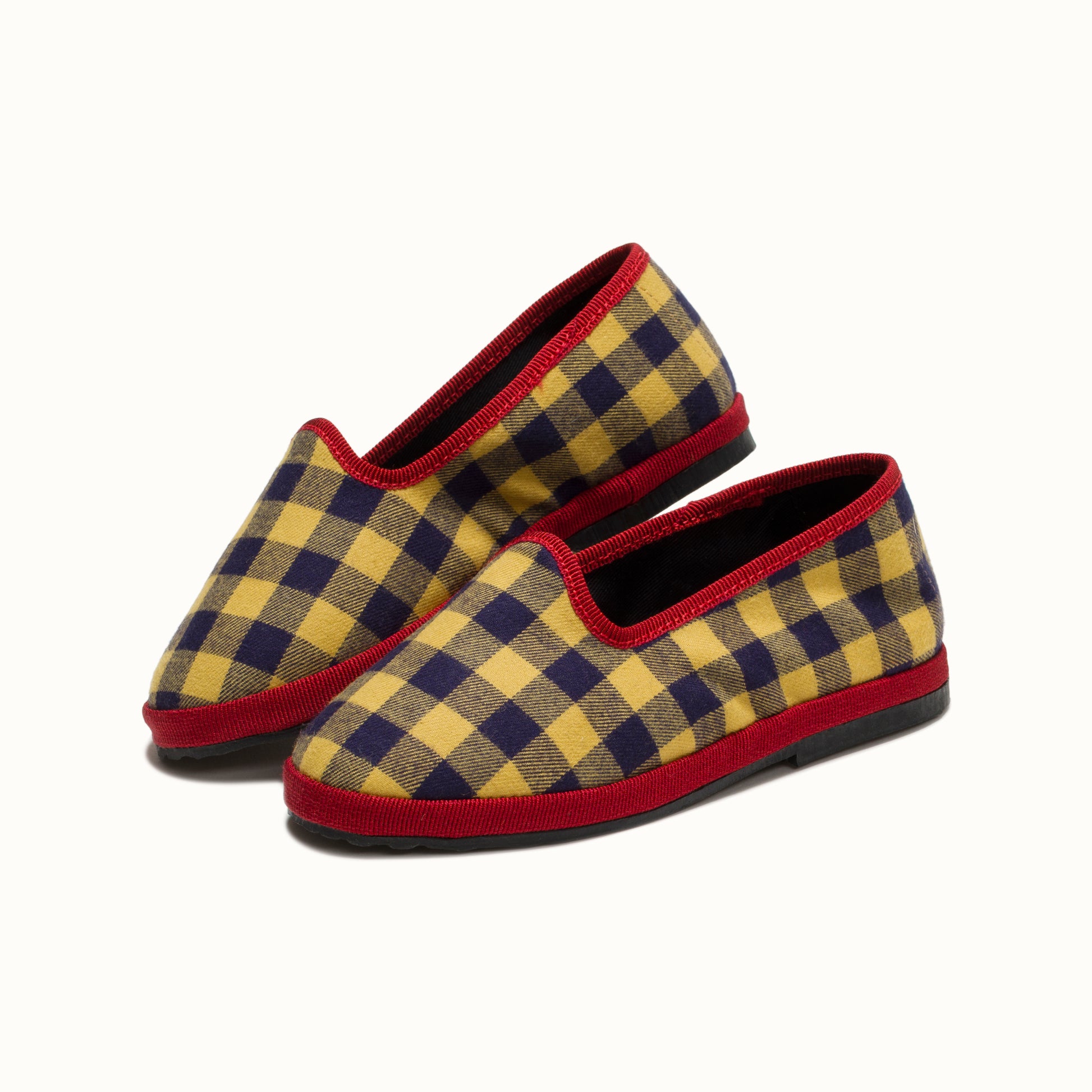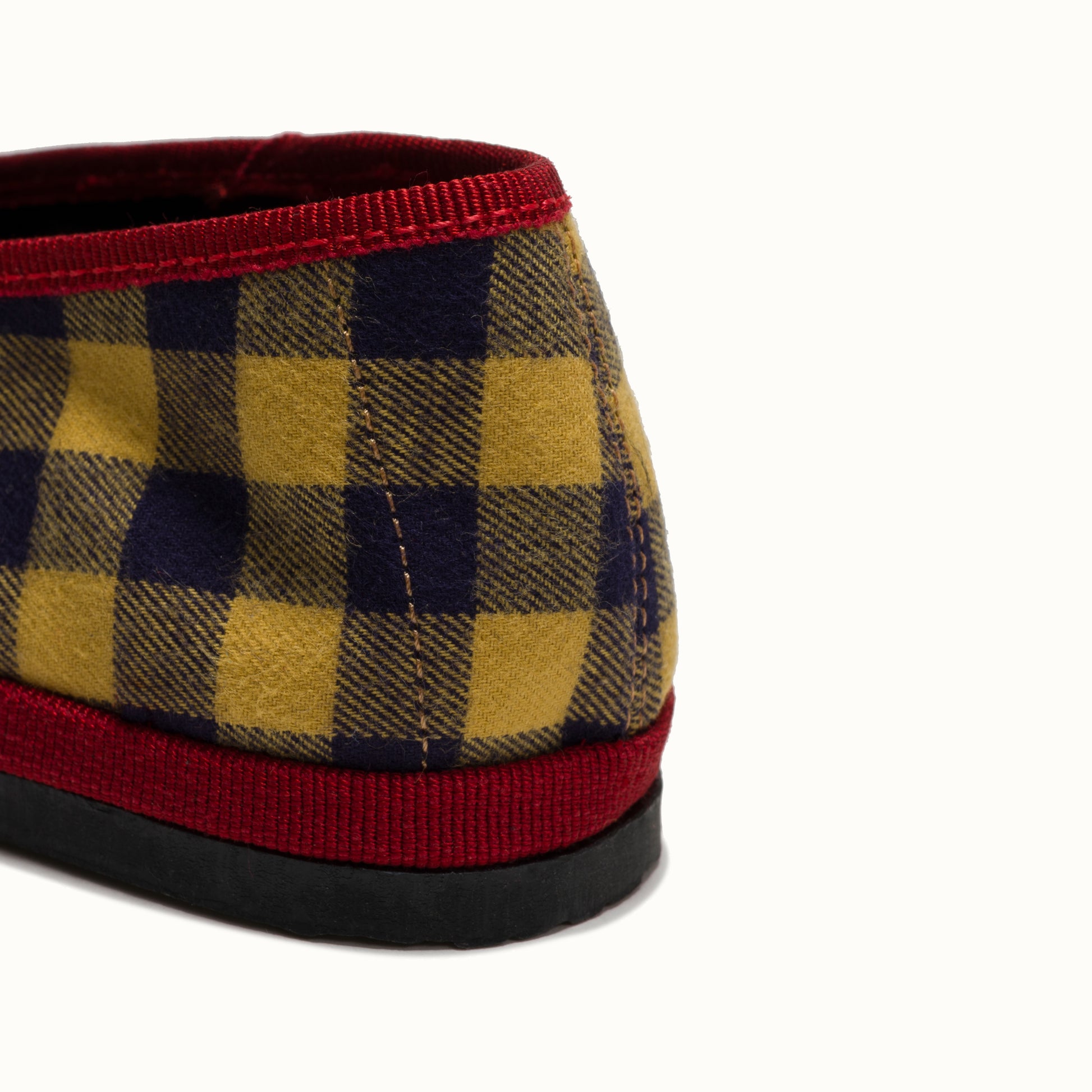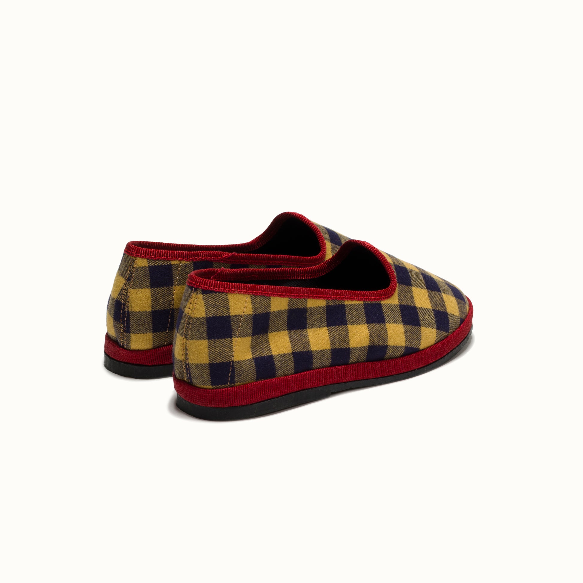 La semelle intérieure est en coton à carreaux vert et bleu marine.