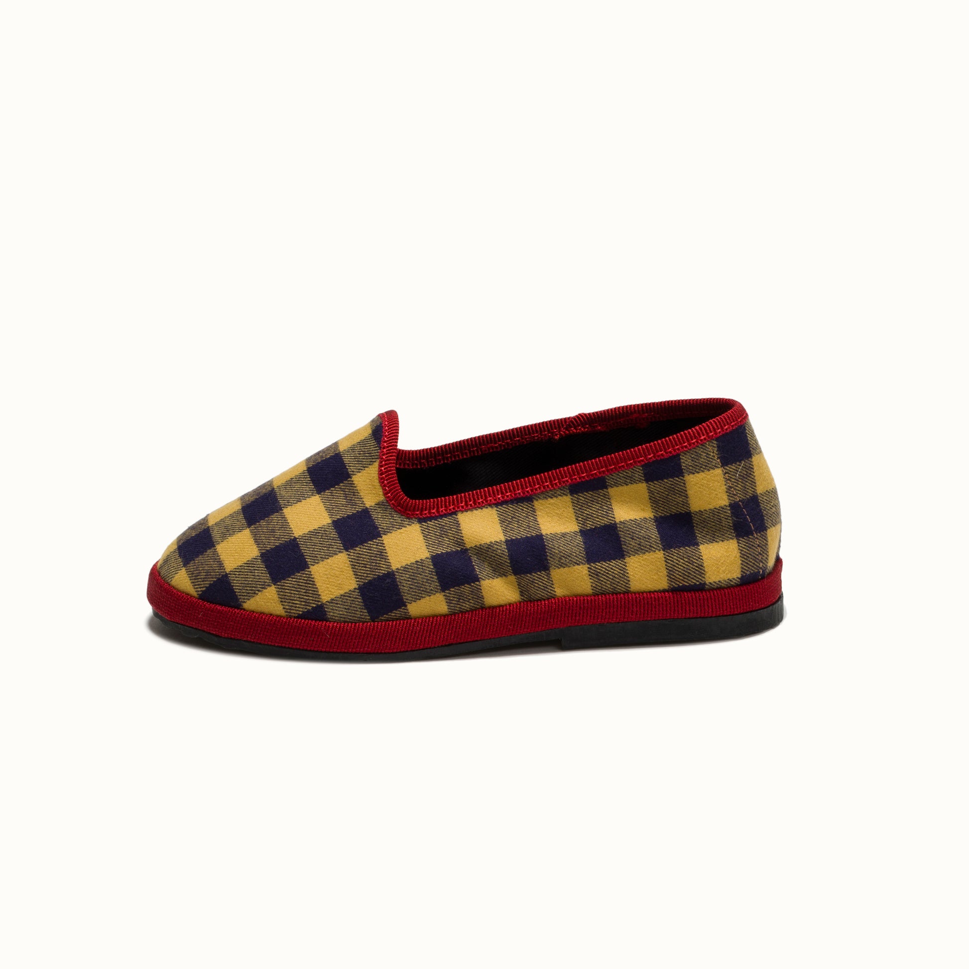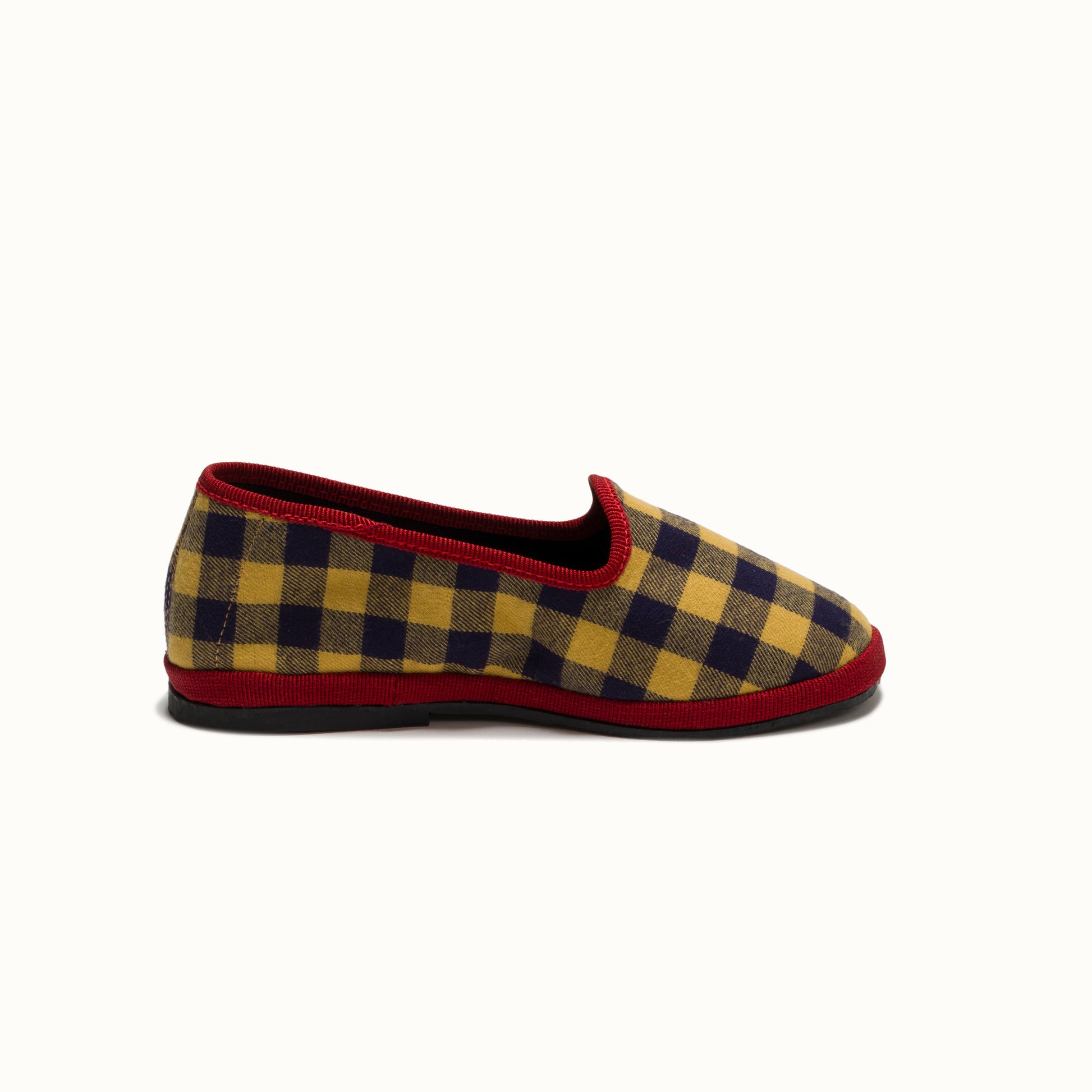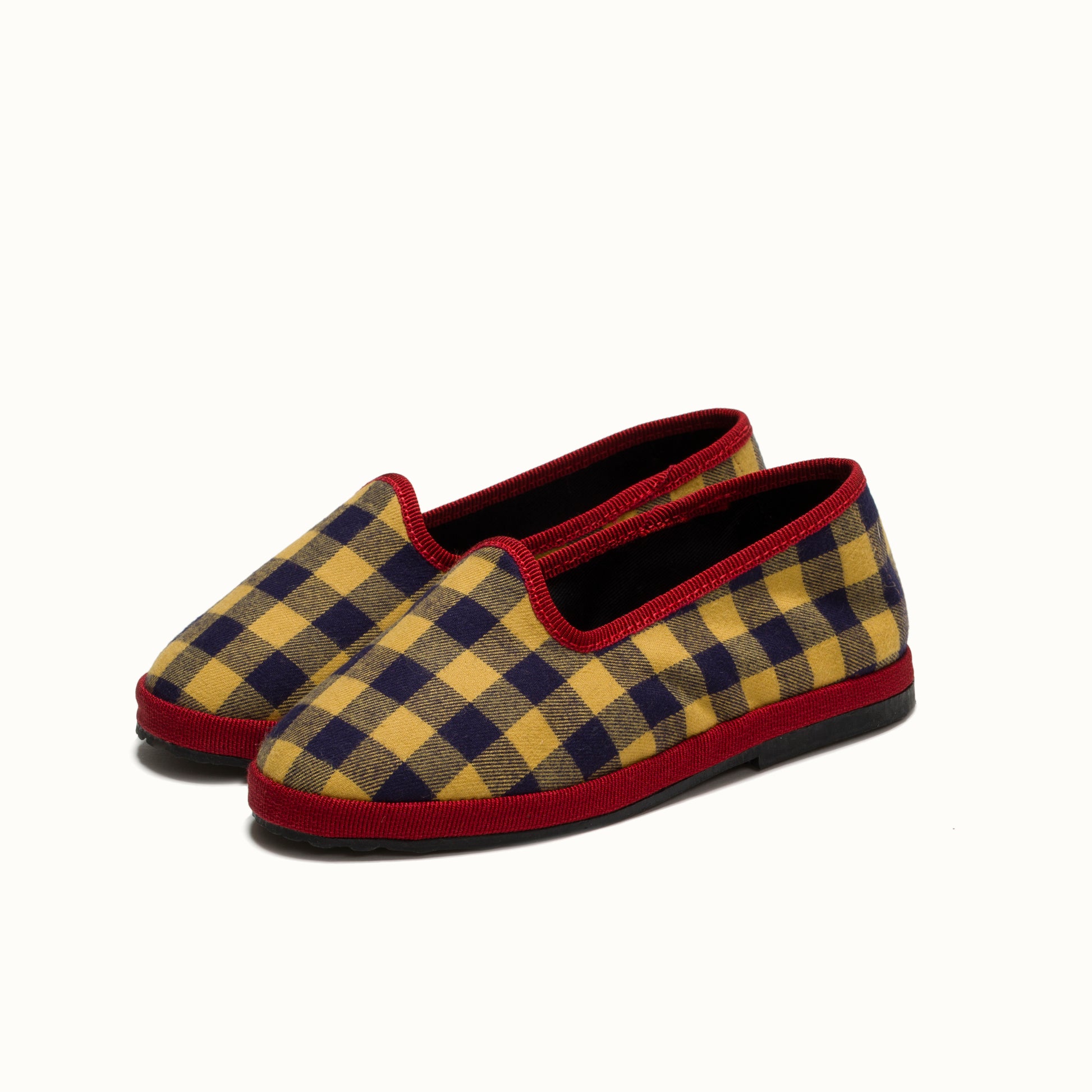 La semelle intérieure est en coton à carreaux vert et bleu marine.