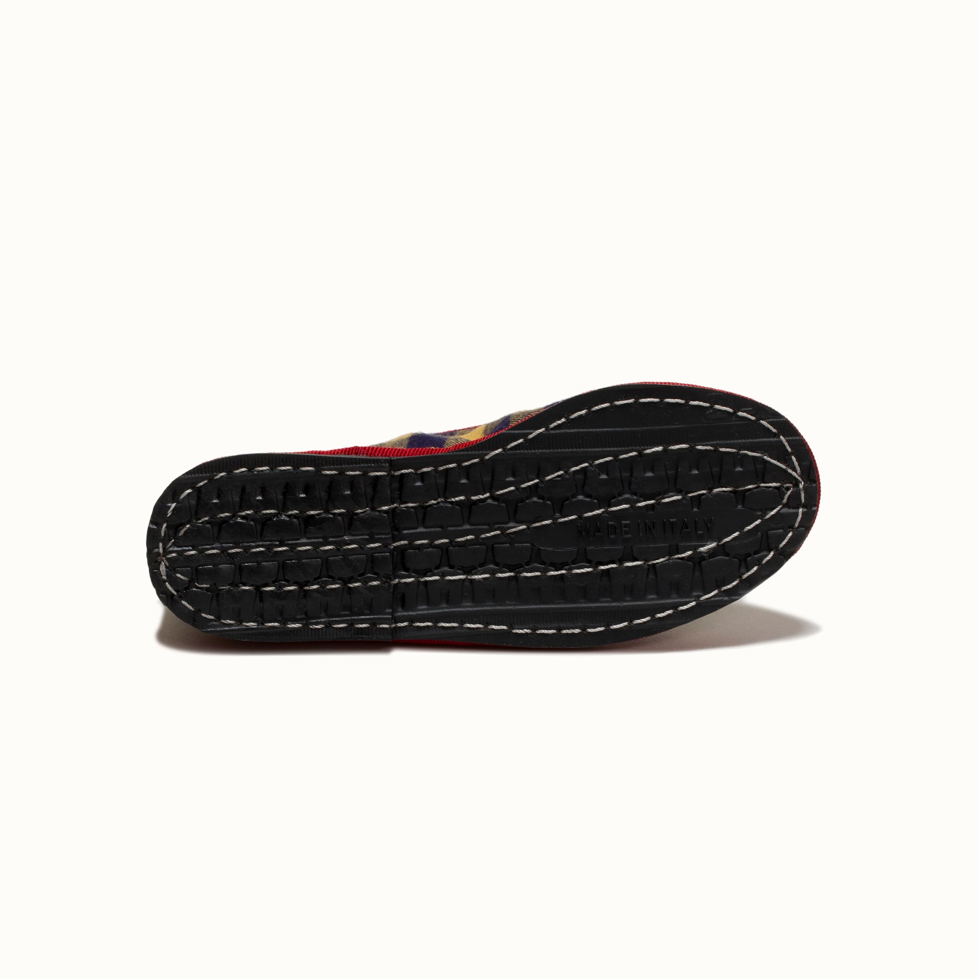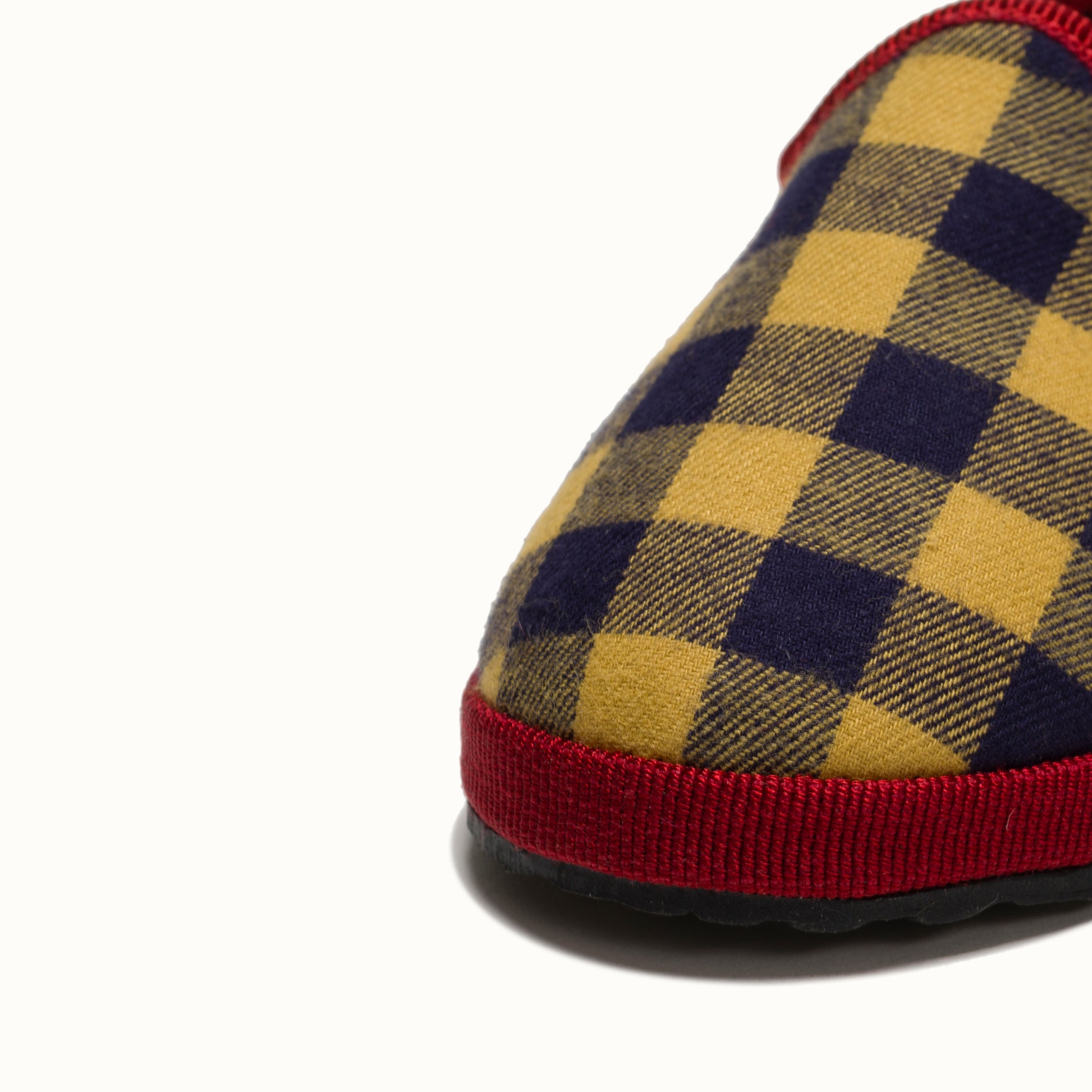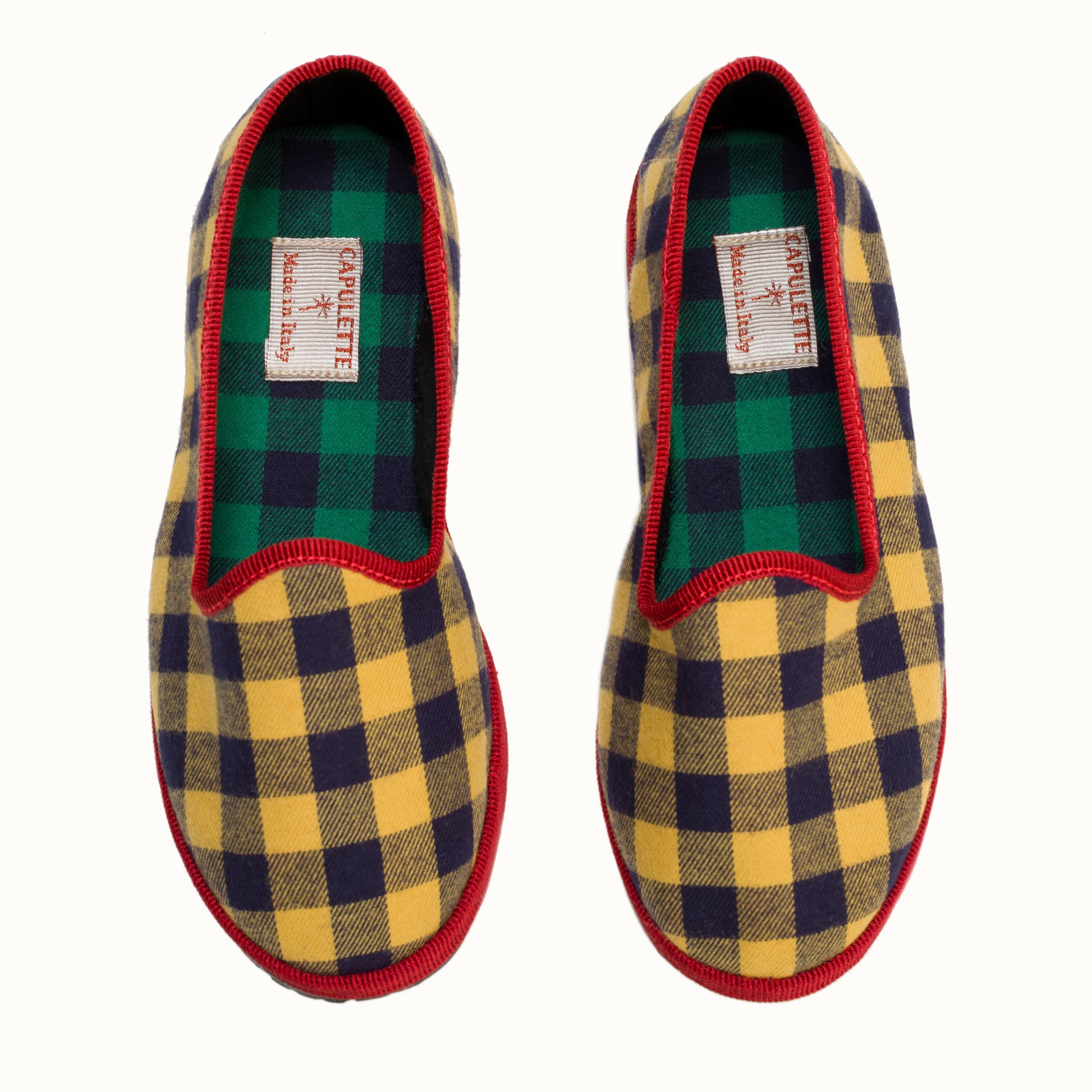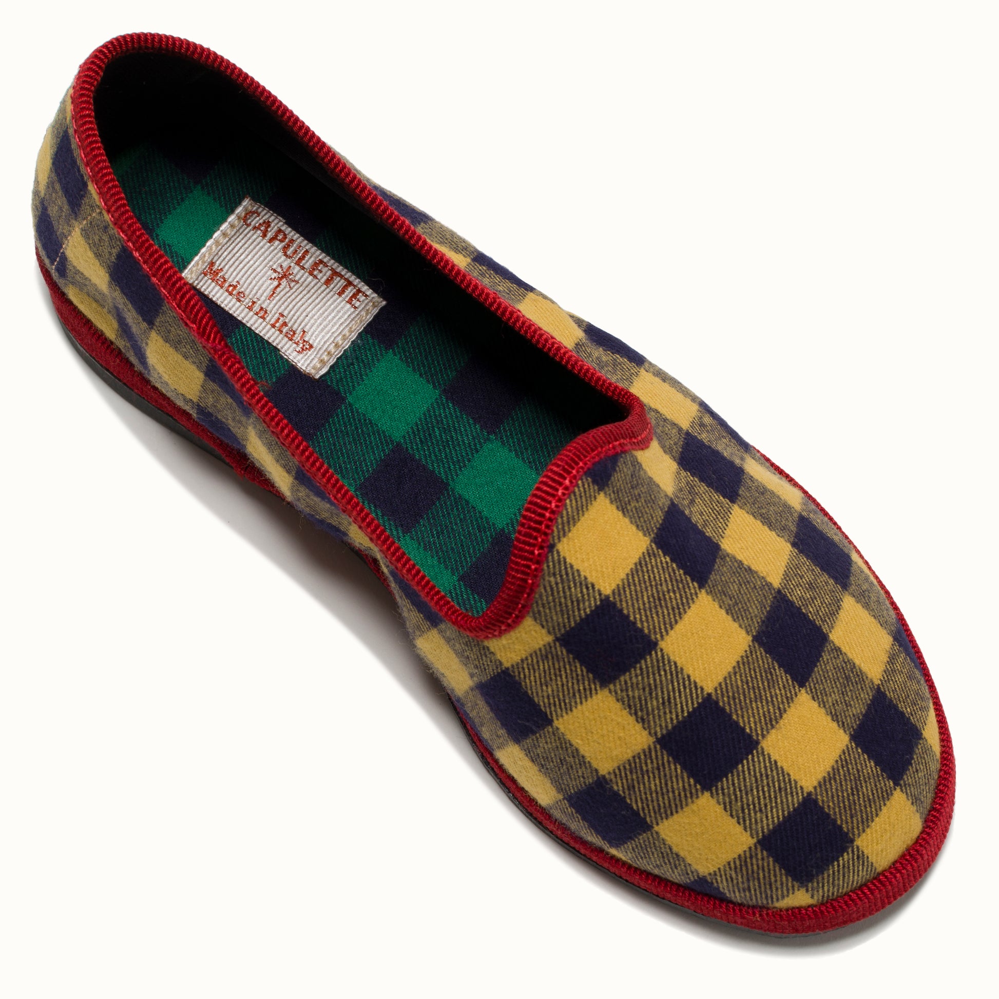 La semelle intérieure est en coton à carreaux vert et bleu marine.