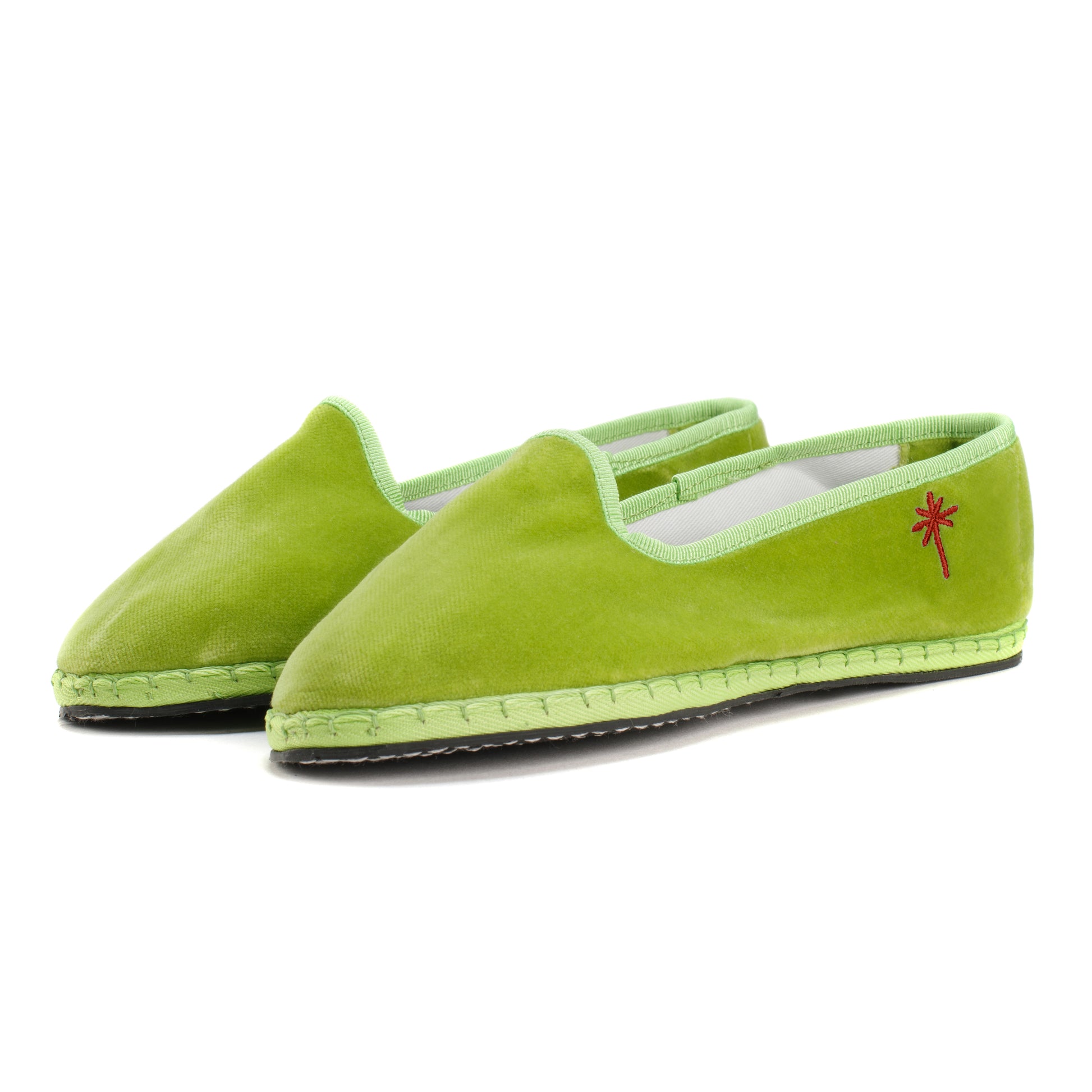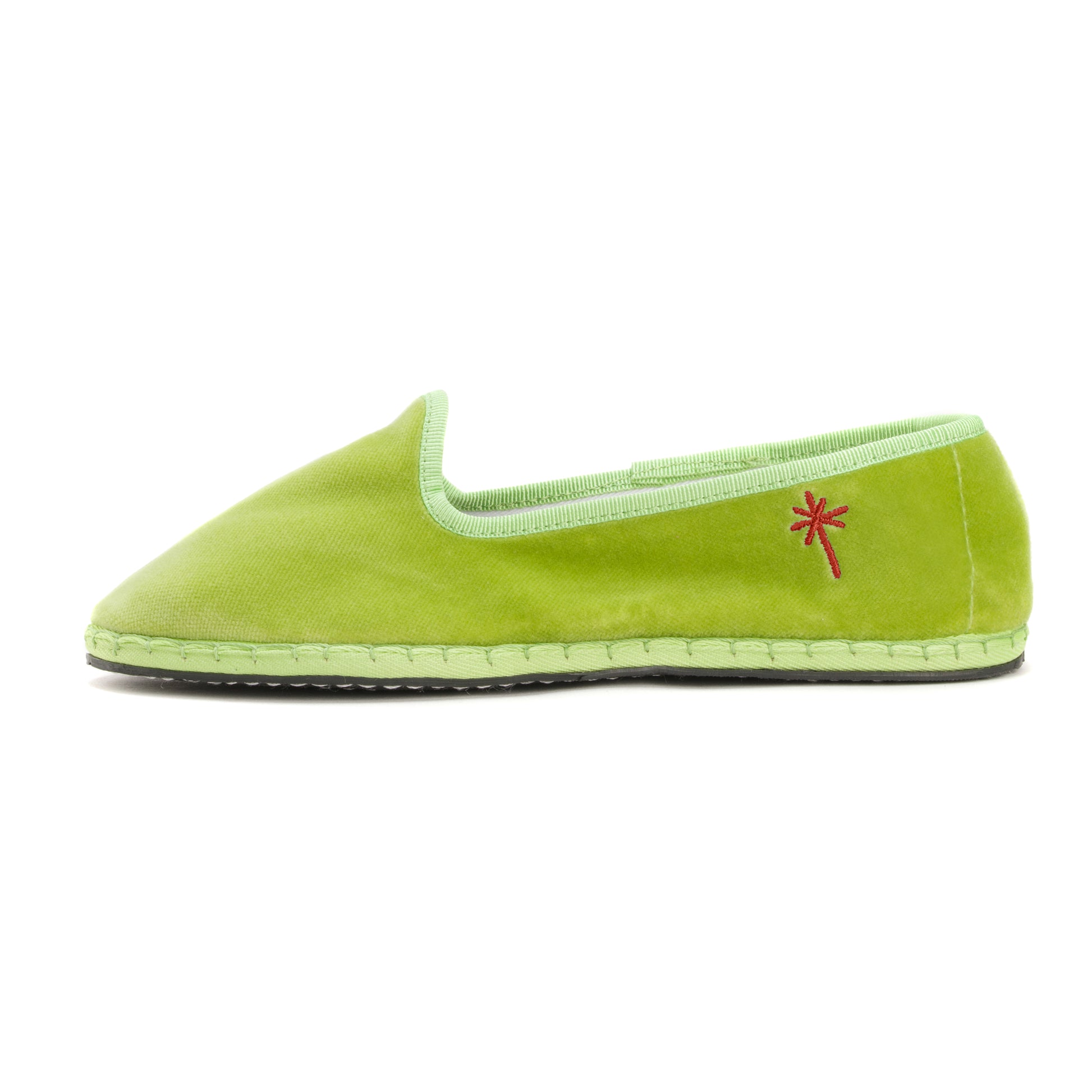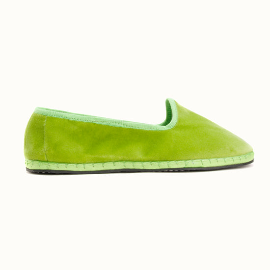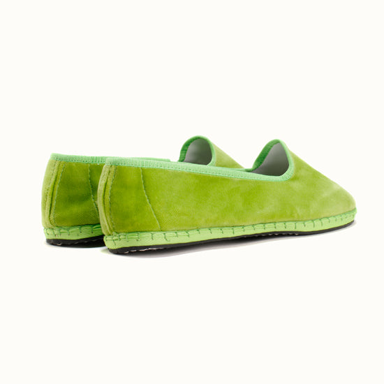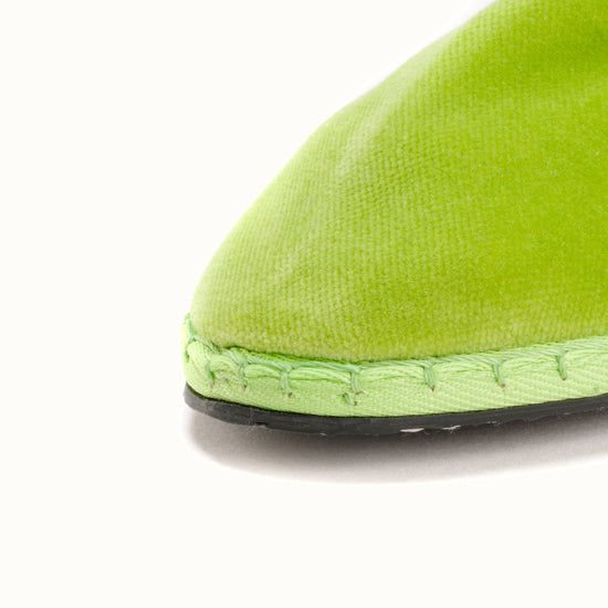 Friulane fabriquée selon la tradition Vénitienne en velours vert pomme et gros grain ton sur ton. La semelle extérieure est en pneu de vélo et la semelle intérieure en coton. Se porte aussi bien à l'intérieur qu'à l'extérieur !