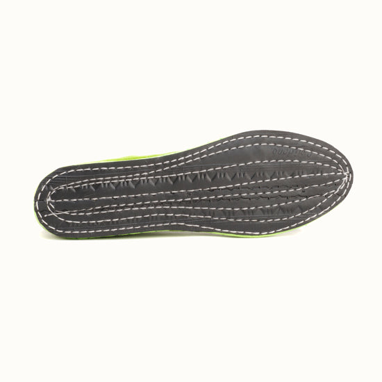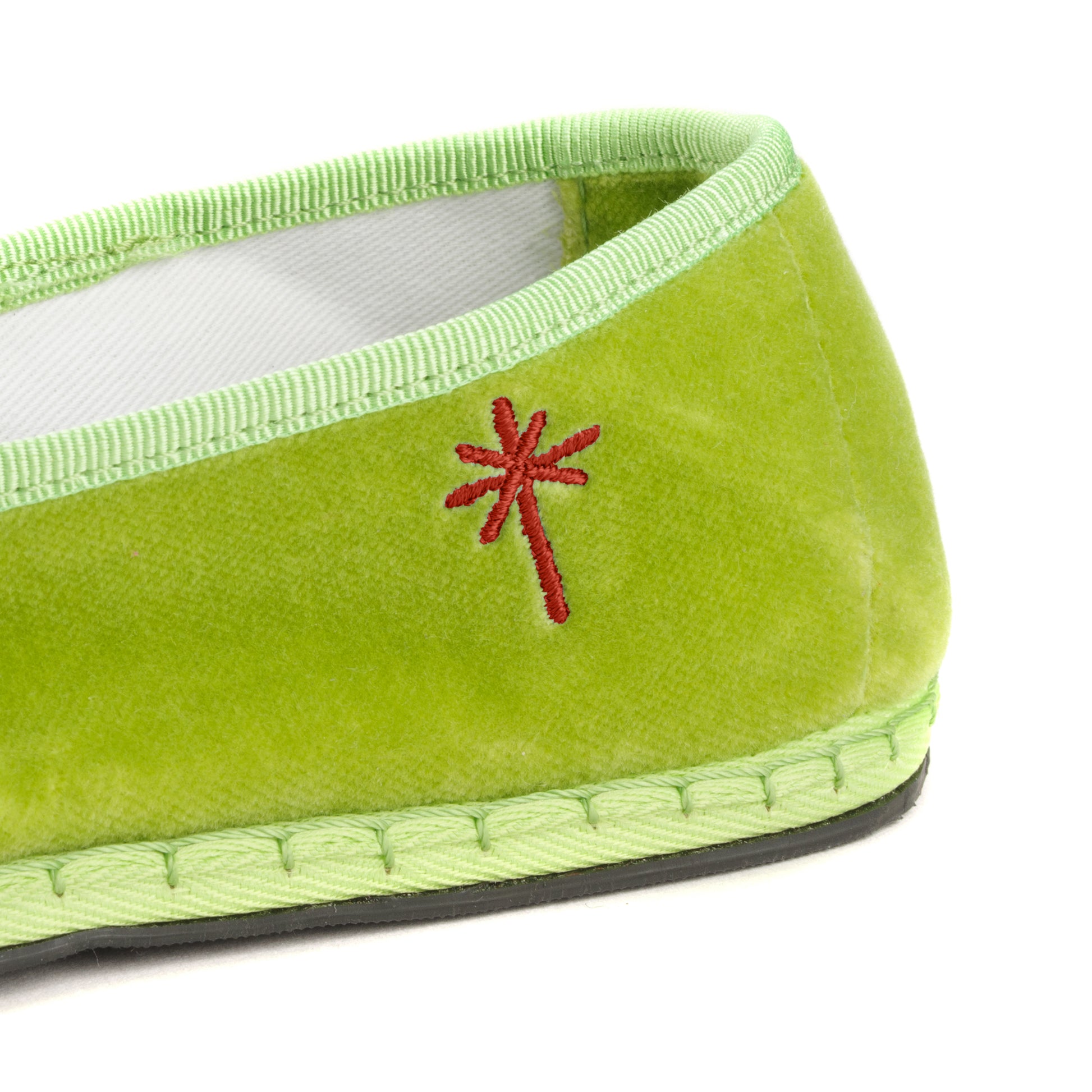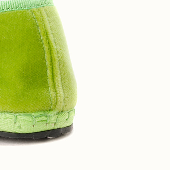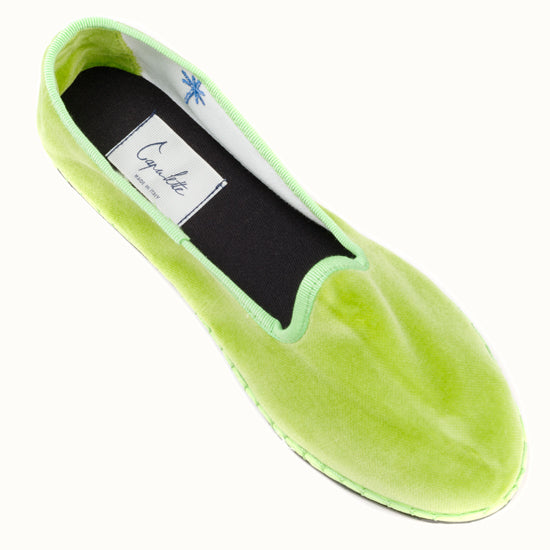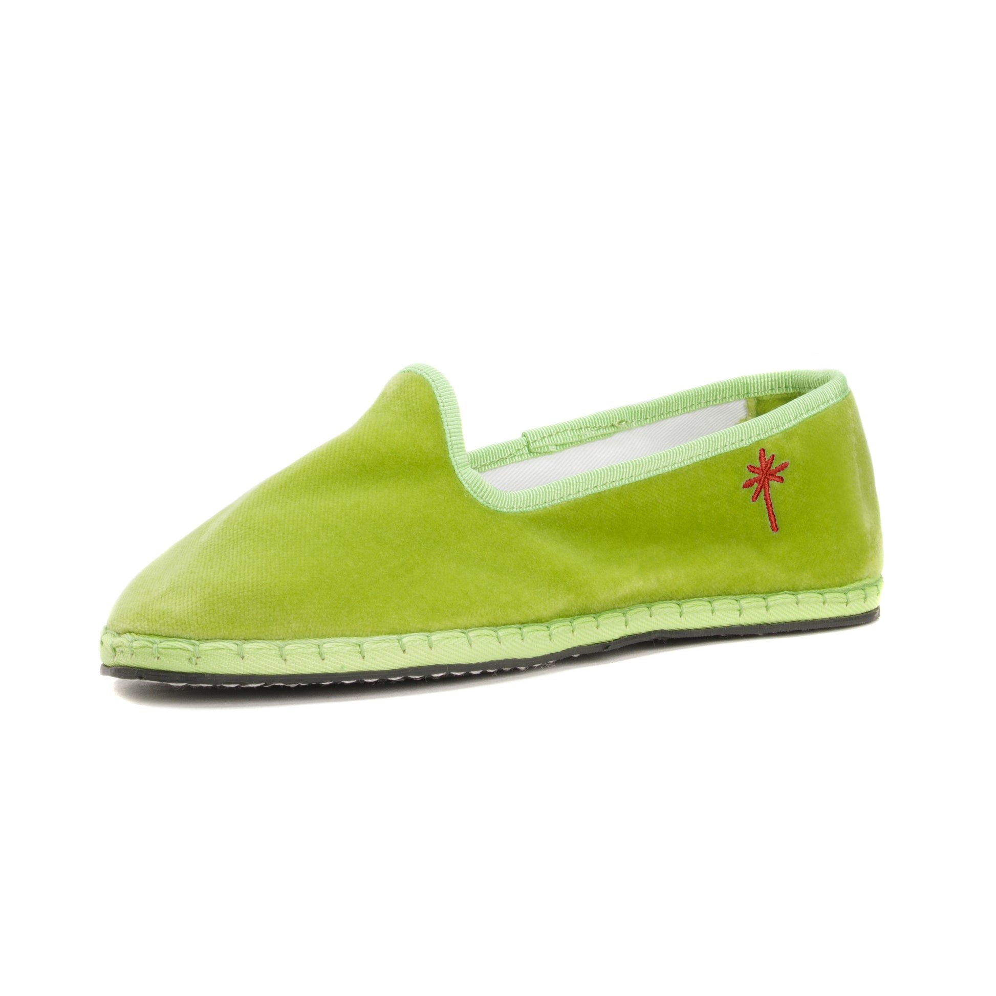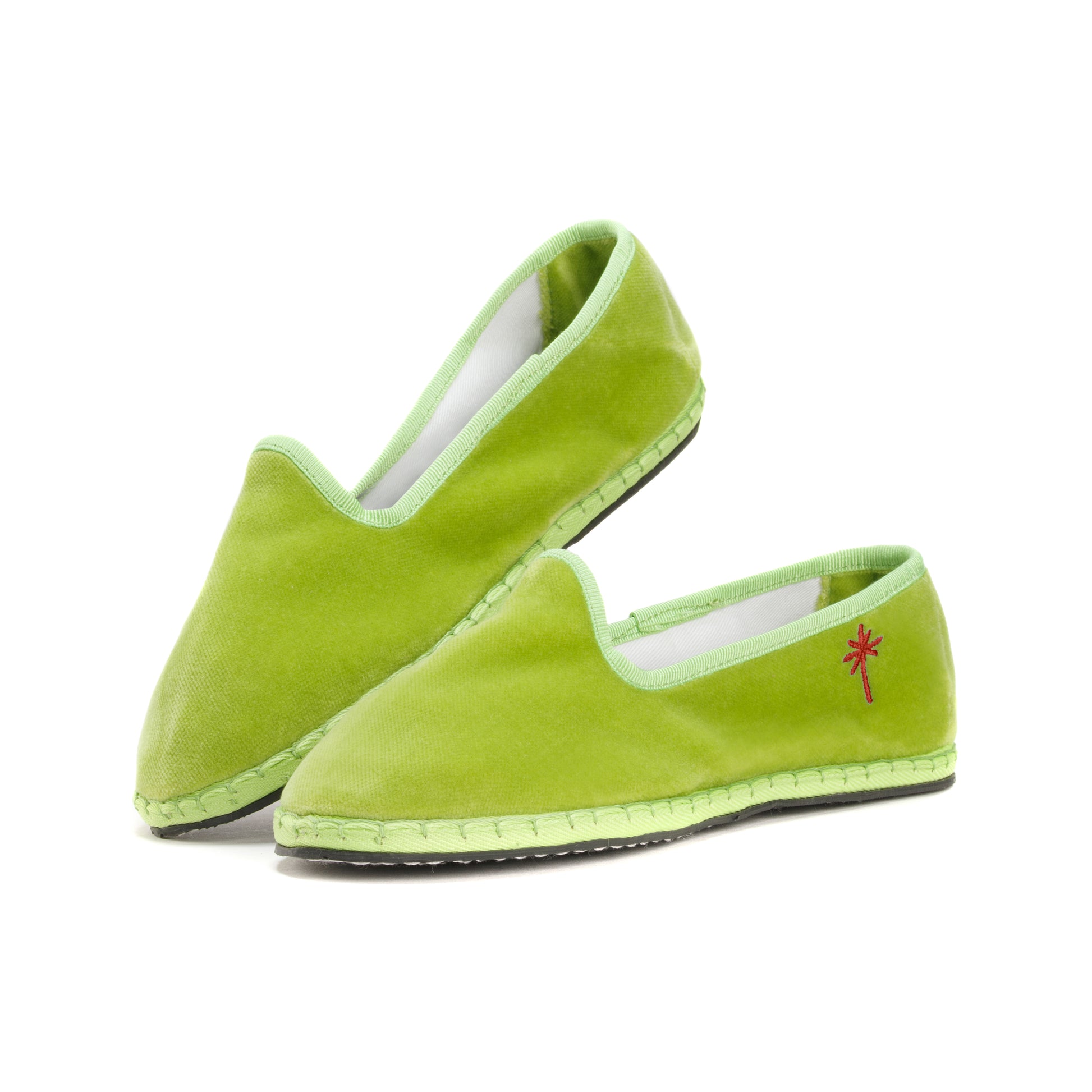 Friulane fabriquée selon la tradition Vénitienne en velours vert pomme et gros grain ton sur ton. La semelle extérieure est en pneu de vélo et la semelle intérieure en coton. Se porte aussi bien à l'intérieur qu'à l'extérieur !