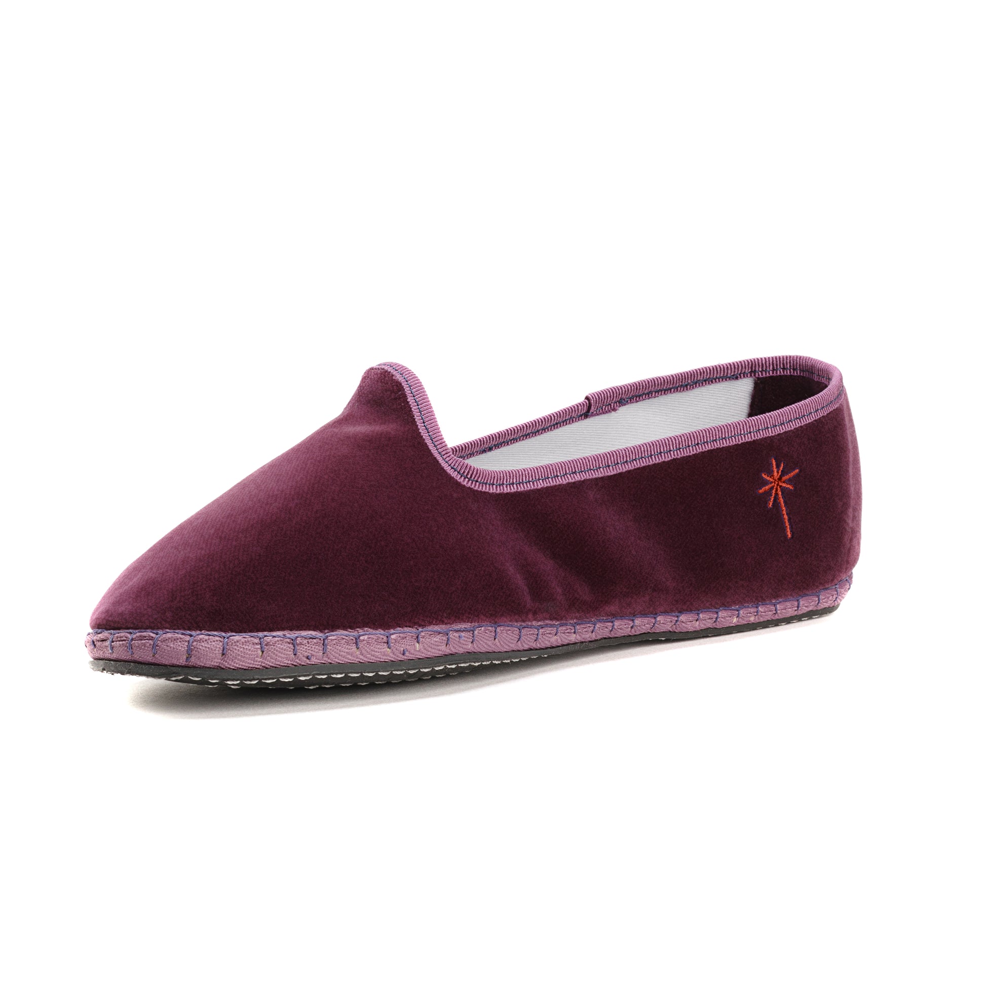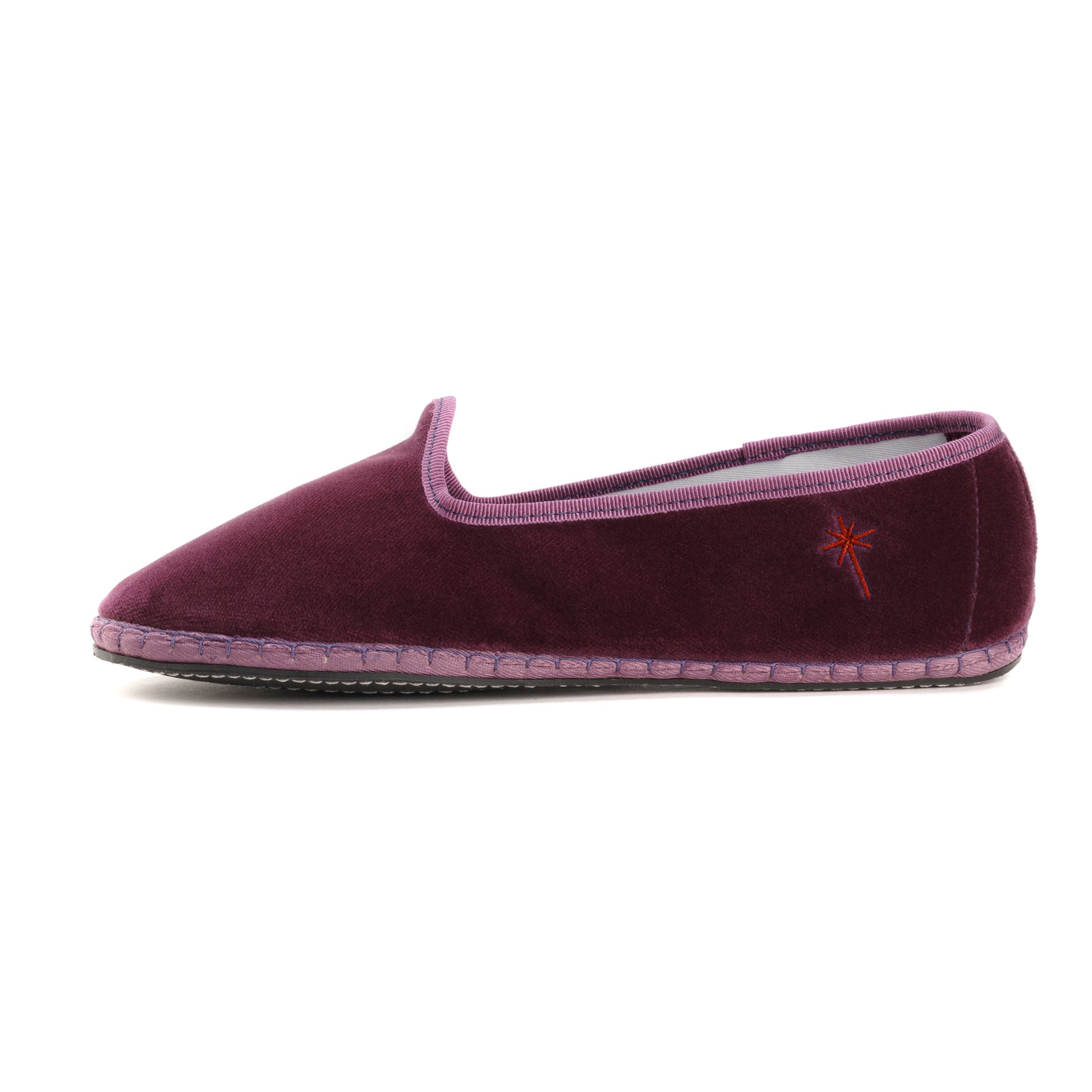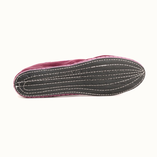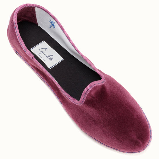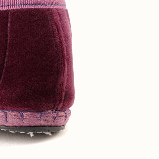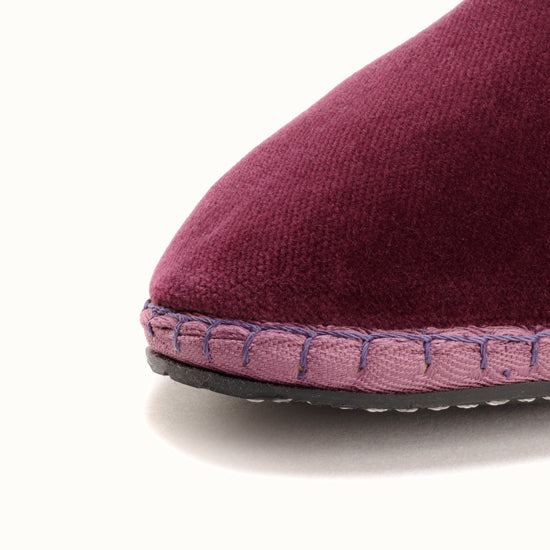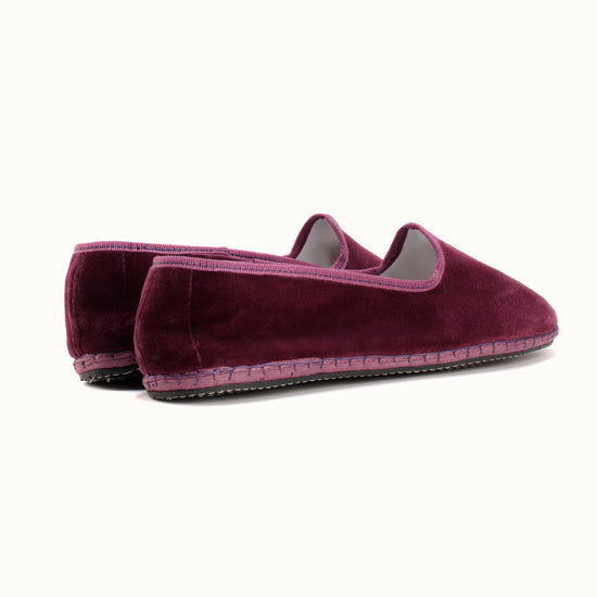 Friulane fabriquée selon la tradition Vénitienne en velours prune et gros grain ton sur ton. La semelle extérieure est en pneu de vélo et la semelle intérieure en coton. Se porte aussi bien à l'intérieur qu'à l'extérieur !