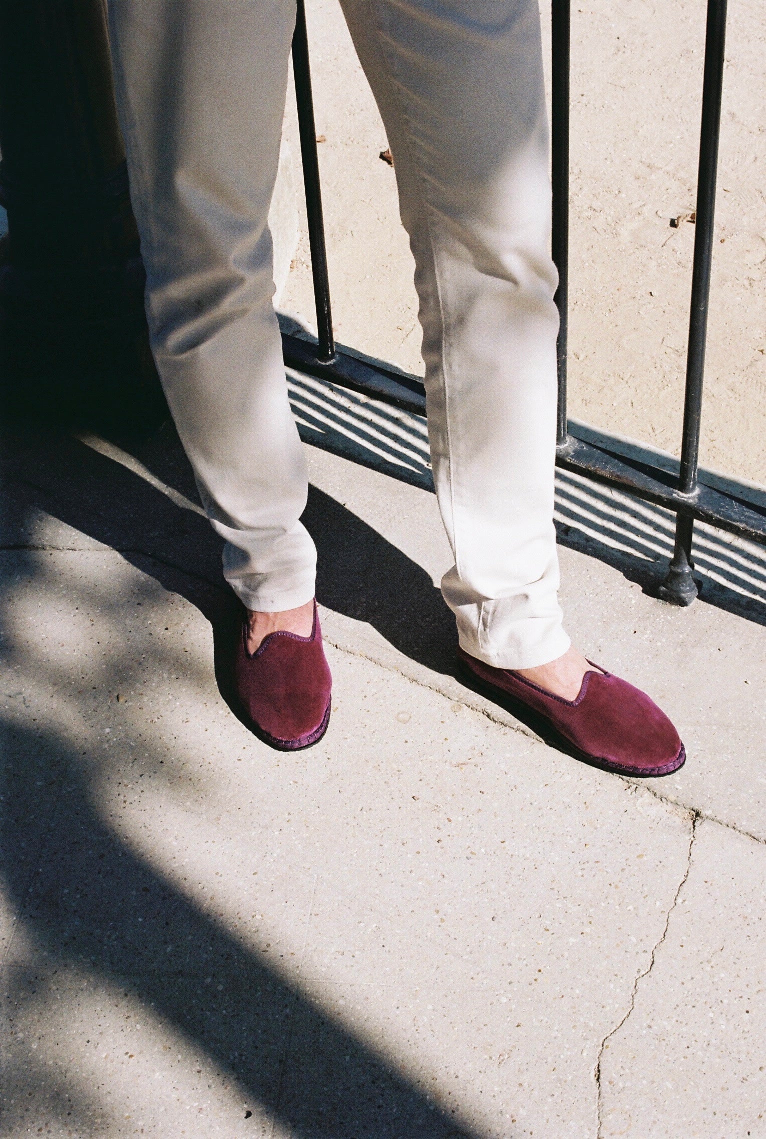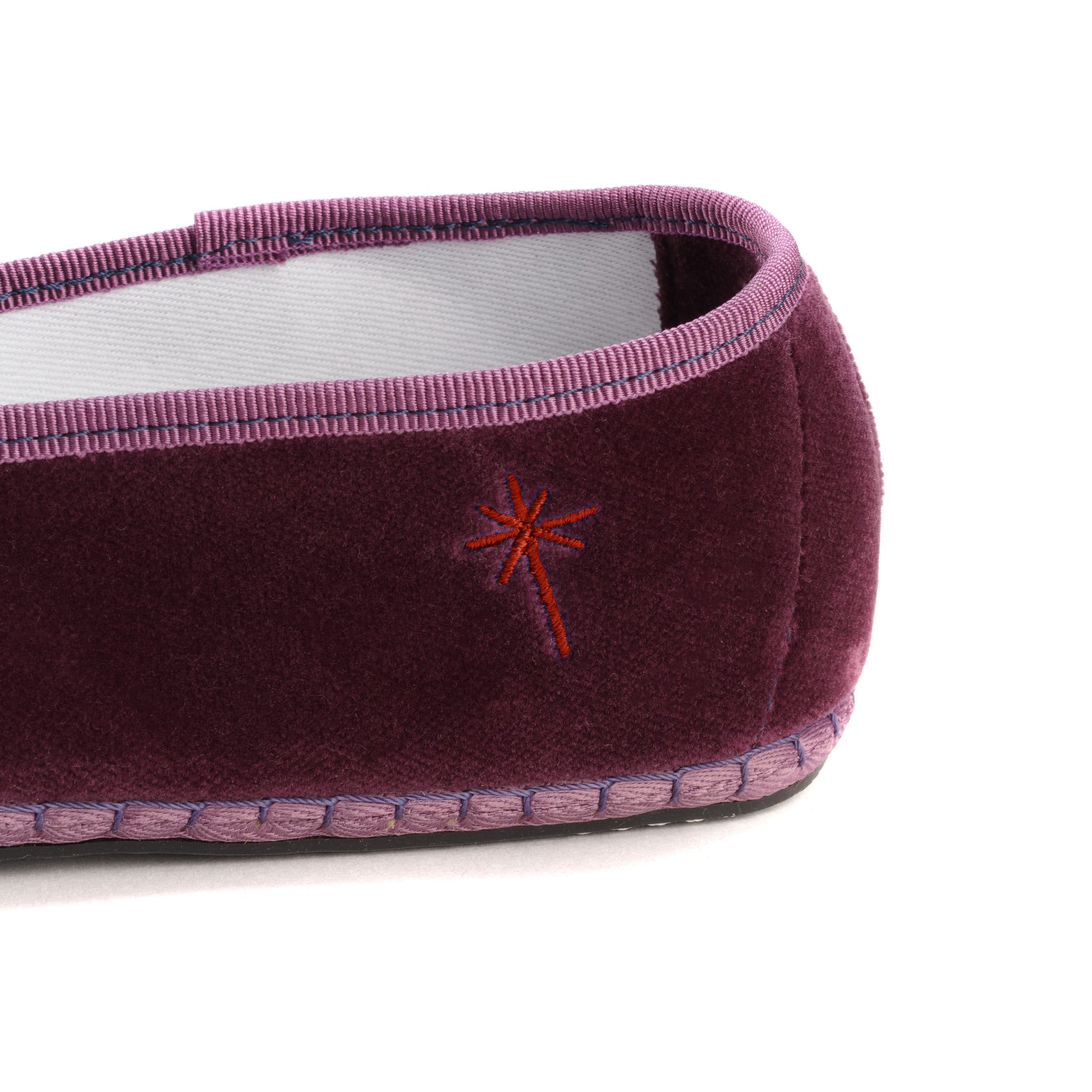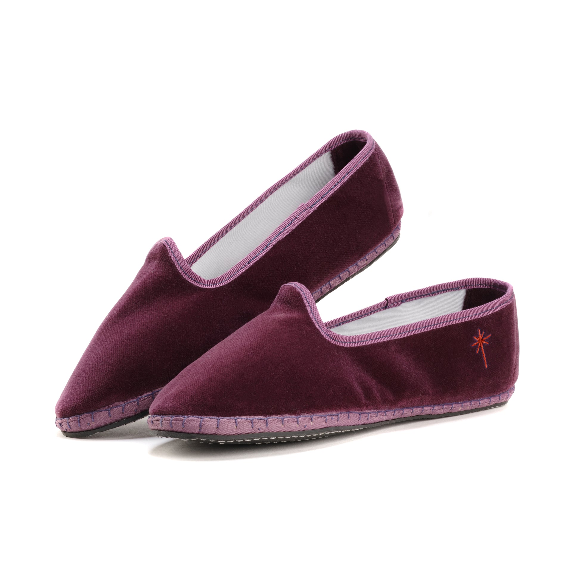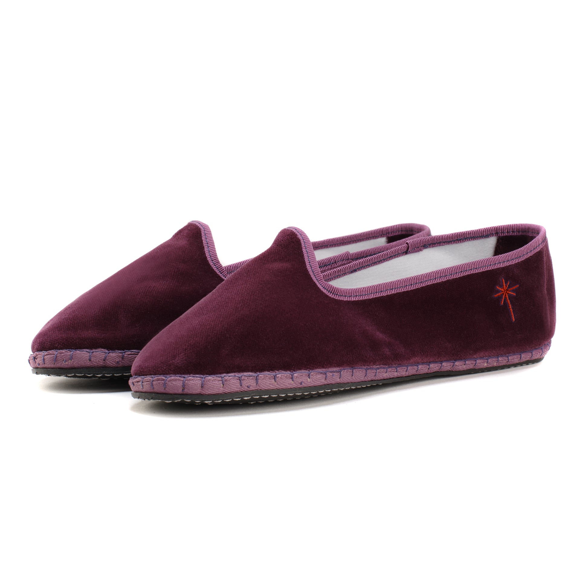 Friulane fabriquée selon la tradition Vénitienne en velours prune et gros grain ton sur ton. La semelle extérieure est en pneu de vélo et la semelle intérieure en coton. Se porte aussi bien à l'intérieur qu'à l'extérieur !