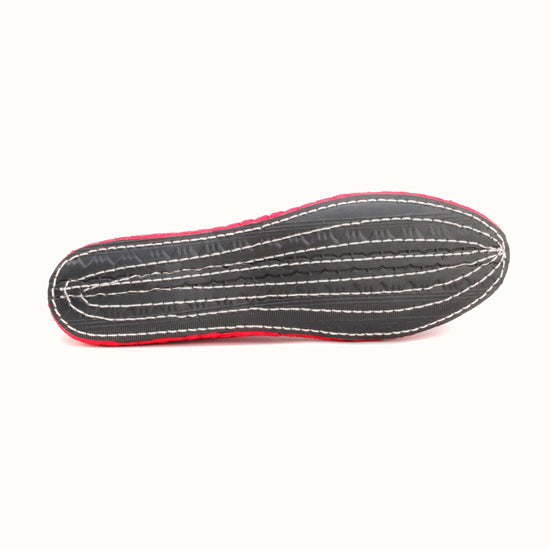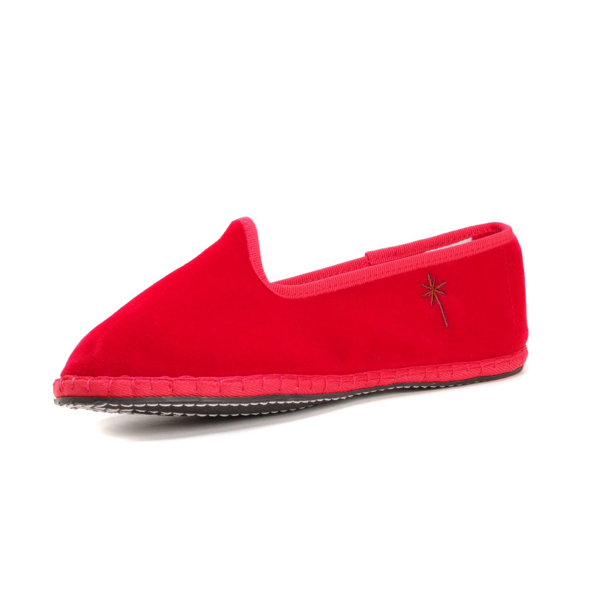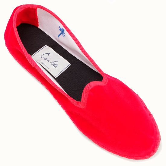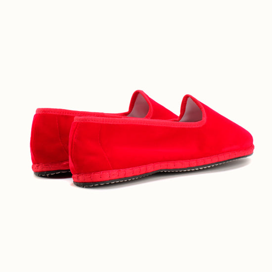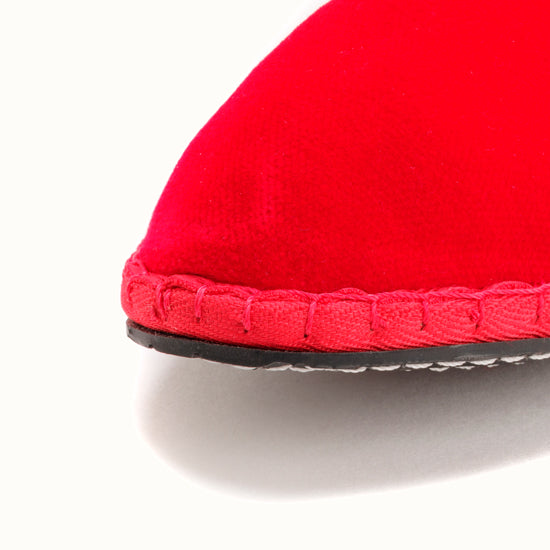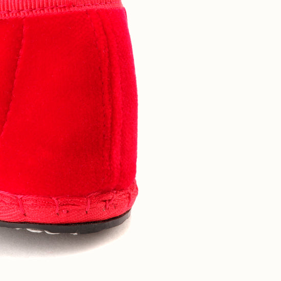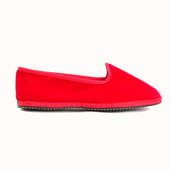 Friulane fabriquée selon la tradition Vénitienne en velours rouge coquelicot et gros grain ton sur ton. La semelle extérieure est en pneu de vélo et la semelle intérieure en coton. Se porte aussi bien à l'intérieur qu'à l'extérieur !
