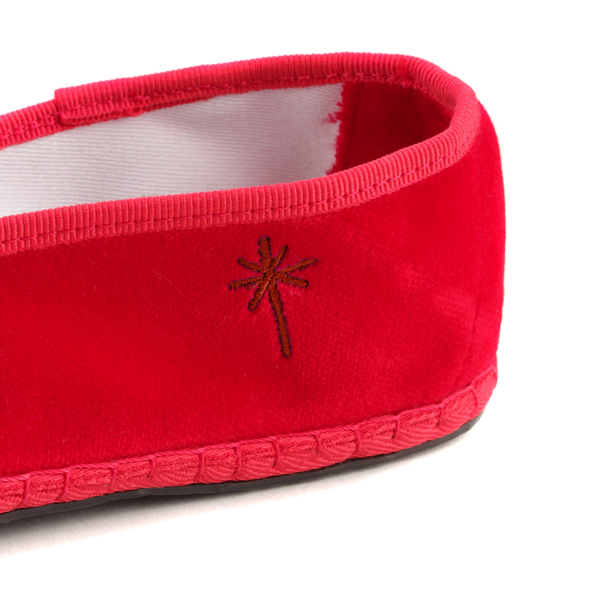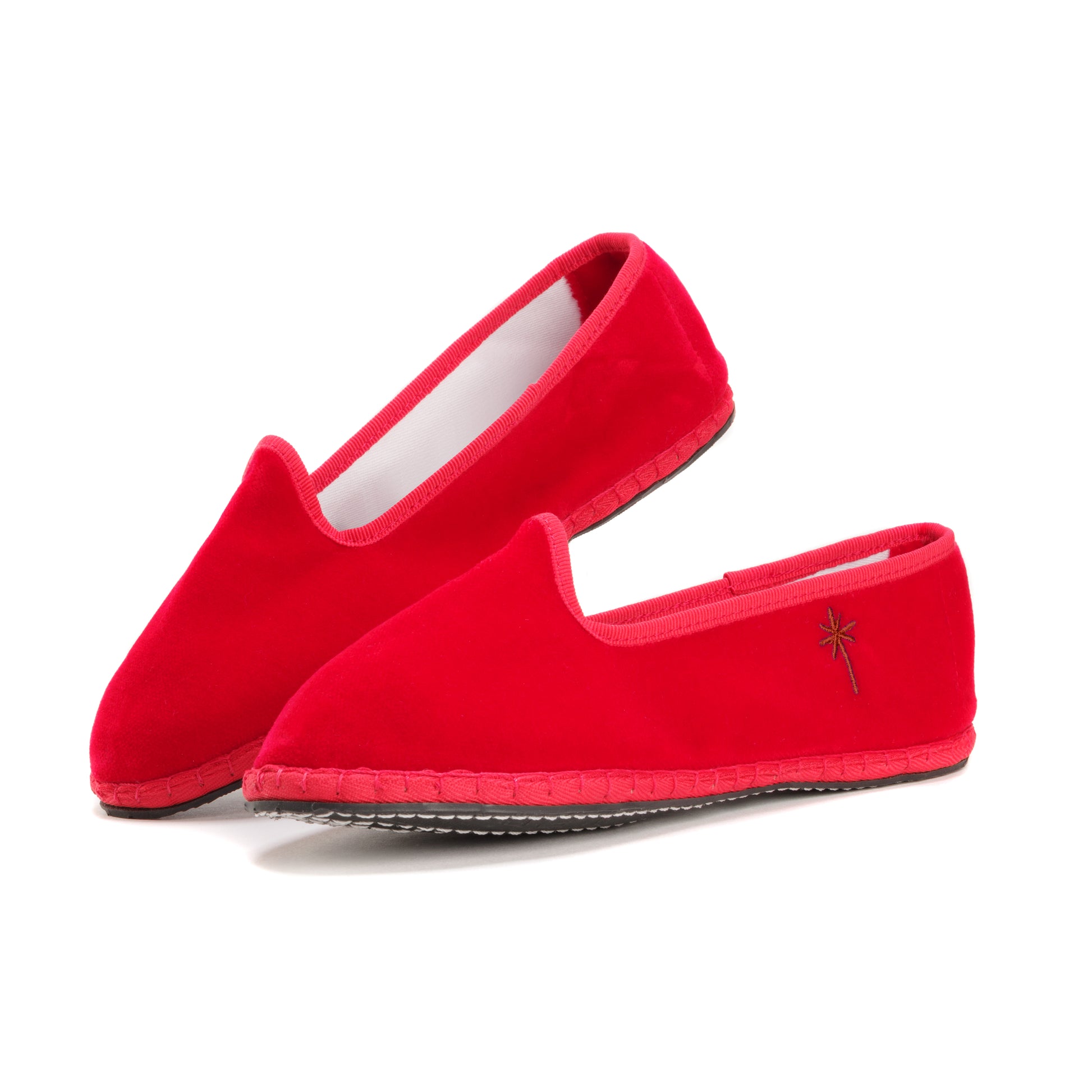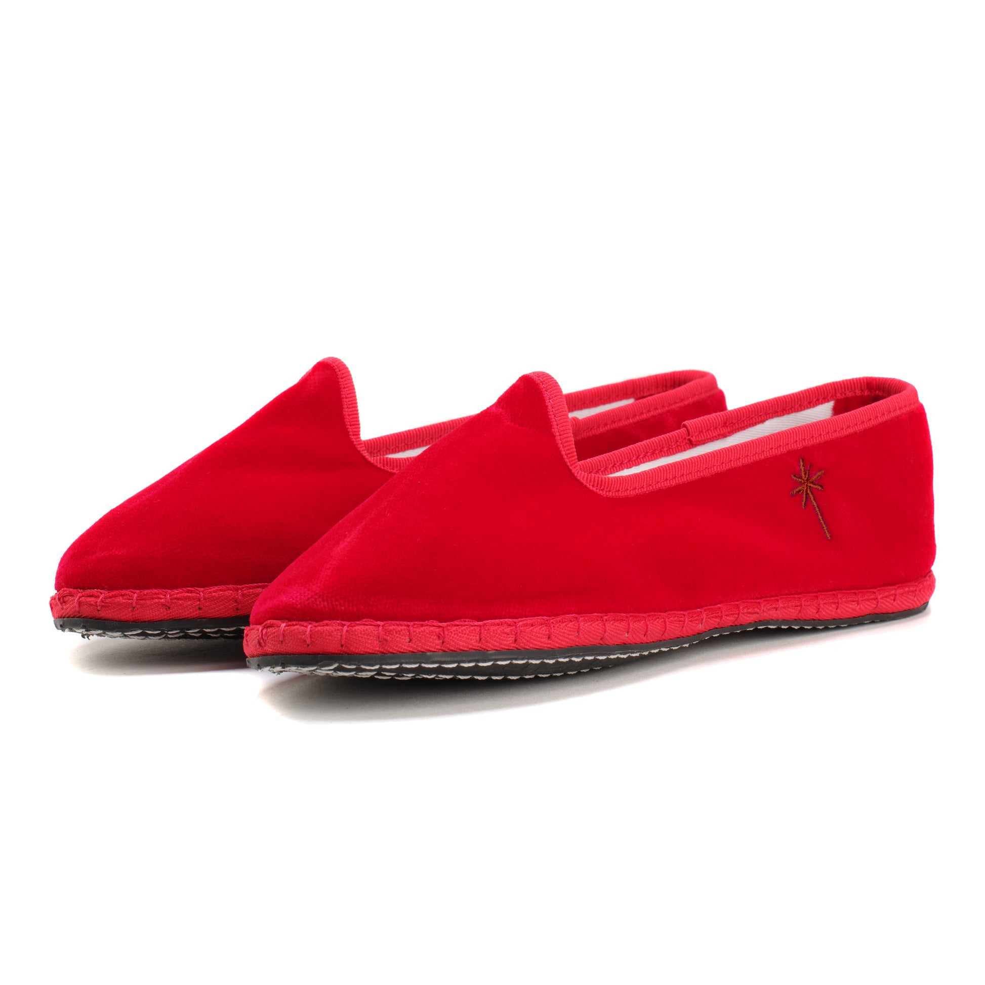 Friulane fabriquée selon la tradition Vénitienne en velours rouge coquelicot et gros grain ton sur ton. La semelle extérieure est en pneu de vélo et la semelle intérieure en coton. Se porte aussi bien à l'intérieur qu'à l'extérieur !