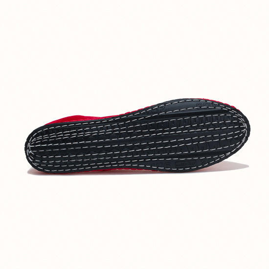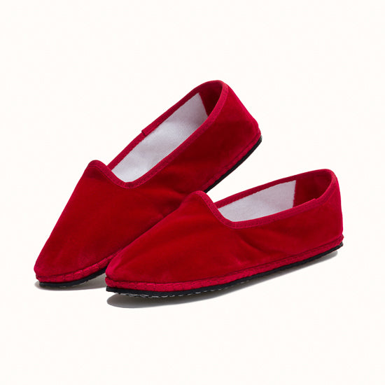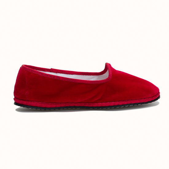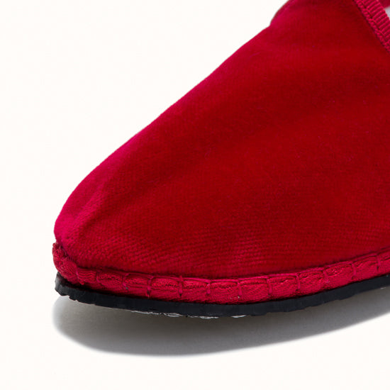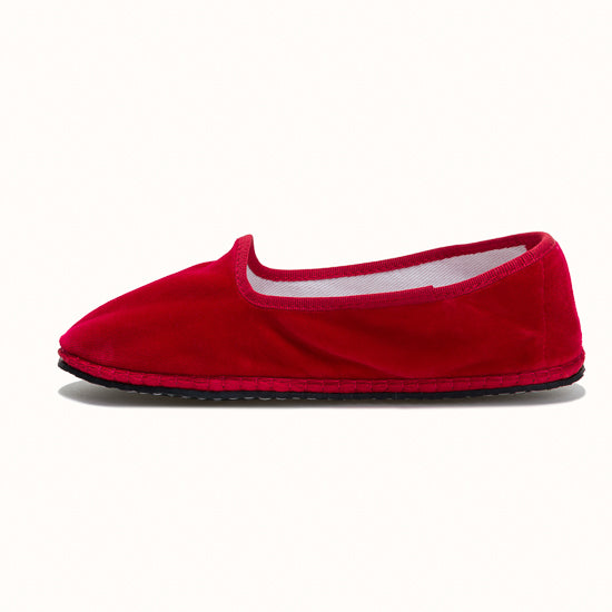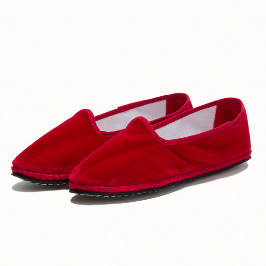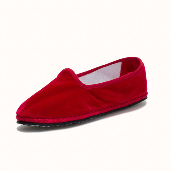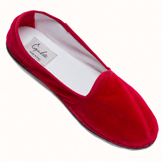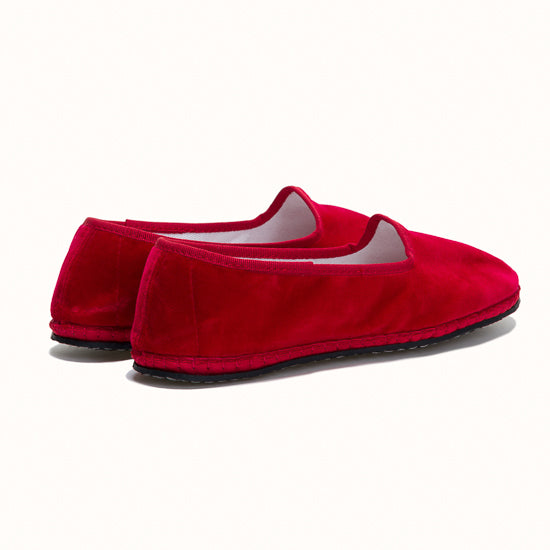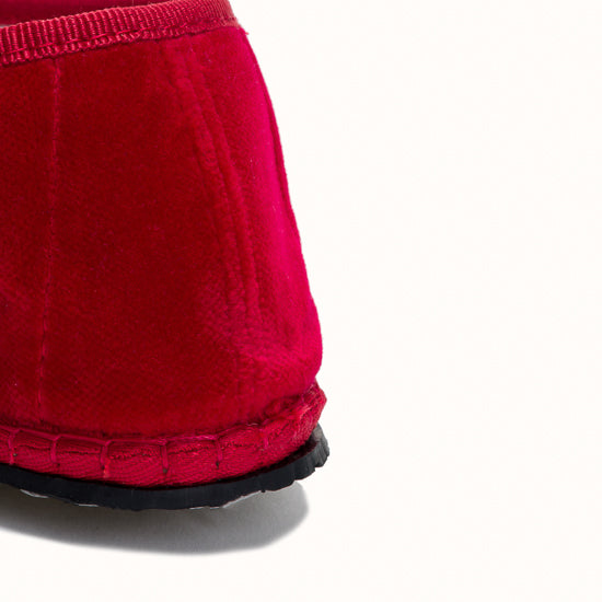 Friulane fabriquée selon la tradition Vénitienne en velours rouge et gros grain ton sur ton. La semelle extérieure est en pneu de vélo et la semelle intérieure en coton. Se porte aussi bien à l'intérieur qu'à l'extérieur !