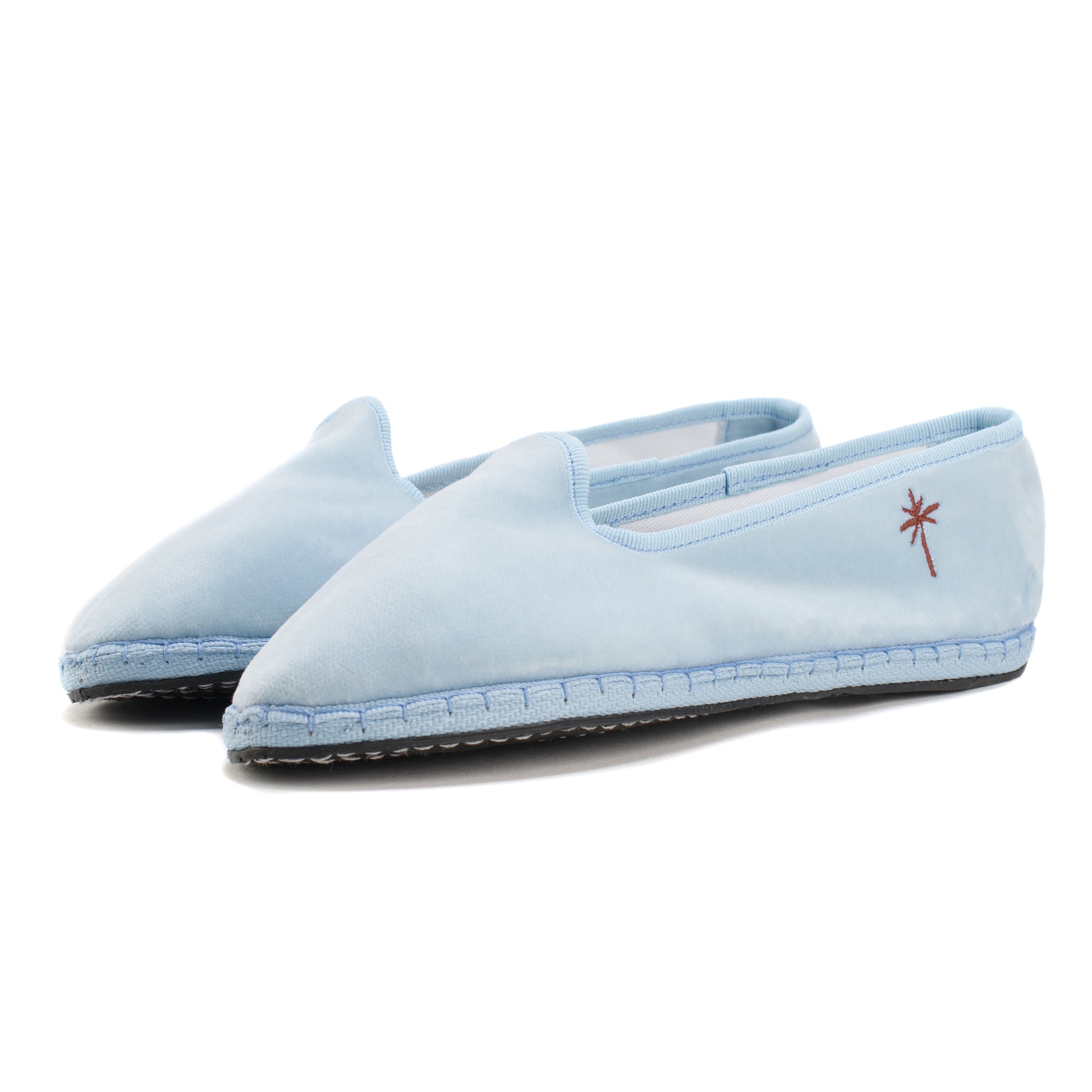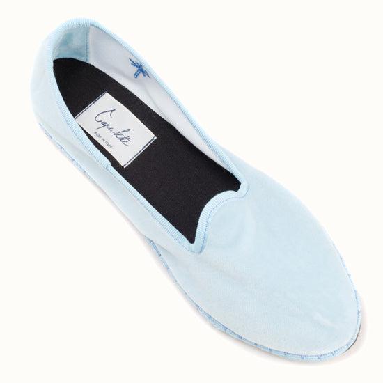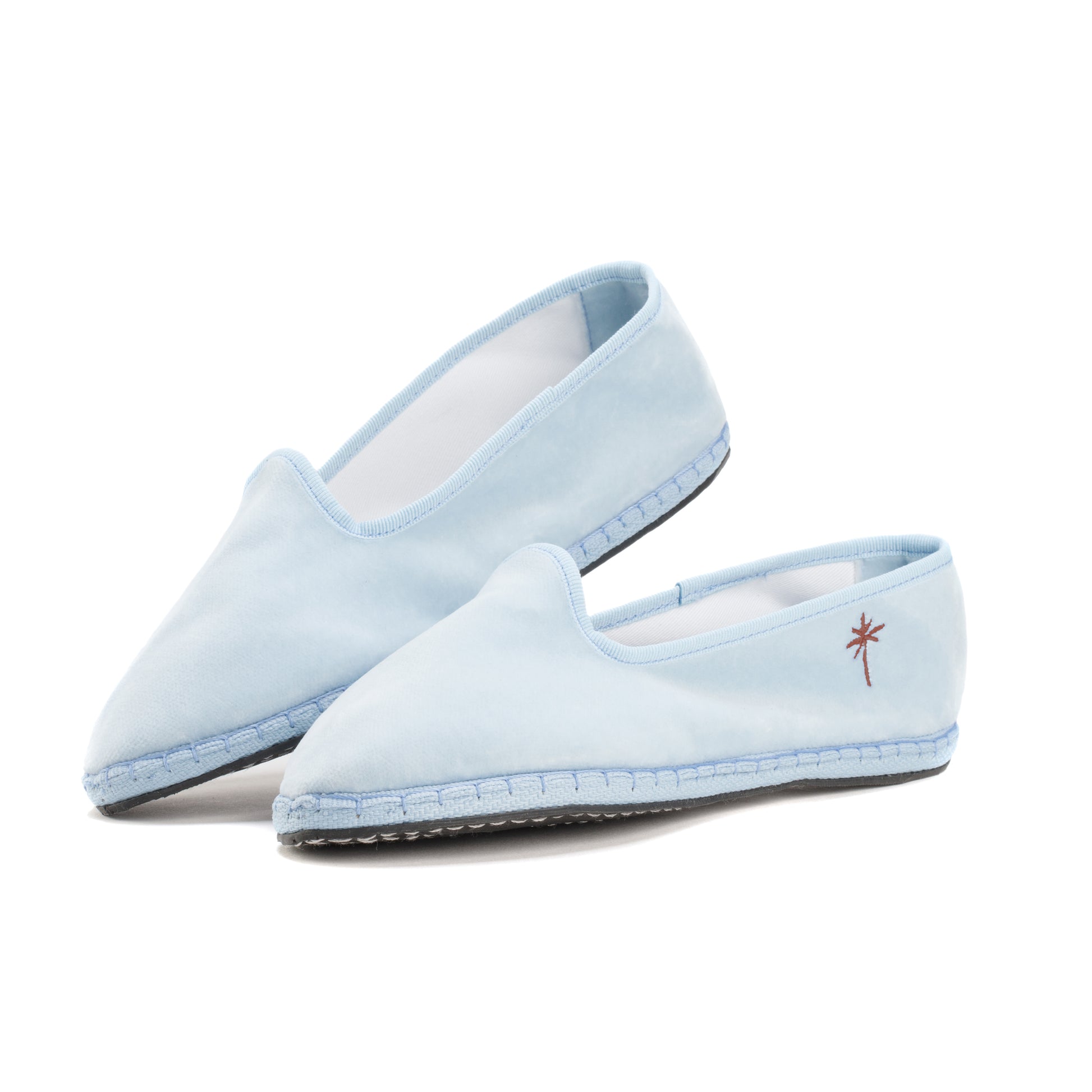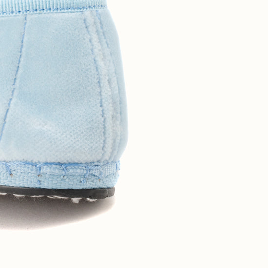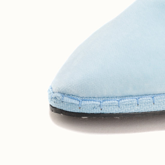 Friulane en velours bleu ciel et rebords en gros grain ton sur ton.