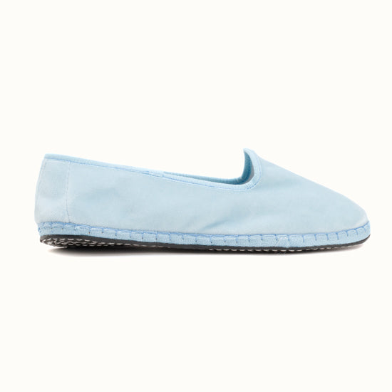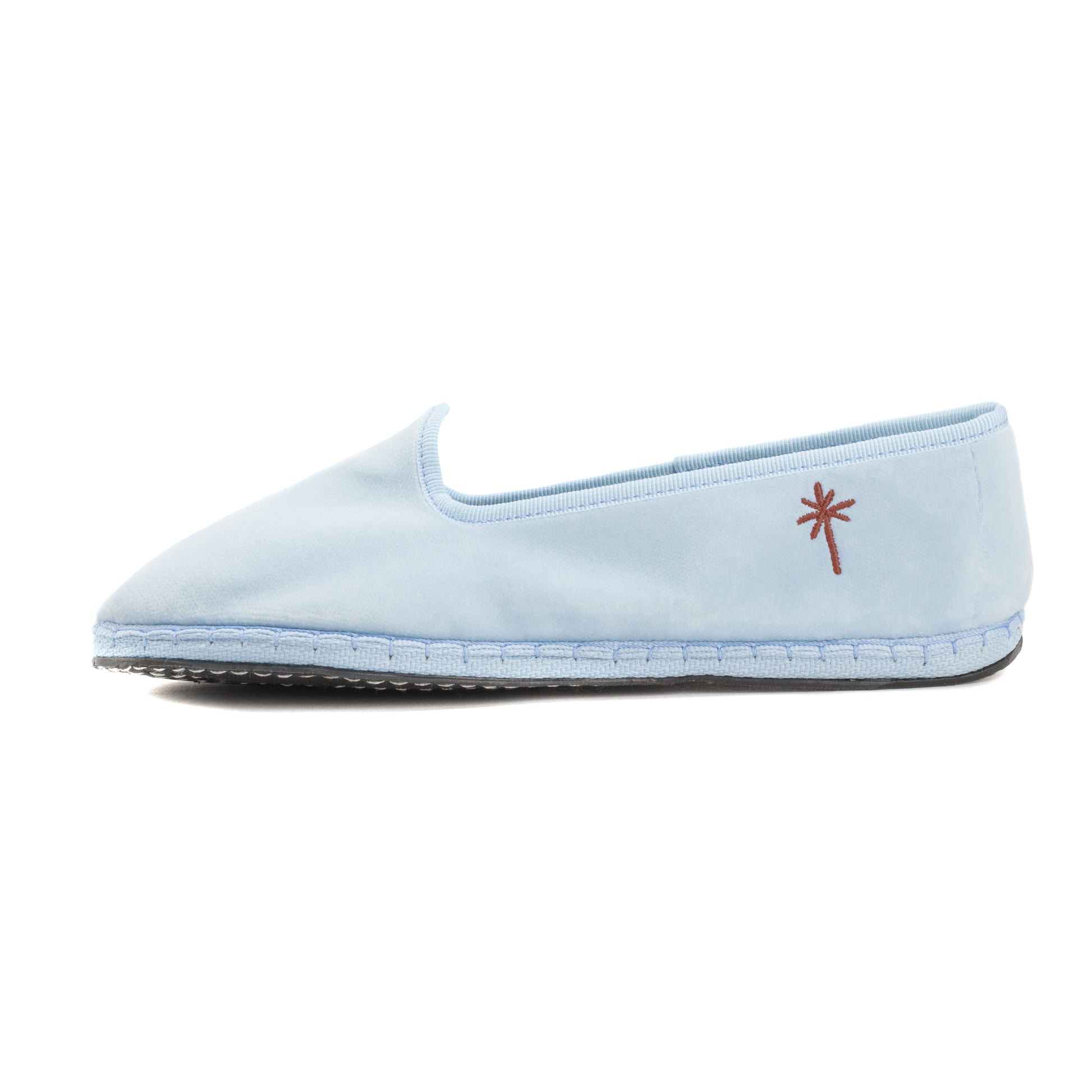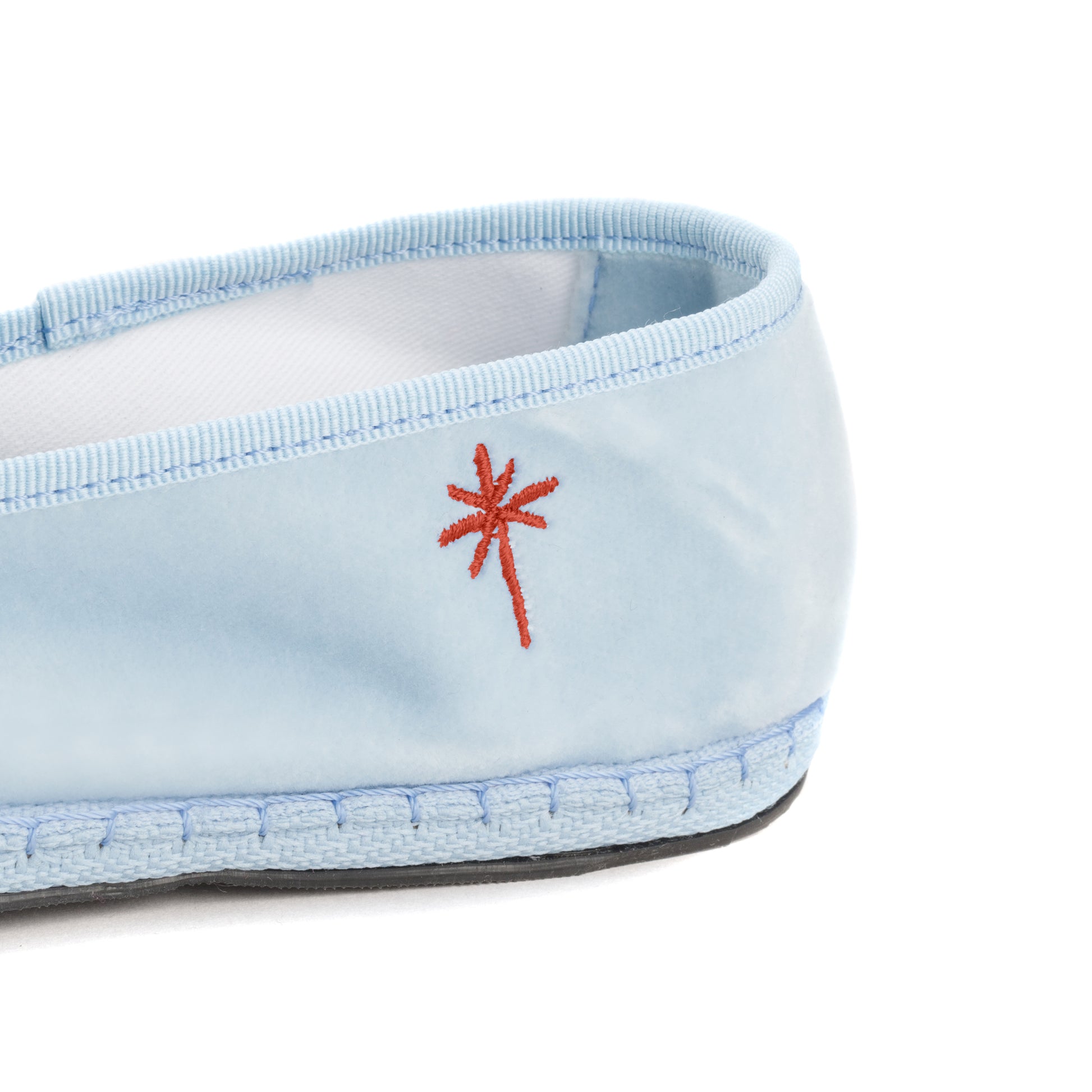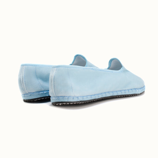 Friulane en velours bleu ciel et rebords en gros grain ton sur ton.