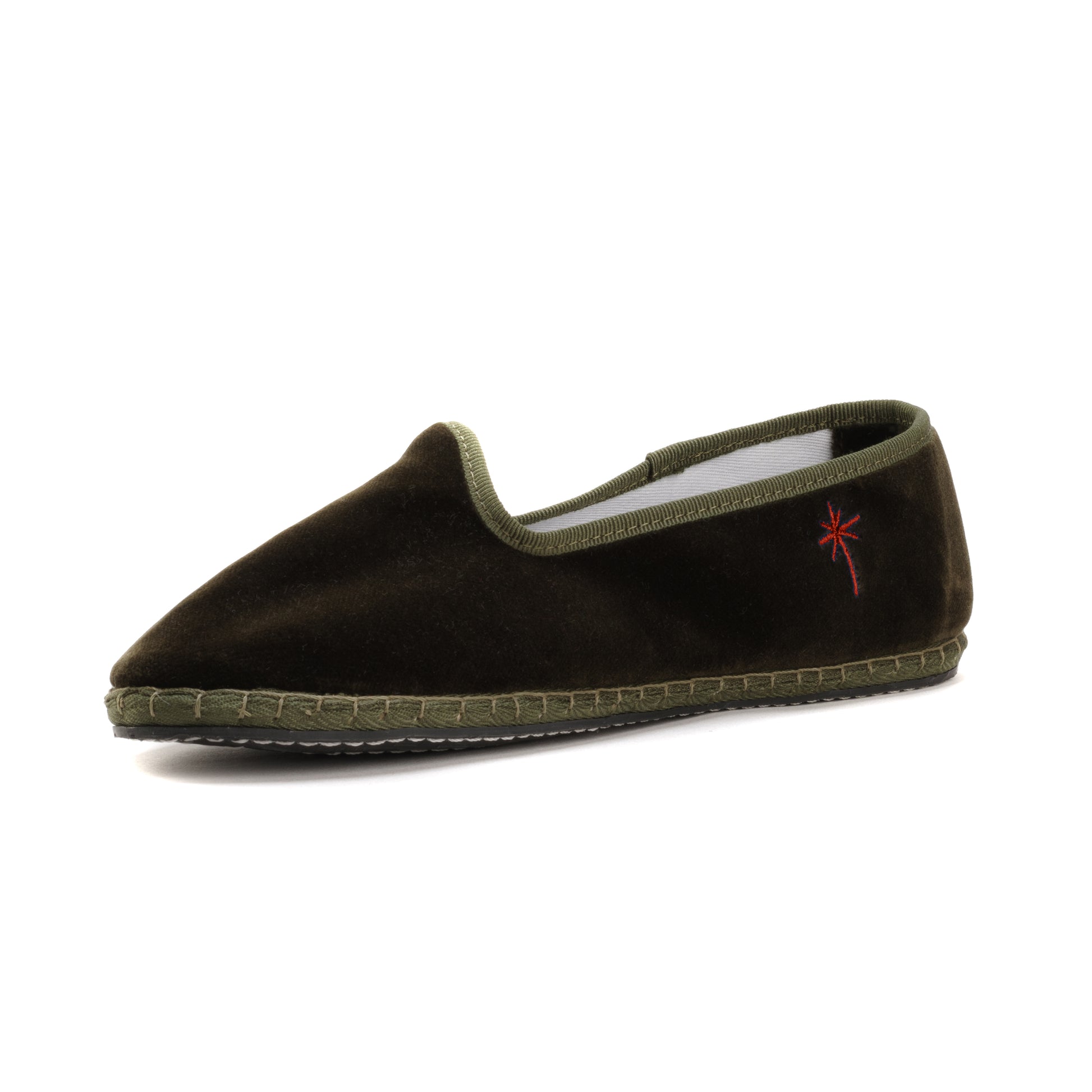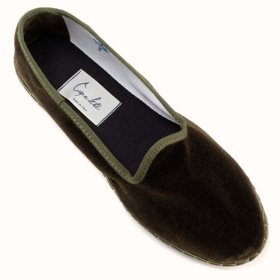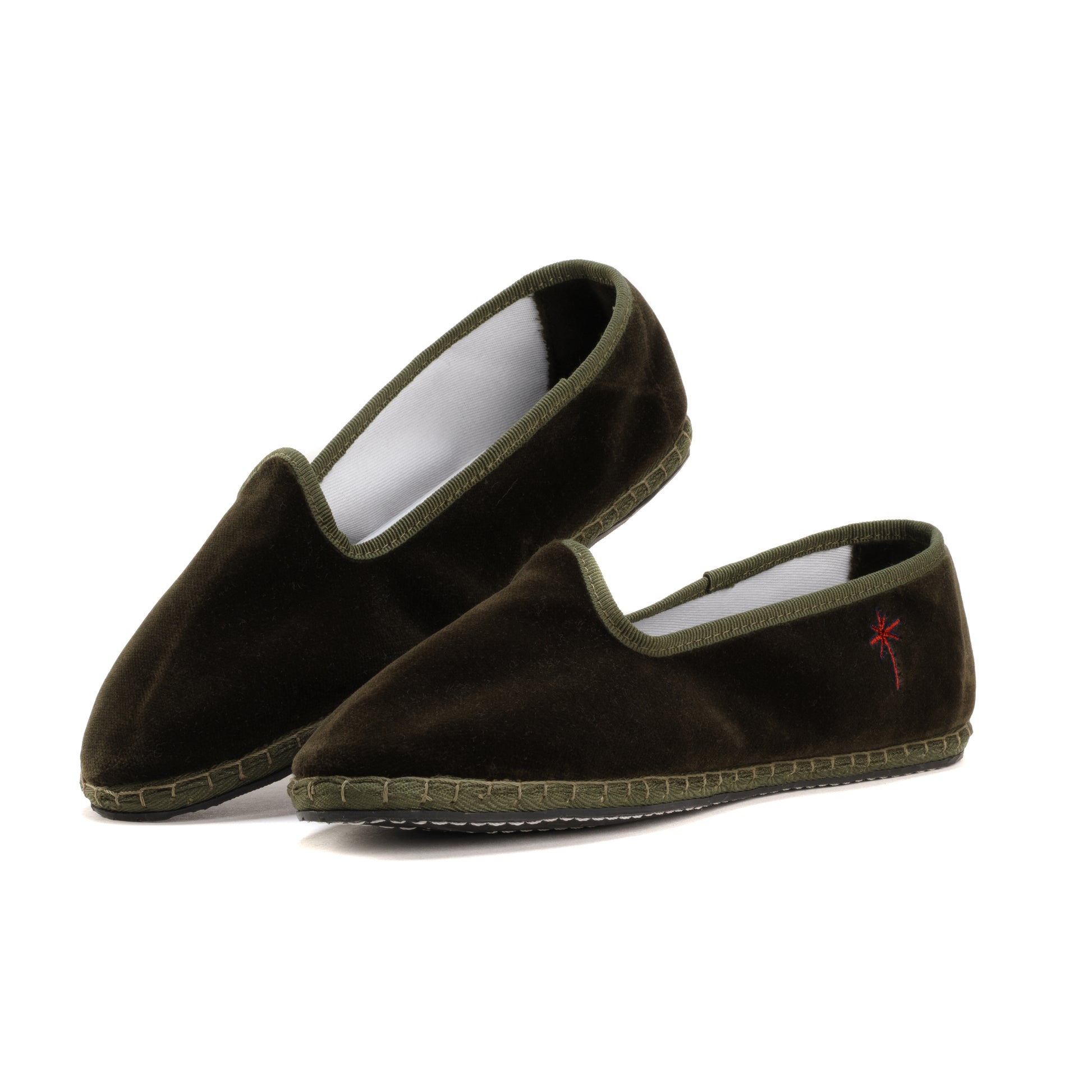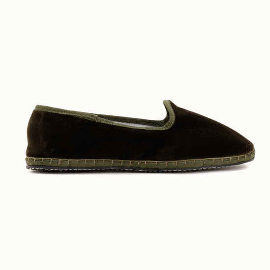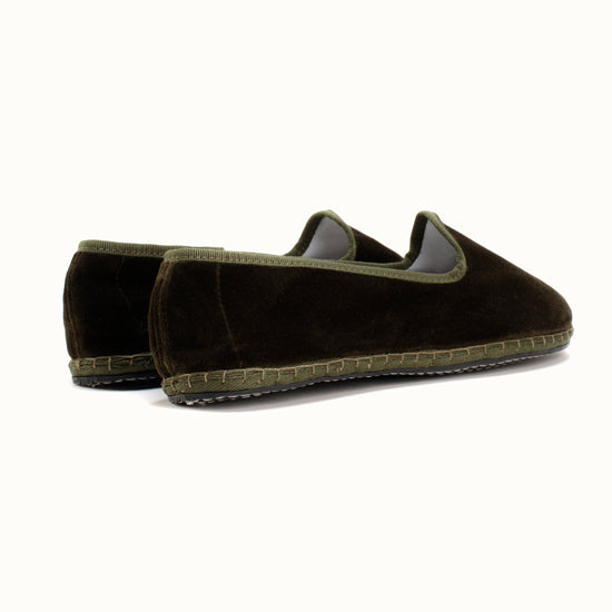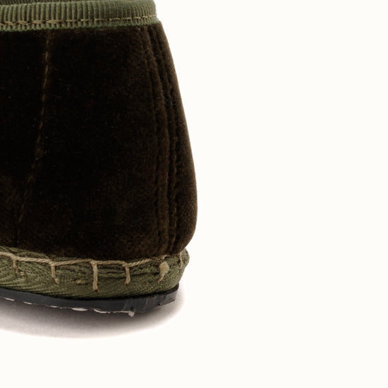 Friulane fabriquée selon la tradition Vénitienne en velours vert olive et gros grain ton sur ton. La semelle extérieure est en pneu de vélo et la semelle intérieure en coton. Se porte aussi bien à l'intérieur qu'à l'extérieur !