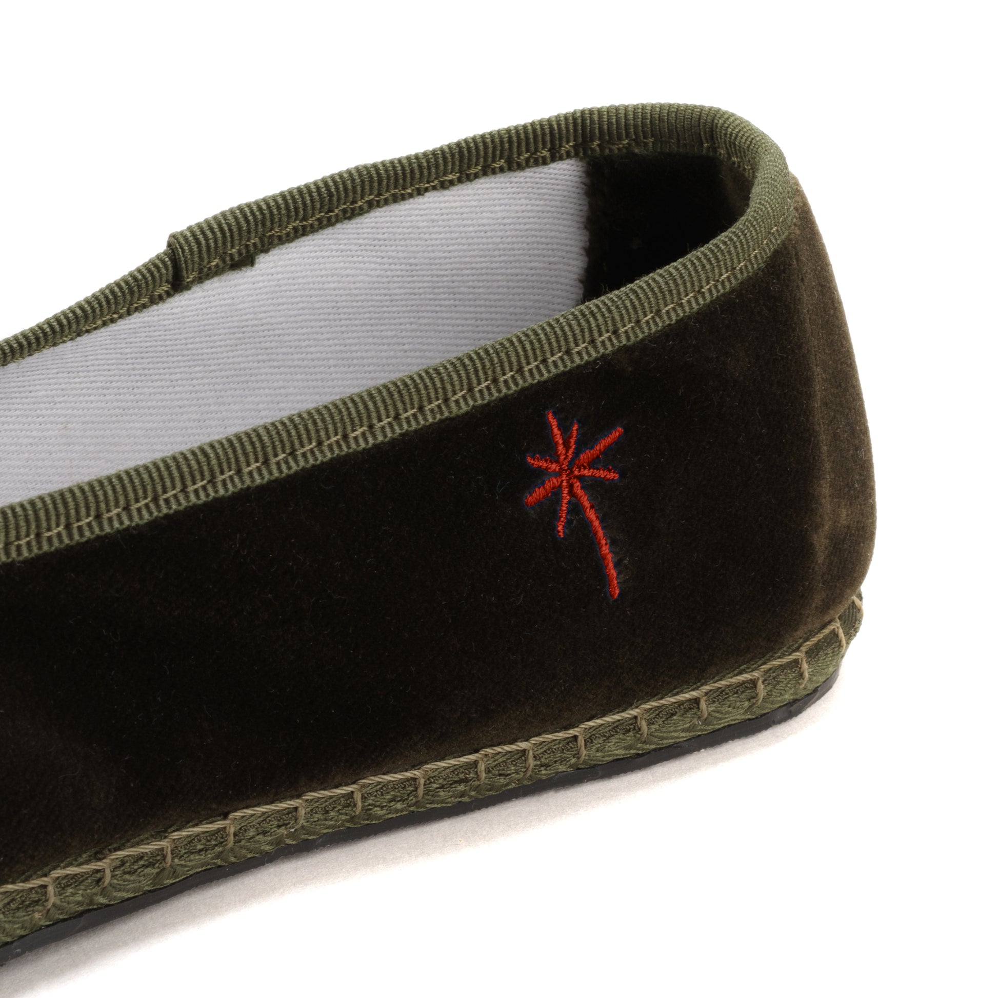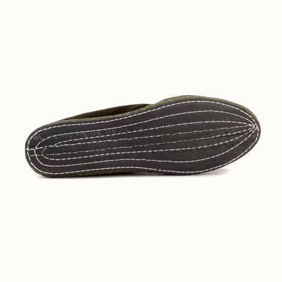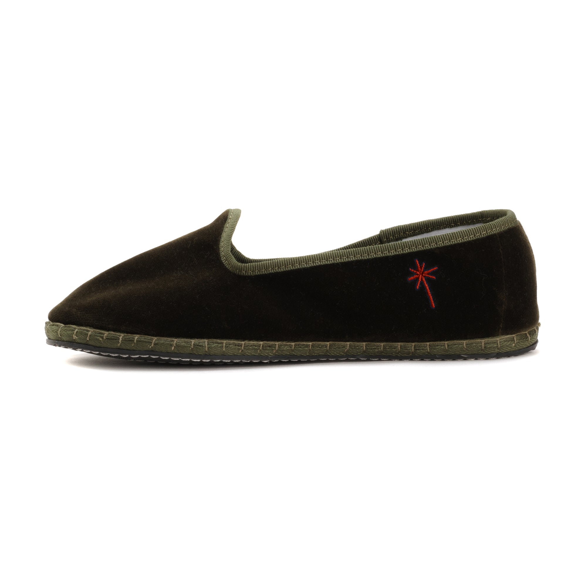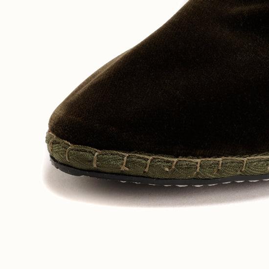 Friulane fabriquée selon la tradition Vénitienne en velours vert olive et gros grain ton sur ton. La semelle extérieure est en pneu de vélo et la semelle intérieure en coton. Se porte aussi bien à l'intérieur qu'à l'extérieur !