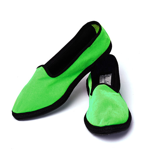 Fabriquées dans les traditions, en velours vert et gros grain noir. Des pneus de vélos recyclés sont utilisés pour les semelles pour pouvoir les porter intérieur comme extérieur.