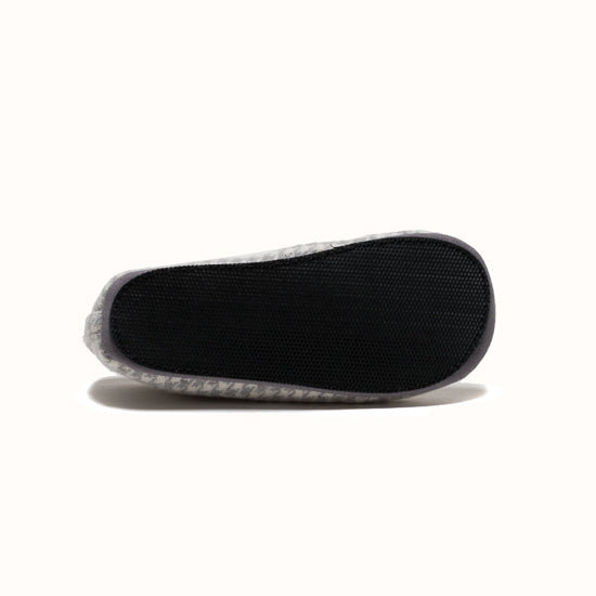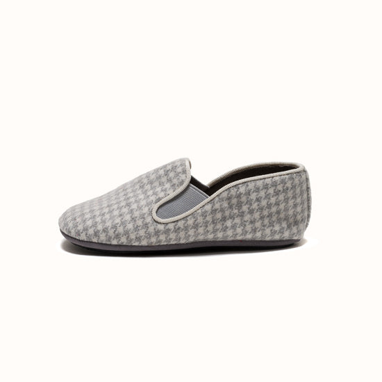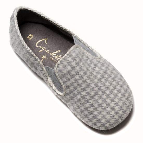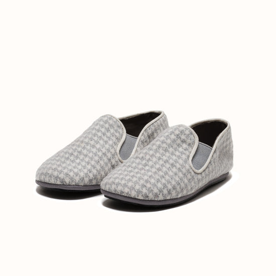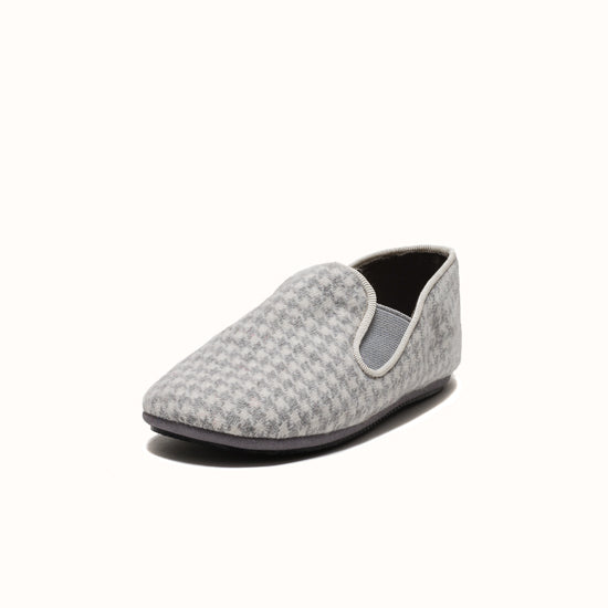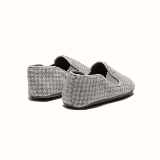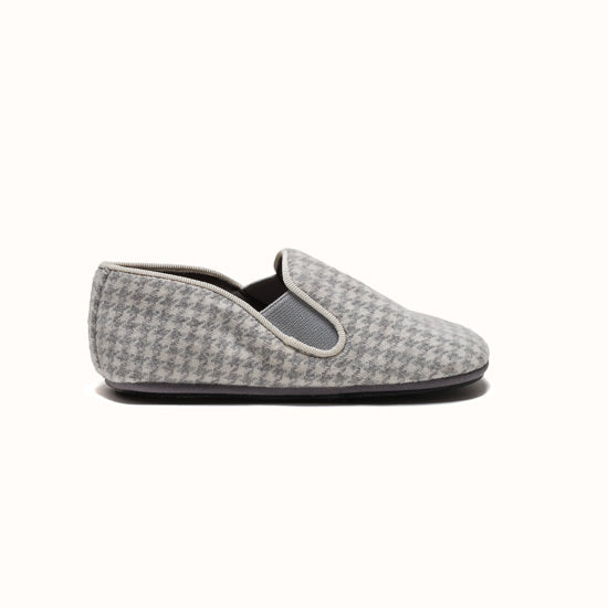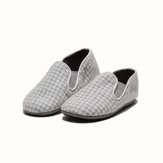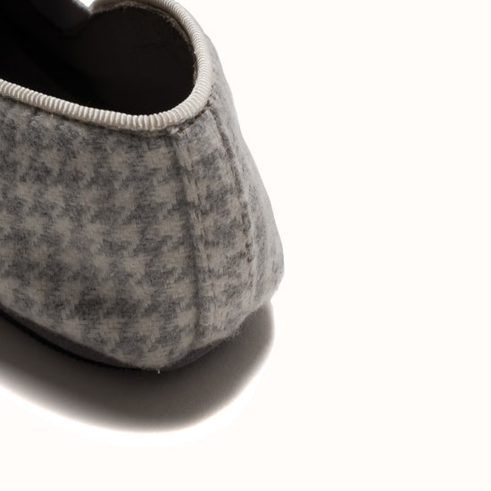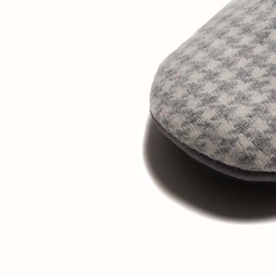 La Pantoufle est fabriquée en laine pied-de-poule grise - avec un gros-grain ton sur ton et des côtés élastiques pour le maintien. Semelle extérieure en gomme.