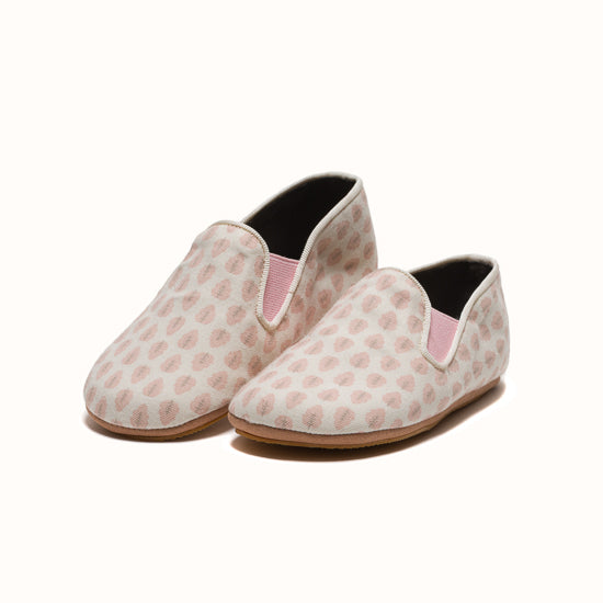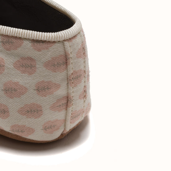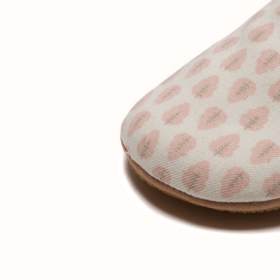 Pantoufles en coton blanc imprimé feuilles rose.