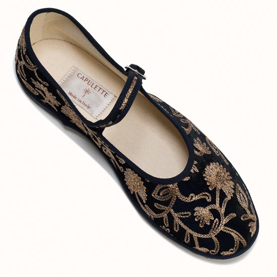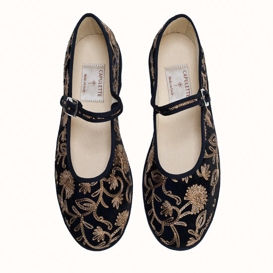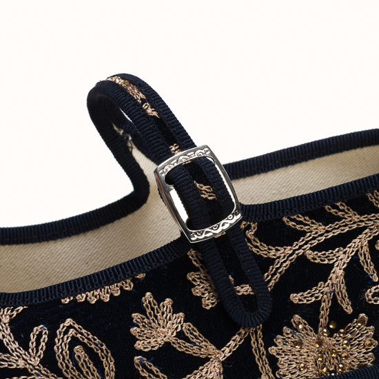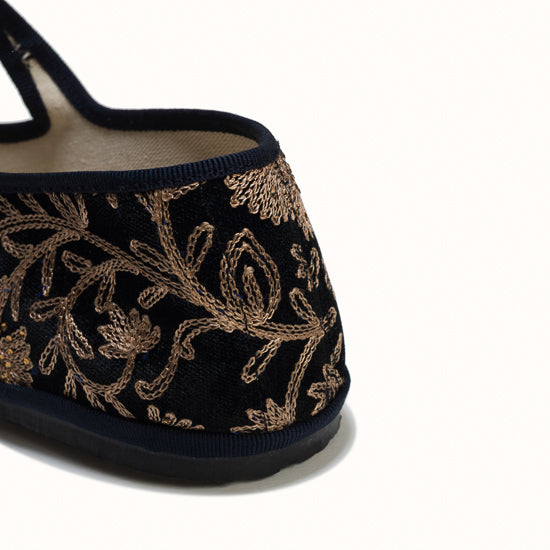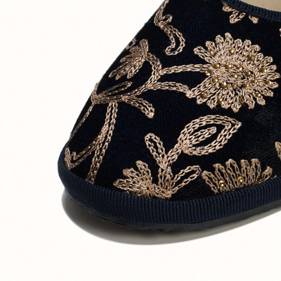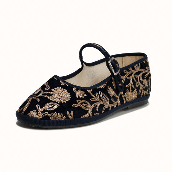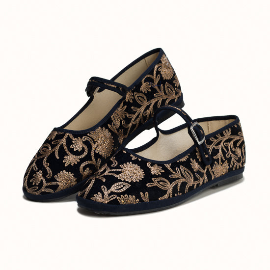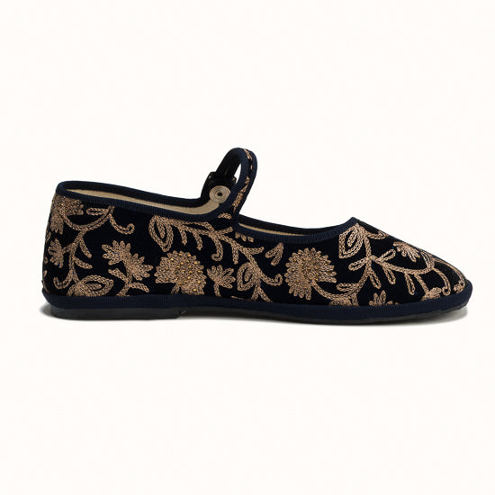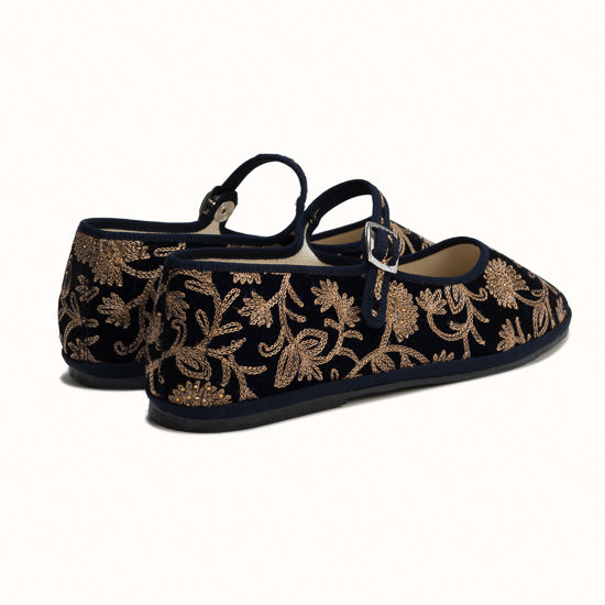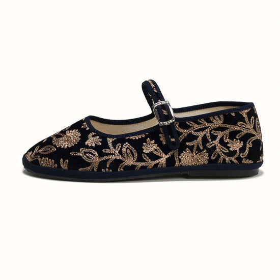Maryjane en velours brodé bleu marine.