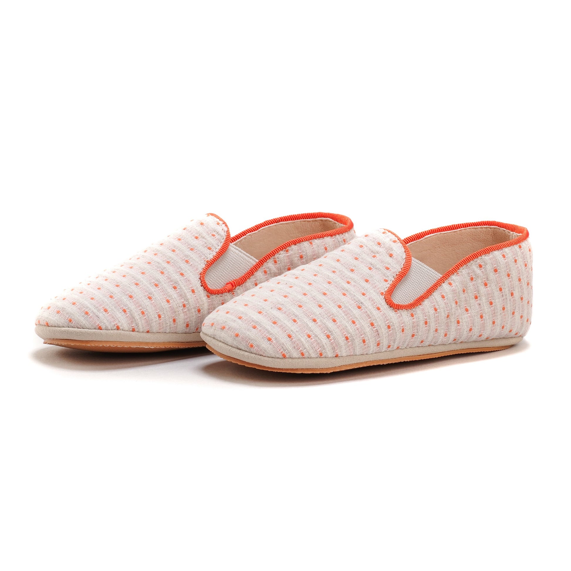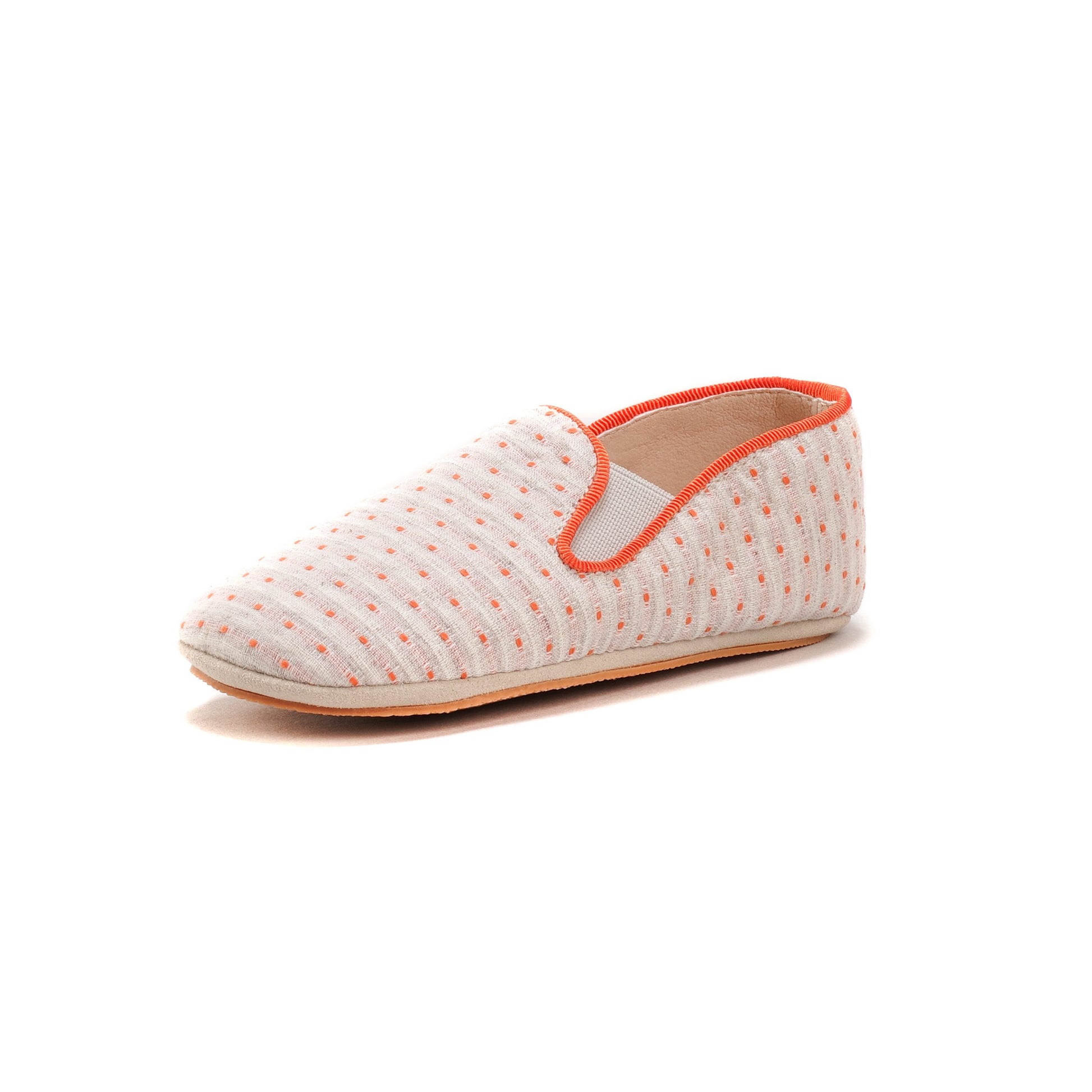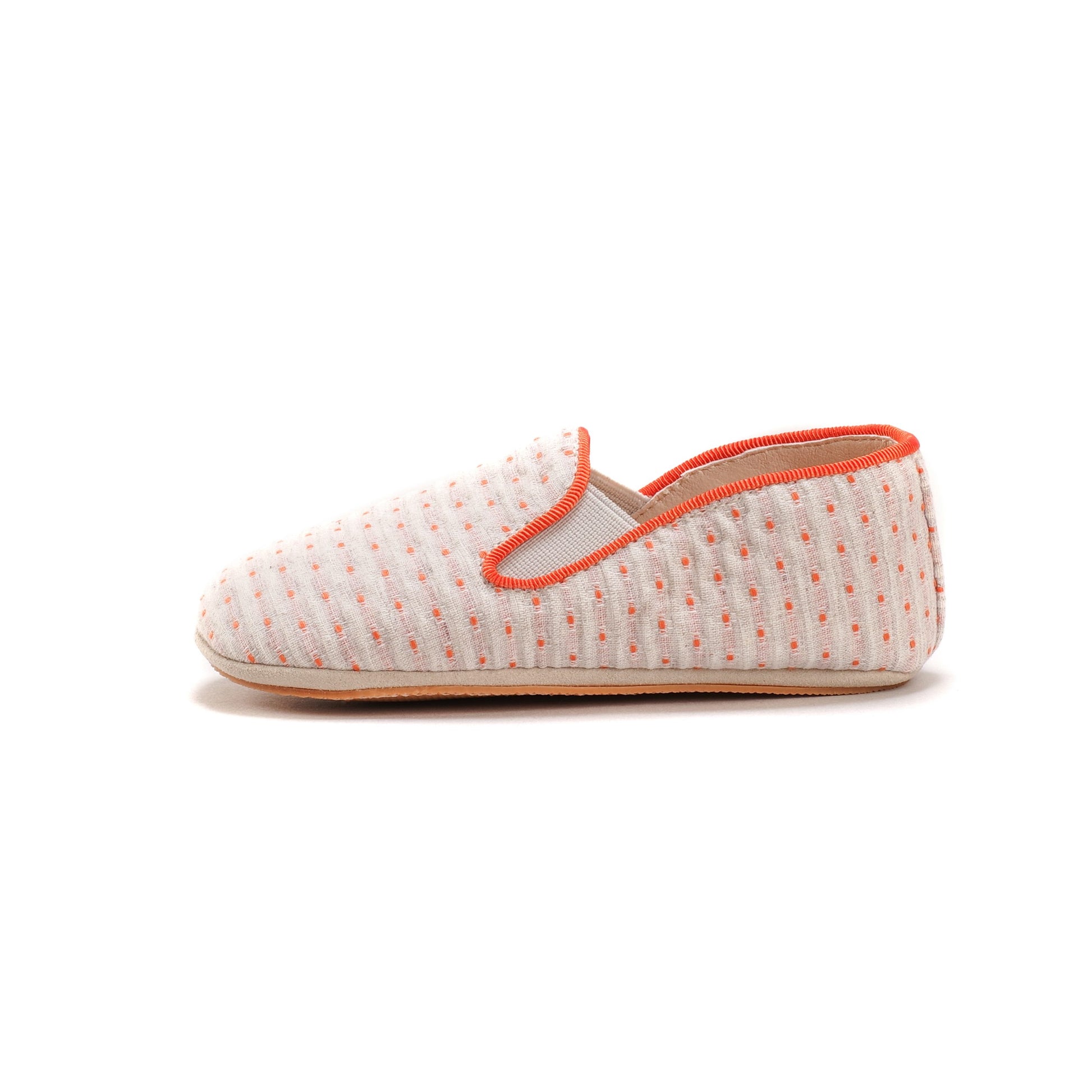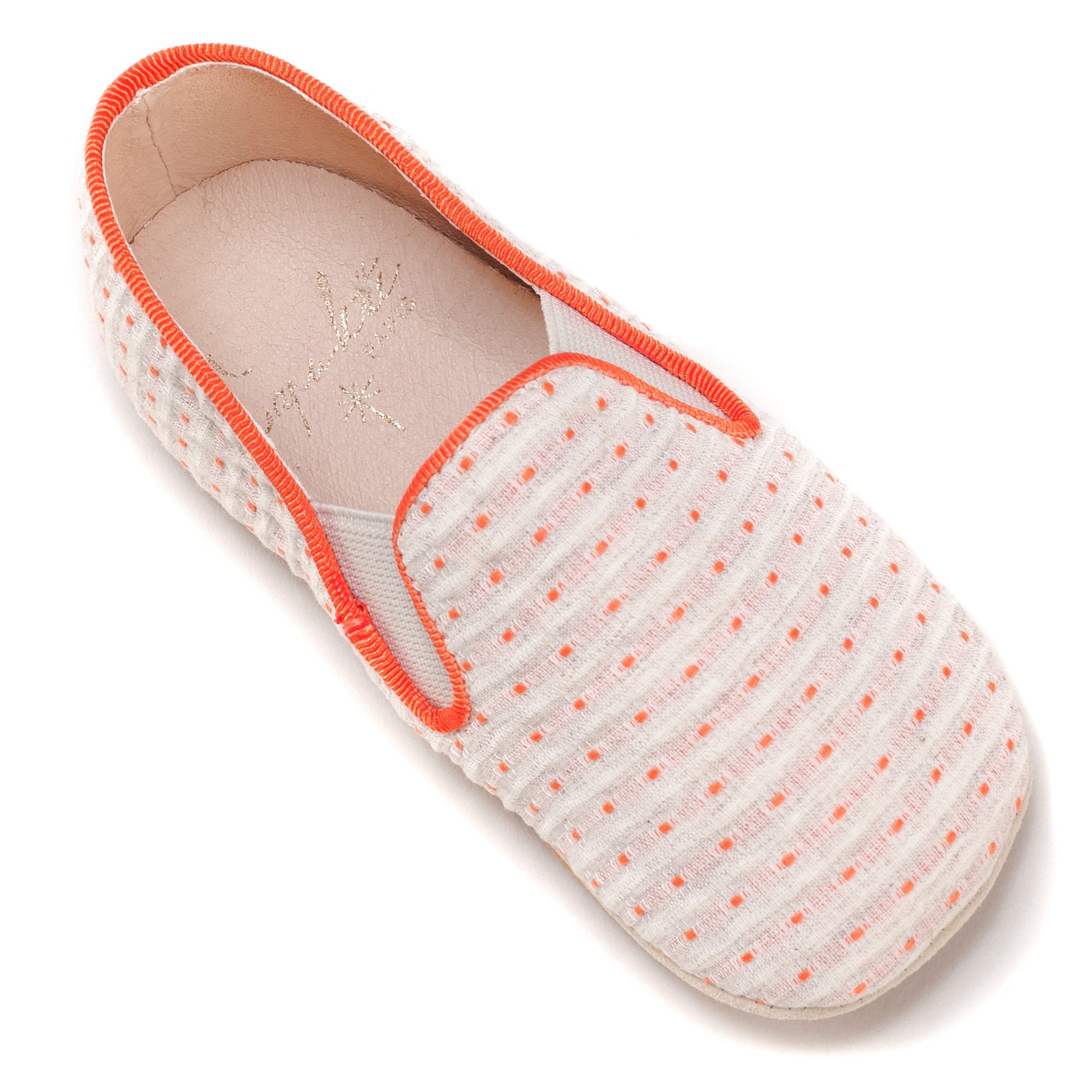 Fabriqué en tissu de coton ivoire avec des points brodés blancs et orange. Côtés élastiques en gros-grain ivoire et bleu pour le maintien. Semelle extérieure en caoutchouc et semelle intérieure en faux cuir blanc.