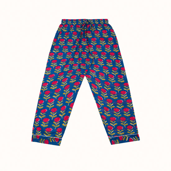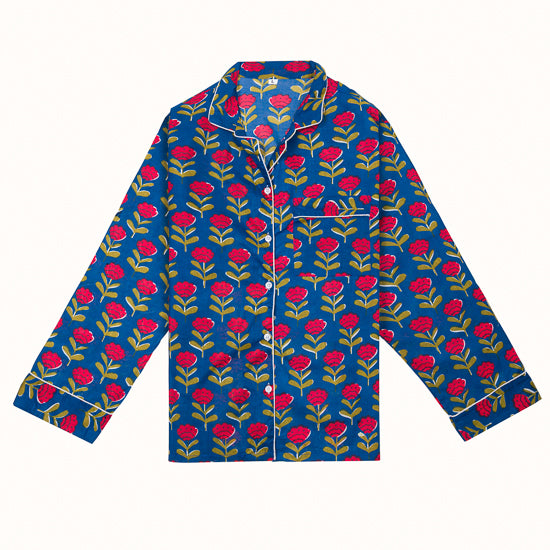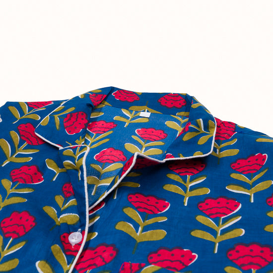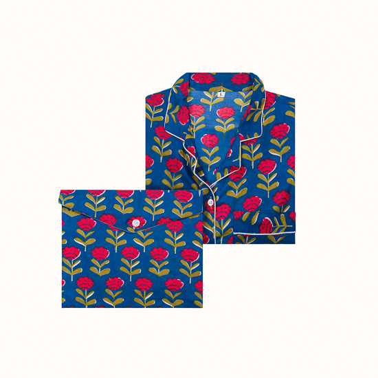 Pyjama en coton blockprint bleu nuit imprimé fleurs rouges.